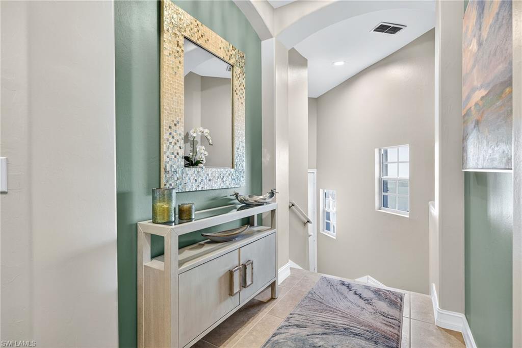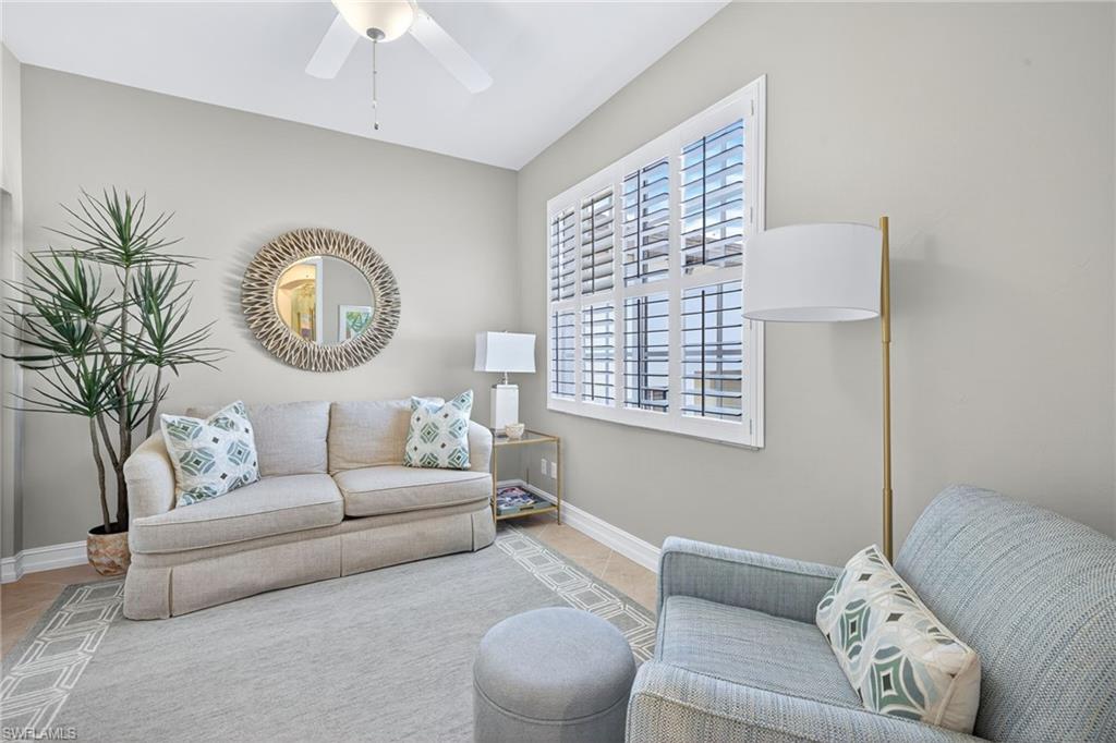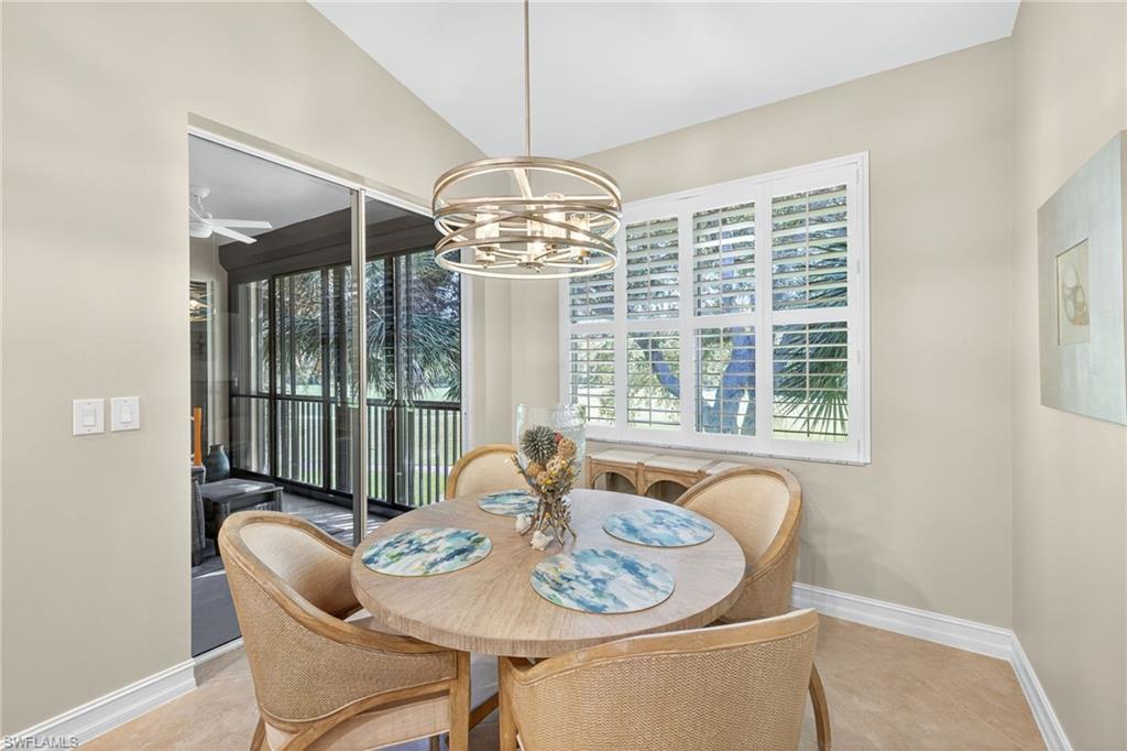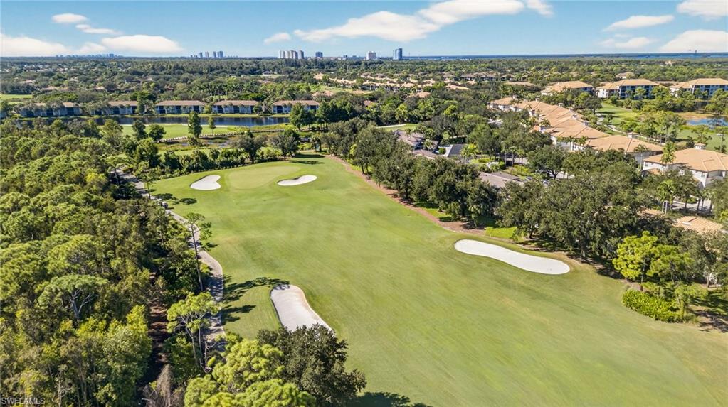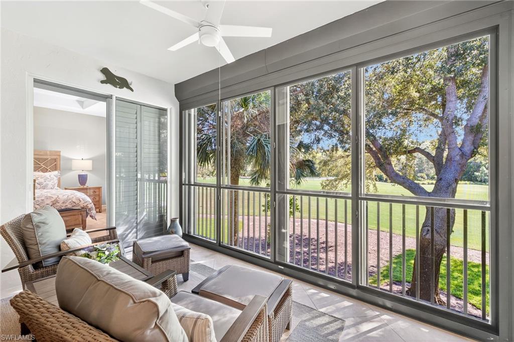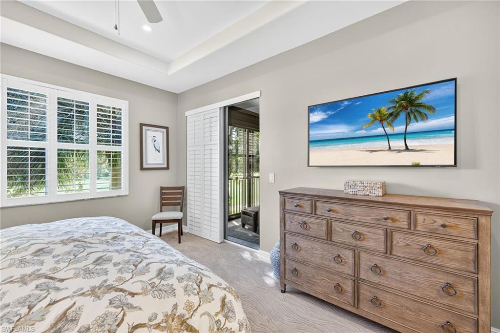 Move right into this immaculate second floor coach home in southwest Florida's premier bundled golf community, Pelican Sound. This home is furnished with coastal chic furniture, decor, and custom lighting, and offers a fairway view of the first hole on the Lakes course. The kitchen features updated counters, 42 inch cabinetry, glass backsplash, and pull out drawers. The serene primary suite offers a tray ceiling, lanai access, walk in closet, and updated bath with dual sinks, new tiled shower and seamless shower door. There is a pocket door to the hallway for the guest bedroom with adjacent guest bath offering fantastic privacy, and the third bedroom offers space saving pocket door, with a closet. This room is currently used as an office/den with a pull out couch. Other upgrades are plantation shutters throughout, large tile on the diagonal in living area, tiled lanai, newer washer and dryer with cabinetry in the laundry, new a/c in 2024, and electric hurricane shutter on lanai - making this home as functional as it is beautiful. Park your car or golf cart in the garage with epoxy floor! Brand New Roofs were just added to Edgewater II and New exterior lighting. Just move in and enjoy! If you are looking for an active lifestyle look no further: 27 holes of Championship golf, 14 pickleball, 8 tennis and 6 bocce courts. State of the art fitness center that is professionally staffed. Pelican Sound is nestled up to the Estero River with access to the Gulf. The community offers dry boat storage, kayaks, canoes and paddle boarding, along with a shuttle boat to Lovers Key State Beach Park. Minutes from RSW International airport and surrounded by fabulous shopping and restaurants. Start Living The Dream!