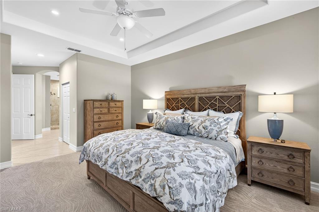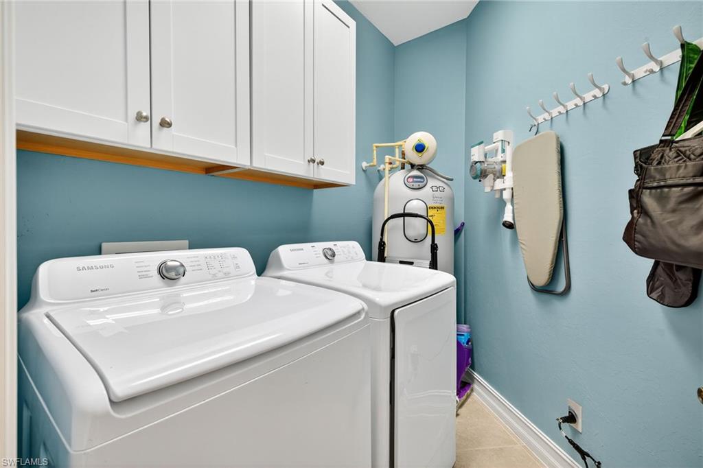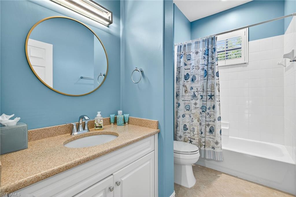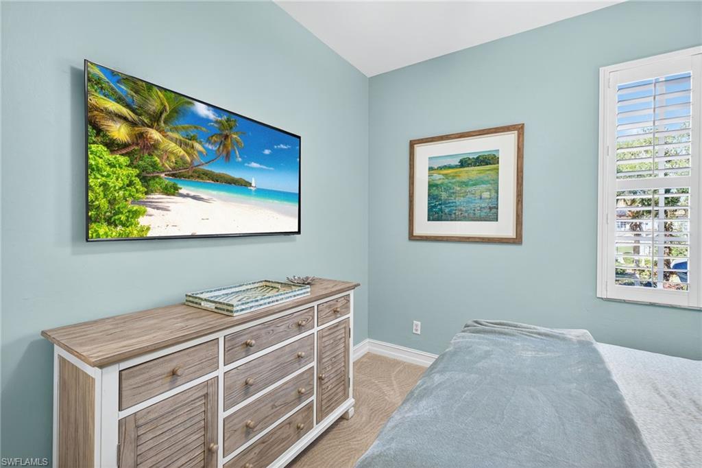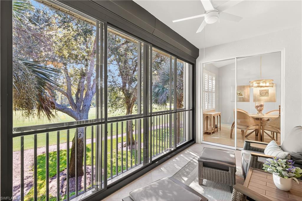 Move right into this immaculate second floor coach home in southwest Florida's premier bundled golf community, Pelican Sound. This home is furnished with coastal chic furniture, decor, and custom lighting, and offers a fairway view of the first hole on the Lakes course. The kitchen features updated counters, 42 inch cabinetry, glass backsplash, and pull out drawers. The serene primary suite offers a tray ceiling, lanai access, walk in closet, and updated bath with dual sinks, new tiled shower and seamless shower door. There is a pocket door to the hallway for the guest bedroom with adjacent guest bath offering fantastic privacy, and the third bedroom offers space saving pocket door, with a closet. This room is currently used as an office/den with a pull out couch. Other upgrades are plantation shutters throughout, large tile on the diagonal in living area, tiled lanai, newer washer and dryer with cabinetry in the laundry, new a/c in 2024, and electric hurricane shutter on lanai - making this home as functional as it is beautiful. Park your car or golf cart in the garage with epoxy floor! Brand New Roofs were just added to Edgewater II and New exterior lighting. Just move in and enjoy! If you are looking for an active lifestyle look no further: 27 holes of Championship golf, 14 pickleball, 8 tennis and 6 bocce courts. State of the art fitness center that is professionally staffed. Pelican Sound is nestled up to the Estero River with access to the Gulf. The community offers dry boat storage, kayaks, canoes and paddle boarding, along with a shuttle boat to Lovers Key State Beach Park. Minutes from RSW International airport and surrounded by fabulous shopping and restaurants. Start Living The Dream!