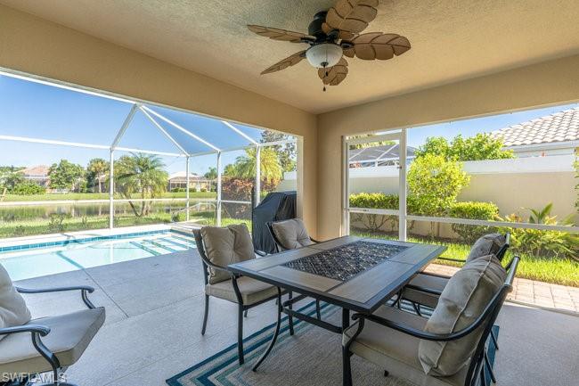 READY FOR NEW OWNERS!! This DiVosta built, poured concrete, two bedrooms with den/two bath attached Capri villa in the gated community of VeronaWalk is move in ready. Being offered furnished (tastefully decorated with newer furniture) makes settling in easy to start enjoying resort style living in south west Florida in time for the upcoming winter season. The home features an open concept with vaulted ceilings in the main living space with crown molding throughout. A split bedroom floorplan separates the bedrooms, each with their own walk-in closet and bath, offering the utmost in privacy when entering overnight guests. Wall colors as well as tile and bedroom carpet are neutral shades. Lighting has been updated with contemporary fixtures and fans. A centrally located kitchen is equipped with stainless appliances. The full laundry room with wash sink accesses your epoxy floor two-car garage. Stepping outdoors from a bank of sliding glass doors is a covered lanai with attached screen enclosure. Here you can enjoy your own pool that has been recently relined and retiled. A new pool pump has been installed. Your sloping lawn leads to a quiet waterway. Everything is ready to go in this delightful space located in East Naples.
