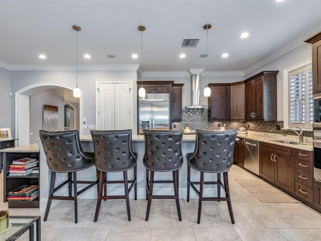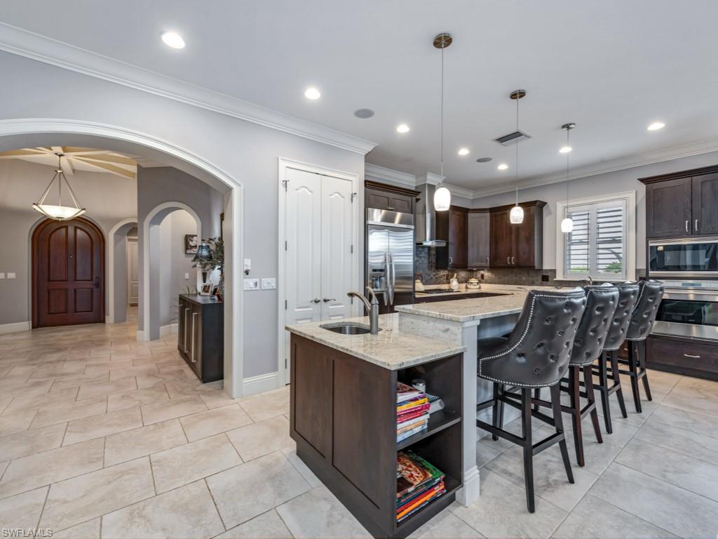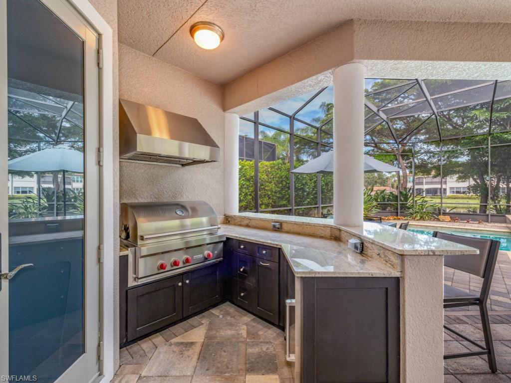 Experience elevated living in this exquisitely designed, great room-style detached villa, offering an ideal blend of sophistication and comfort. Thoughtfully crafted with four spacious bedrooms, plus a private den, this residence features dual guest suites with en-suite baths, for a total of four luxurious full bathrooms. Seamless indoor-outdoor living is made possible by pocketing sliding glass doors that open the expansive great room to an oversized screened and covered lanai—perfect for entertaining year-round. The resort-style outdoor retreat features a gourmet summer kitchen, dedicated pool bath, sparkling pool and spa, and a cozy fire pit, all overlooking serene lake views that elevate the ambiance. Built in 2013, this home stands out as one of the most modern and recently constructed properties in the neighborhood, combining timeless design with newer construction standards for peace of mind.