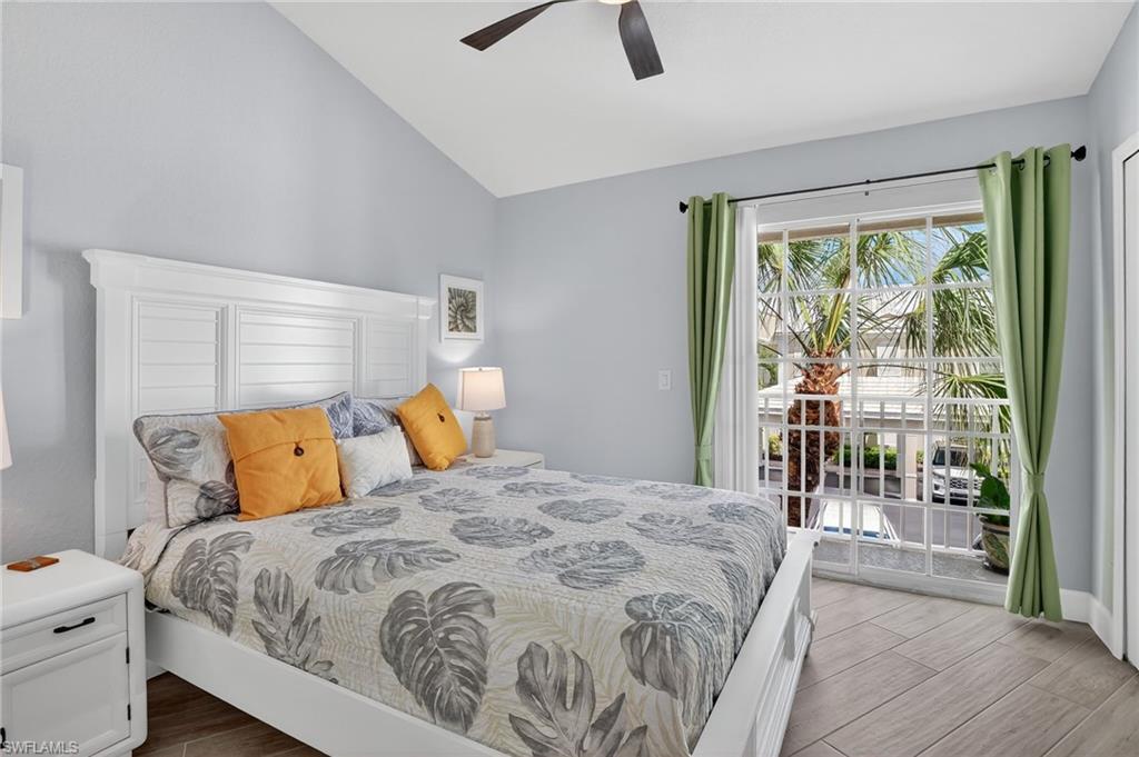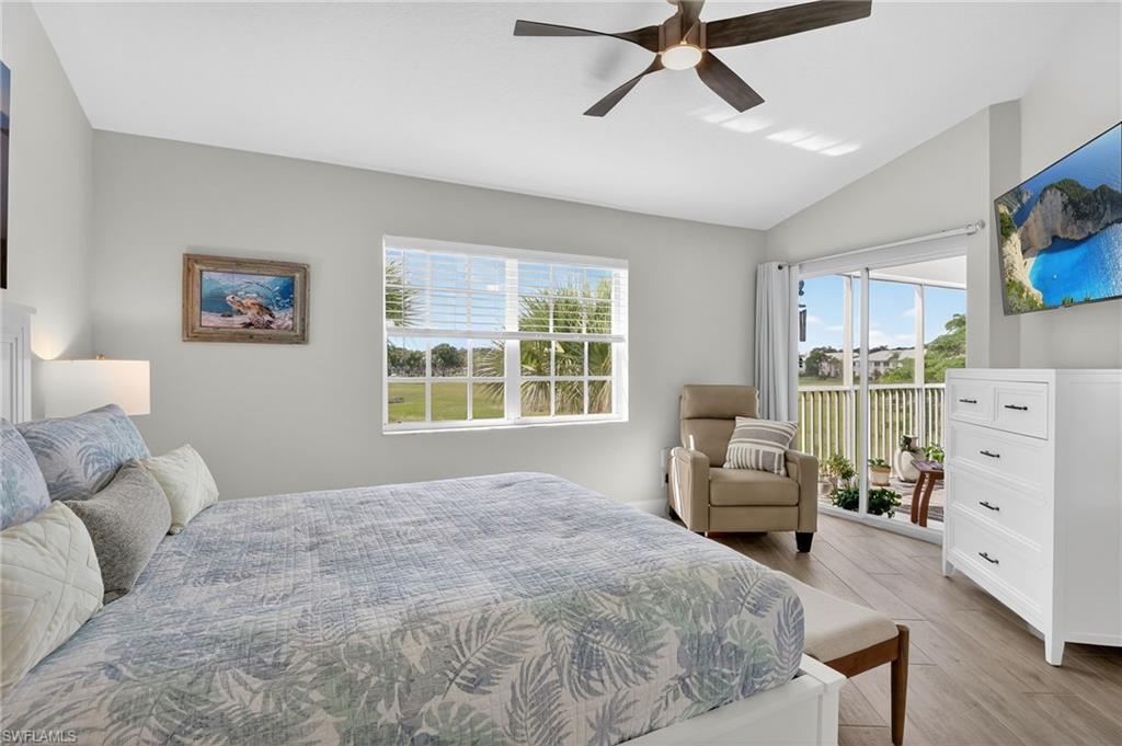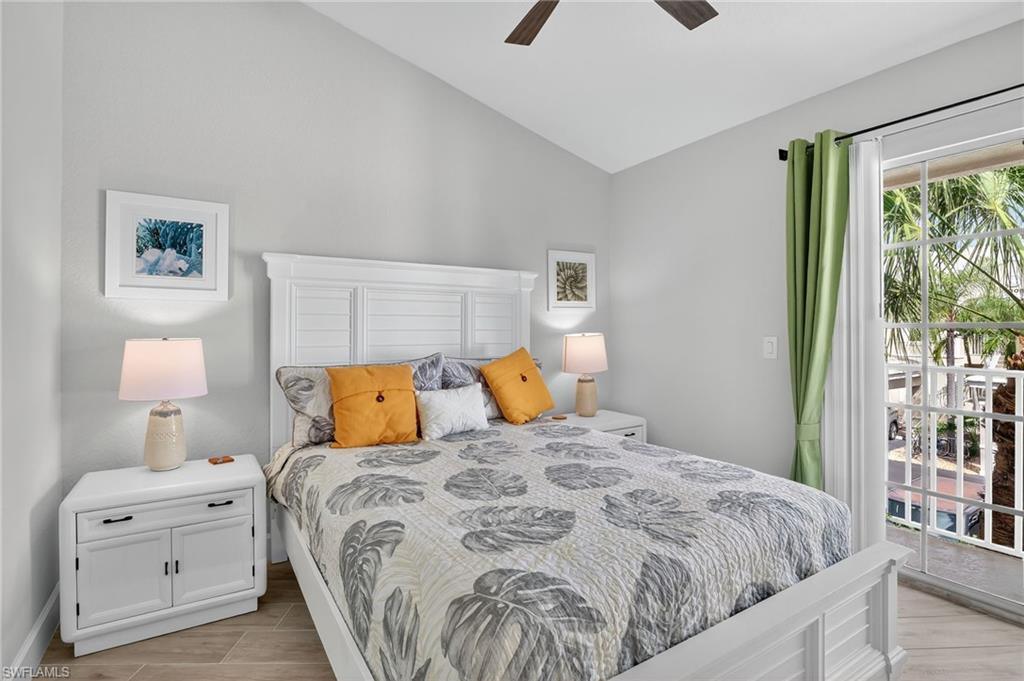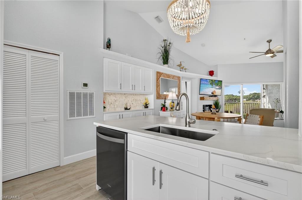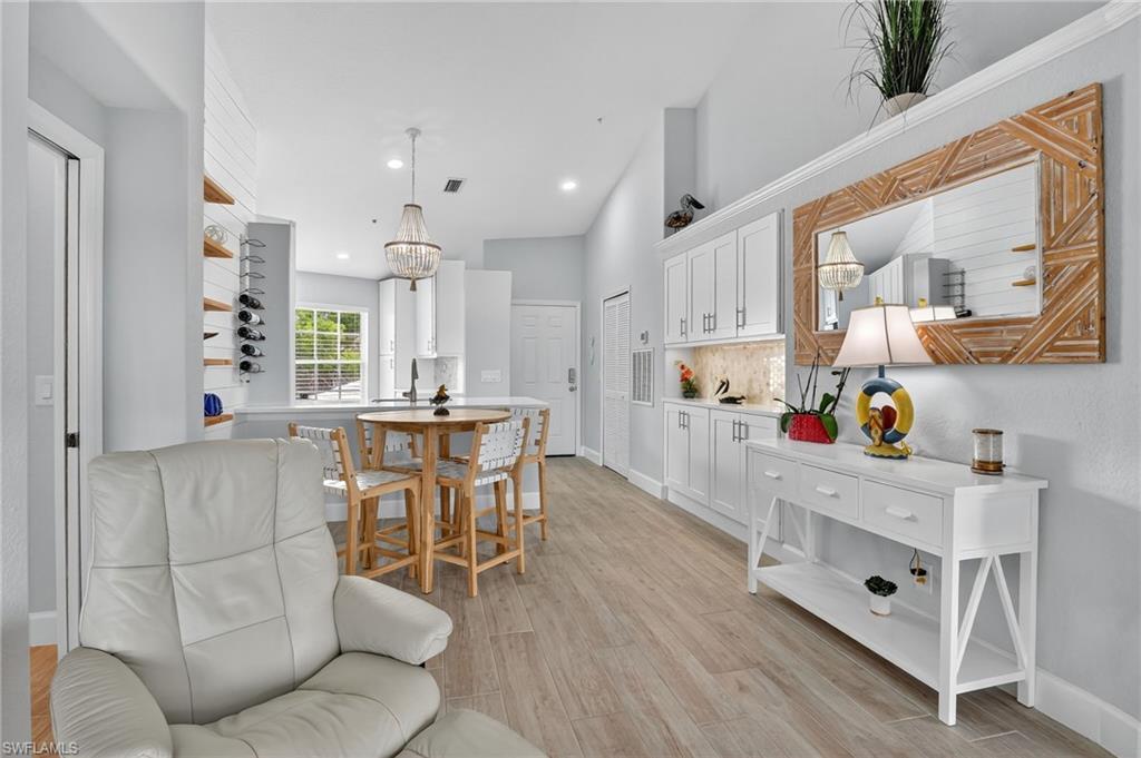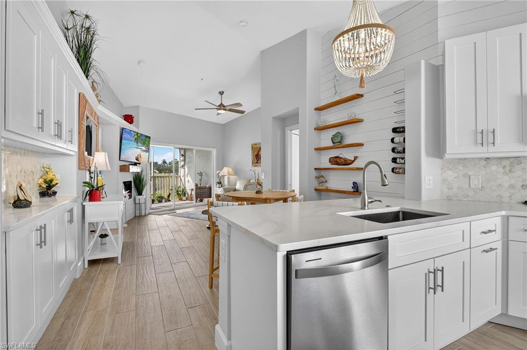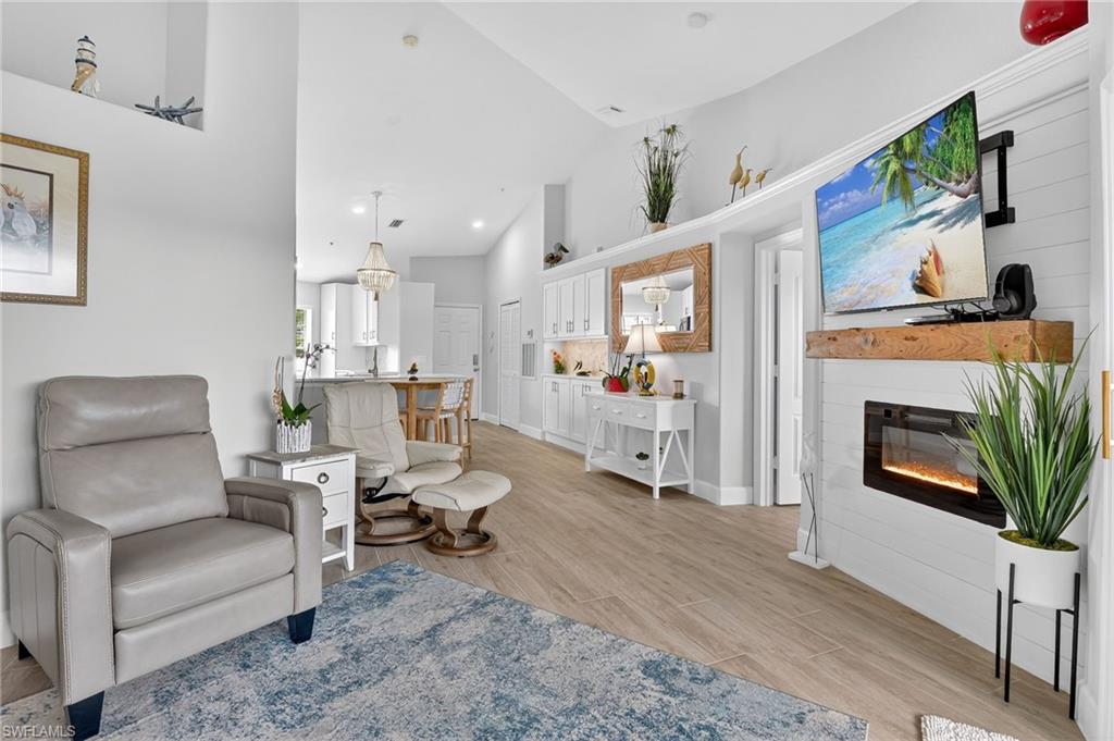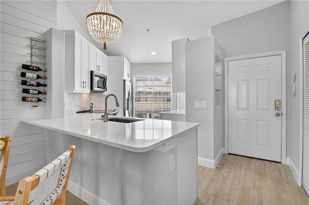 Envision yourself watching the grace of visiting egrets while enjoying your morning tea. Don’t miss this opportunity to own a stunning, move-in-ready condo in Sterling Oaks that truly shows like a model home! This beautifully remodeled 2/2 condo offers modern comfort and luxury in a highly desirable gated community in North Naples. The home features high-end finishes, thoughtful upgrades, and beautiful southwest views over the serene lake and natural preserves. Step inside to a light and bright interior showcasing vaulted ceilings and custom shiplap accent walls that add character and charm. The chef-inspired kitchen is a true highlight, featuring sleek quartz countertops, a beautiful tile backsplash, soft-close cabinets and drawers, a convenient breakfast bar, and top-of-the-line stainless steel appliances. The spacious living area is perfect for both relaxation and entertaining, highlighted by a modern, cozy electric fireplace and a custom wine rack. The split-bedroom floor plan ensures maximum privacy. The primary suite offers direct access to a private balcony and includes an ensuite bathroom complete with a walk-in shower. The second bedroom/bathroom combination provides comfortable accommodations for family or guests. Porcelain tile flooring runs throughout, enhancing its modern appeal. Enjoy calming lake views from your screened lanai—ideal for sunsets. Sterling Oaks is renowned for its very active tennis and pickleball community. Conveniently located within walking distance, residents enjoy access to a Jr. Olympic, saltwater pool, spa, clubhouse, fitness center, tennis courts, pickleball, bocce, and a tiki bar. Located just minutes from Naples' pristine beaches, upscale dining, premier shopping, and lively entertainment options, this beautiful condo offers an unbeatable lifestyle in one of Naples' most sought-after communities. This property represents a great opportunity for both rental income potential and personal use as a vacation home.