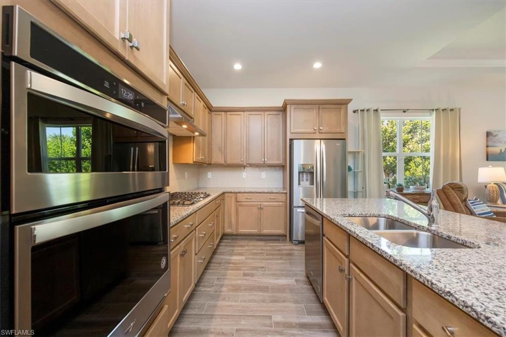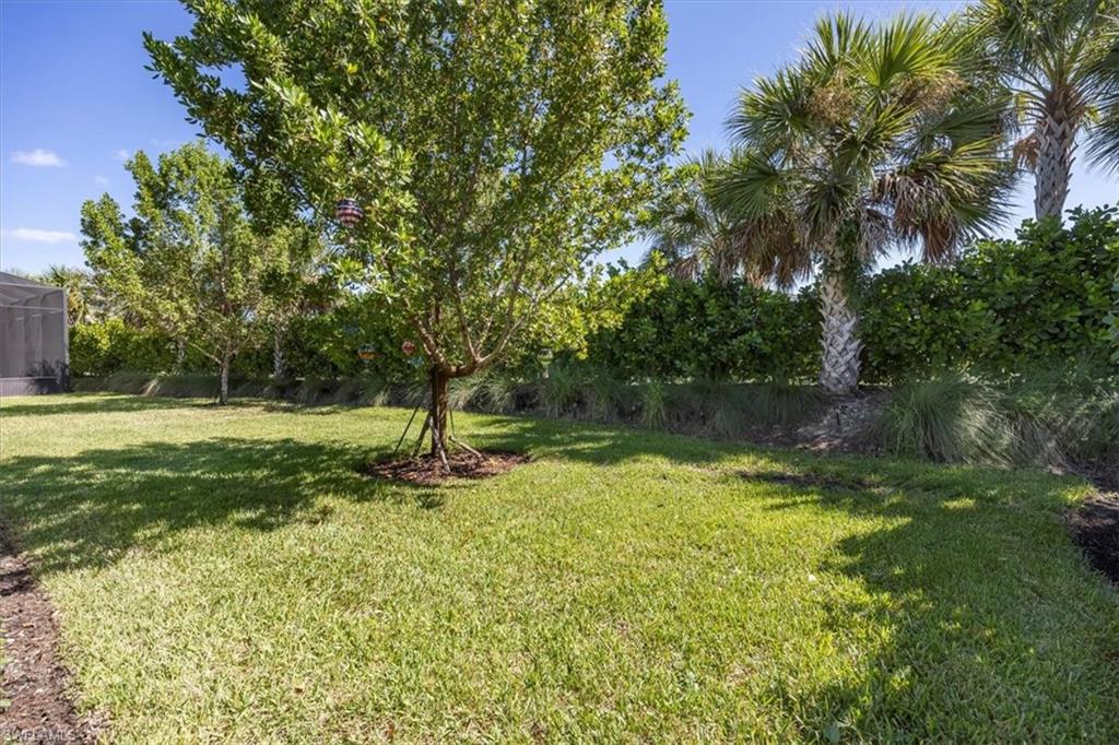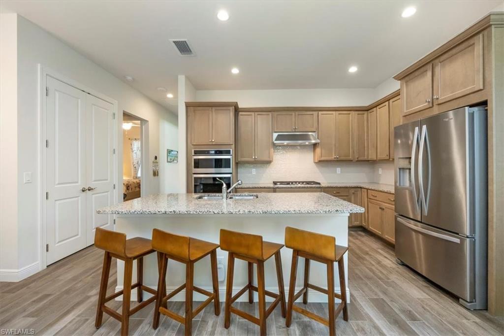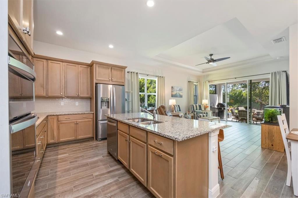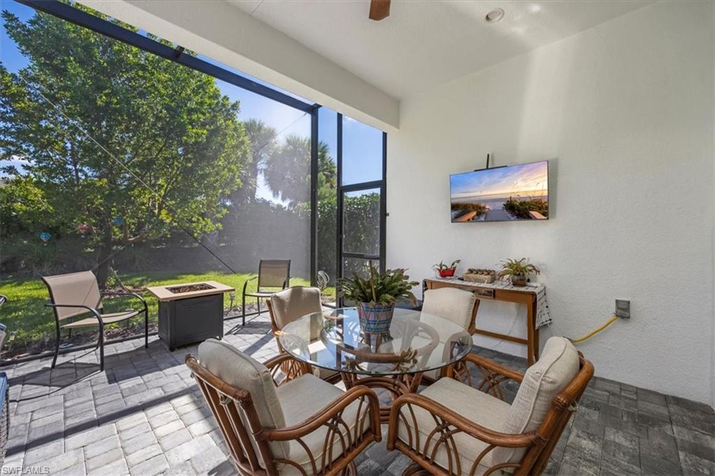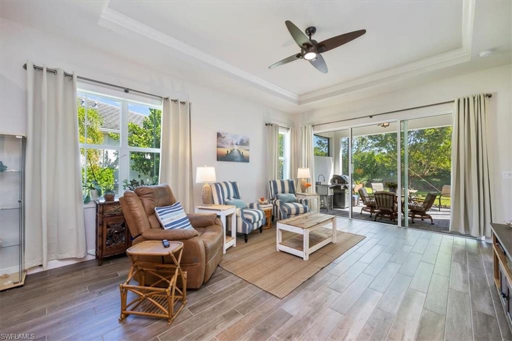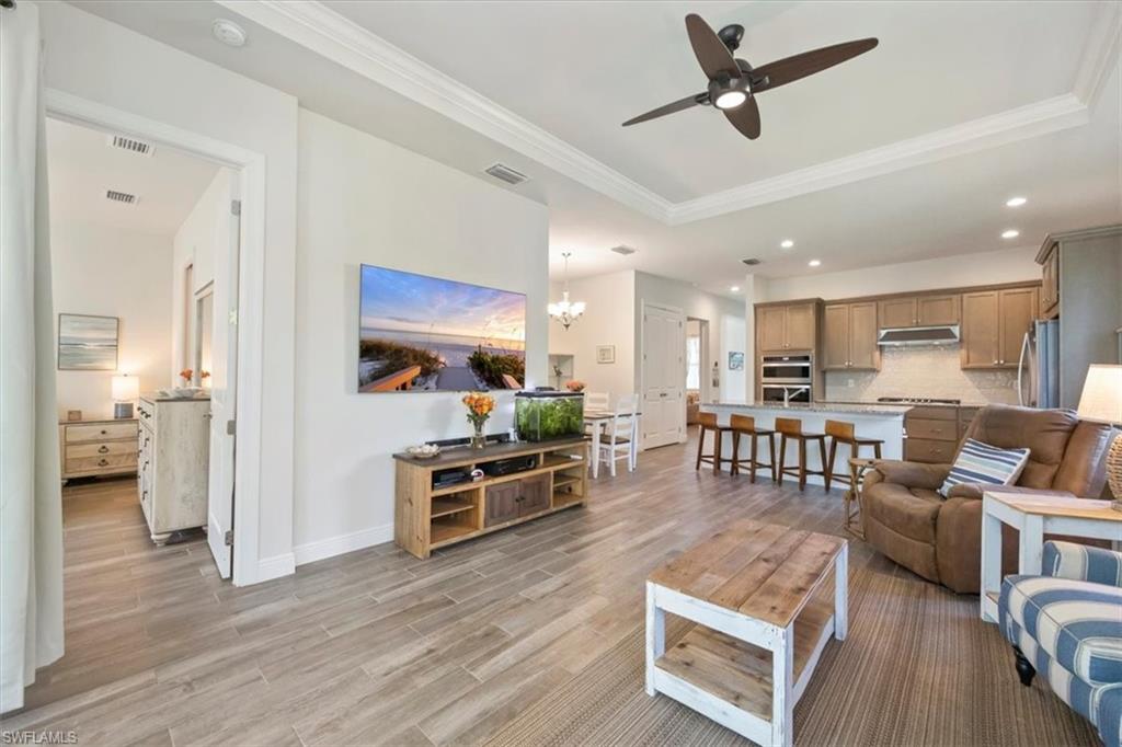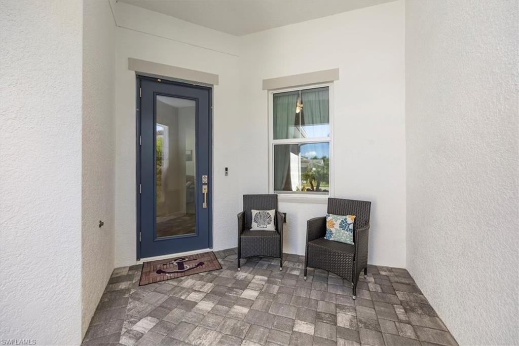 Welcome to 9016 Saint Lucia Drive in Azure at Hacienda Lakes—Naples, Florida, a premier gated community offering coastal-inspired living. This beautifully designed and furnished Baypointe Villa features 1,569 square feet of thoughtfully planned living space with 2 bedrooms, 2 bathrooms, a versatile den (ideal as a home office or optional third bedroom), and a spacious 2-car garage complete with built-in storage racks, cabinets, and a handy workbench for all your projects. Step inside and you’ll find 10-foot ceilings, wide wood-look tile flooring throughout, and elegant coffered ceilings in the foyer and great room. The open concept layout showcases a gourmet kitchen with gas cooking, stainless steel appliances, granite countertops, tile backsplash, breakfast bar and pantry. The kitchen flows seamlessly into the dining area and expansive great room—ideal for both everyday living and entertaining. The owner’s suite offers a bathroom featuring a dual-sink granite vanity, walk-in shower and spacious walk-in closet. The guest bedroom, located near a full bathroom, provides comfort and privacy for visitors. Additional upgrades include smart home technology, recessed lighting, ceiling fans, upgraded wood shelving in all closets, tankless water heater, hurricane impact front window and door, HVAC UV light for clean air, and a laundry room with tub sink. Outdoor living is equally impressive. Enjoy a private backyard with a covered lanai, extended brick pavers, open-air screen enclosure, outdoor sink and gas hookup for grilling. There’s also plenty of room to design your own dream pool. Residents enjoy resort-style amenities including a gated entrance, clubhouse with social activities and game rooms, billiards, café, library, heated pool and spa with cabanas, state-of-the-art fitness center, tennis and pickleball courts, firepit and a BBQ/picnic area. Located just minutes from downtown Naples’ 5th Avenue, Gulf Coast beaches, Marco Island, the Naples Botanical Garden, the Naples Zoo, top-rated shopping, exceptional dining and medical facilities, this home offers the perfect balance of convenience and luxury. Don’t miss the opportunity to make this villa yours. Schedule a private showing today and experience the vacation lifestyle at Azure at Hacienda Lakes.