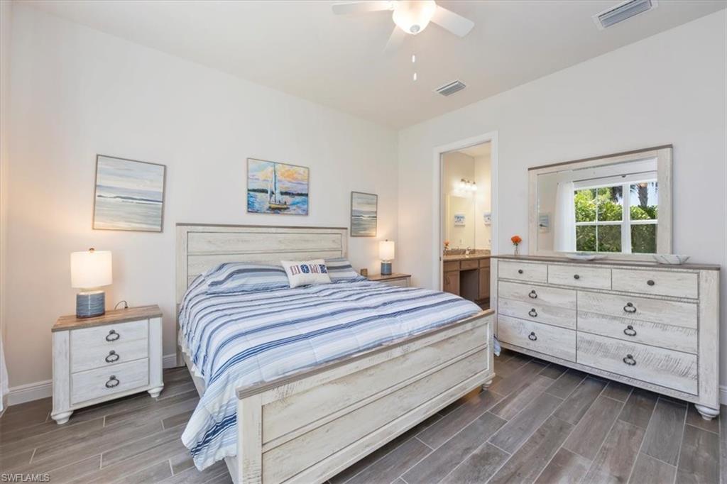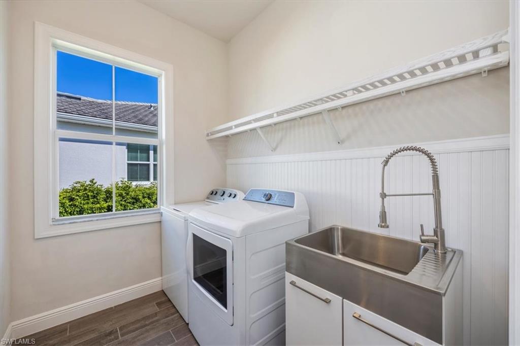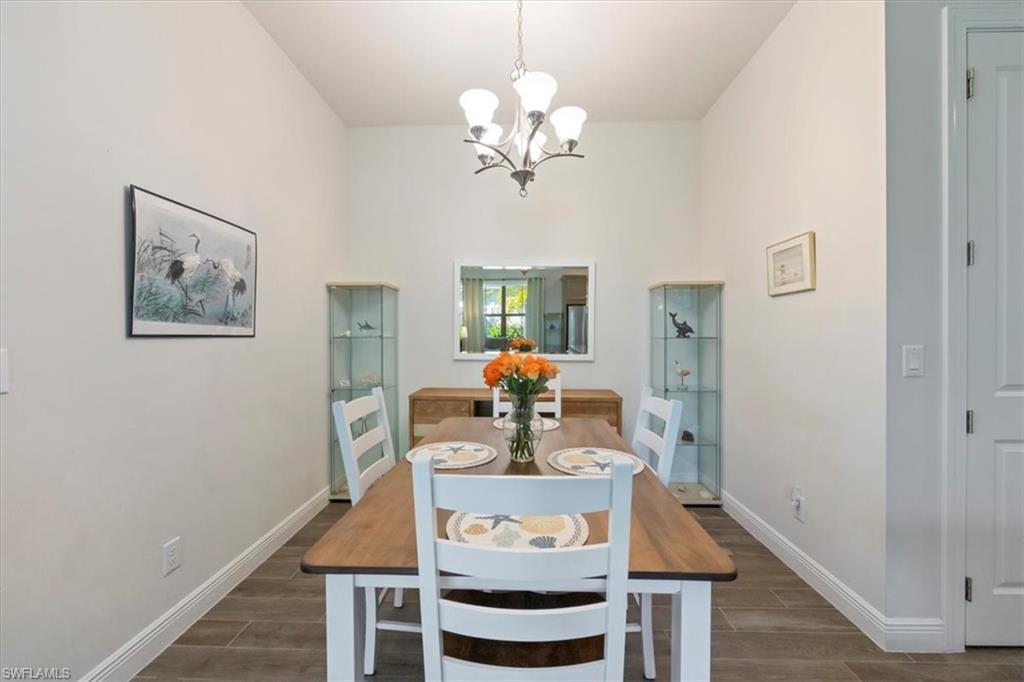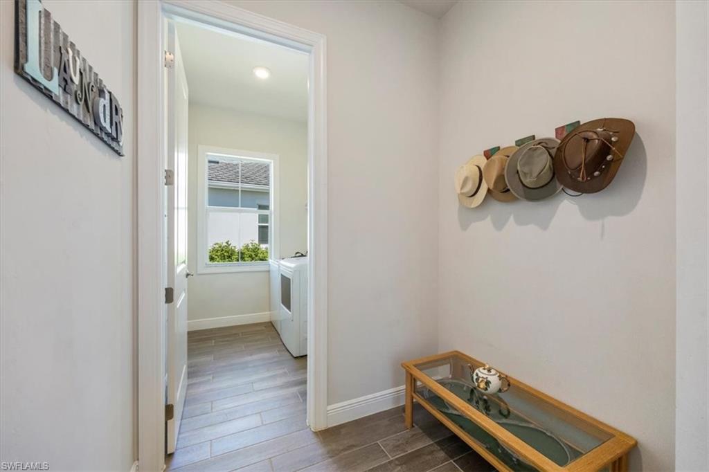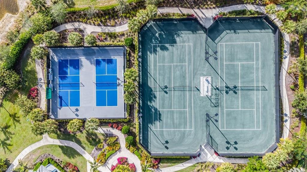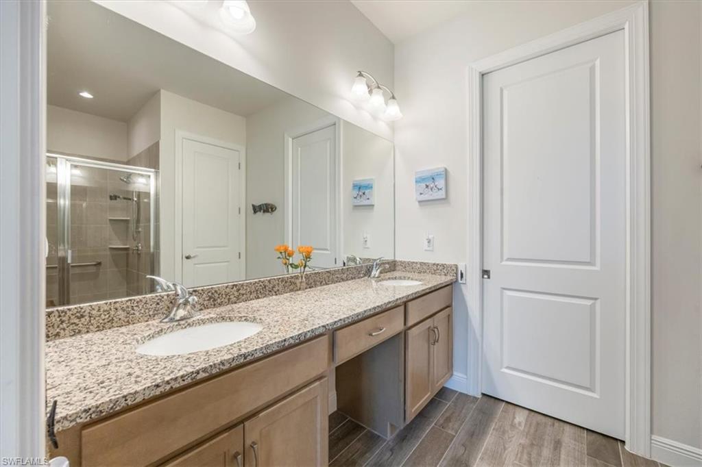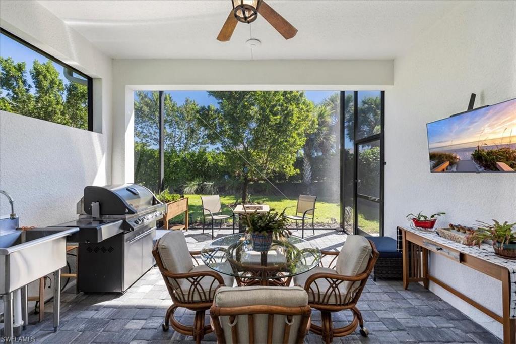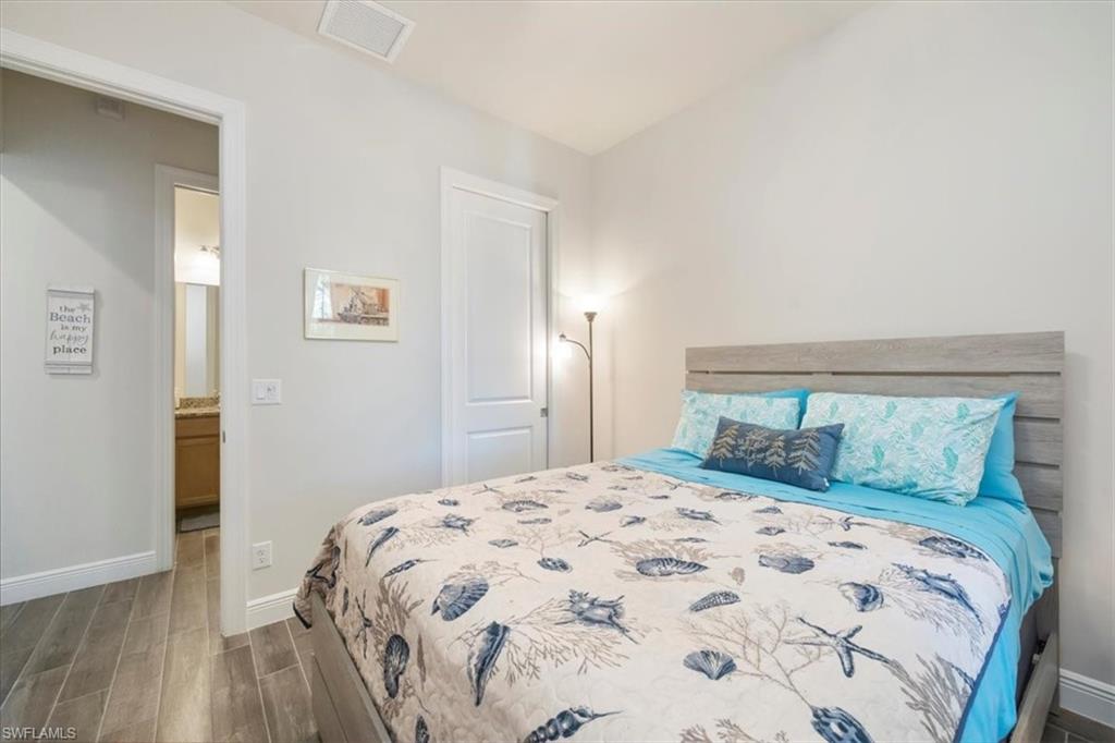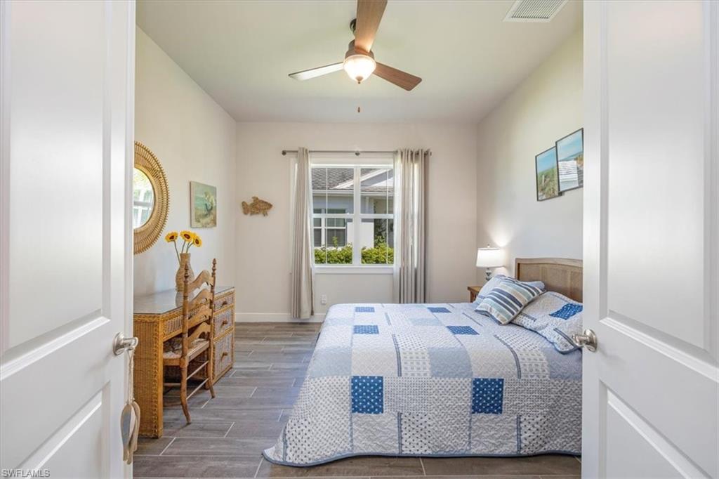 Welcome to 9016 Saint Lucia Drive in Azure at Hacienda Lakes—Naples, Florida, a premier gated community offering coastal-inspired living. This beautifully designed and furnished Baypointe Villa features 1,569 square feet of thoughtfully planned living space with 2 bedrooms, 2 bathrooms, a versatile den (ideal as a home office or optional third bedroom), and a spacious 2-car garage complete with built-in storage racks, cabinets, and a handy workbench for all your projects. Step inside and you’ll find 10-foot ceilings, wide wood-look tile flooring throughout, and elegant coffered ceilings in the foyer and great room. The open concept layout showcases a gourmet kitchen with gas cooking, stainless steel appliances, granite countertops, tile backsplash, breakfast bar and pantry. The kitchen flows seamlessly into the dining area and expansive great room—ideal for both everyday living and entertaining. The owner’s suite offers a bathroom featuring a dual-sink granite vanity, walk-in shower and spacious walk-in closet. The guest bedroom, located near a full bathroom, provides comfort and privacy for visitors. Additional upgrades include smart home technology, recessed lighting, ceiling fans, upgraded wood shelving in all closets, tankless water heater, hurricane impact front window and door, HVAC UV light for clean air, and a laundry room with tub sink. Outdoor living is equally impressive. Enjoy a private backyard with a covered lanai, extended brick pavers, open-air screen enclosure, outdoor sink and gas hookup for grilling. There’s also plenty of room to design your own dream pool. Residents enjoy resort-style amenities including a gated entrance, clubhouse with social activities and game rooms, billiards, café, library, heated pool and spa with cabanas, state-of-the-art fitness center, tennis and pickleball courts, firepit and a BBQ/picnic area. Located just minutes from downtown Naples’ 5th Avenue, Gulf Coast beaches, Marco Island, the Naples Botanical Garden, the Naples Zoo, top-rated shopping, exceptional dining and medical facilities, this home offers the perfect balance of convenience and luxury. Don’t miss the opportunity to make this villa yours. Schedule a private showing today and experience the vacation lifestyle at Azure at Hacienda Lakes.