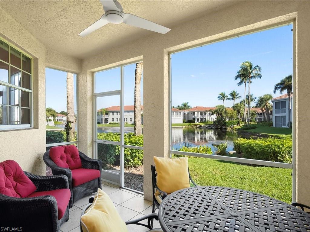 WOW! THIS HAS IT ALL! BEAUTIFUL LAKE VIEW, SCREENED LANAI,ONE CAR GARAGE, HIGH CEILINGS ,FIRST FLOOR This beautifully furnished 2-bedroom condo in the private, gated community of L’Ambiance at Pelican Bay offers tranquil lake views with a cascading water feature. Inside, you’ll find a light-filled, open layout with split bedrooms for privacy. The spacious living room flows to a dining area and upgraded eat-in kitchen, while the screened lanai invites you to relax or dine al fresco with a 180° view of the lake and waterfall. The primary suite features generous closets, a tub and shower bath, plus space for a private desk. The guest suite boasts a Jack and Jill bath. A one-car garage and private driveway add convenience. L’Ambiance is surrounded by lush landscaping, fountains, and walking paths, with a community pool and hot tub just steps away. You’re also within walking distance of the Marketplace at Pelican Bay with Publix, dining, CVS, and more. As a Pelican Bay resident, you’ll enjoy exclusive amenities: three miles of private beach with tram service, two Gulf-front restaurants, two tennis centers, a state-of-the-art Fitness and Wellness Center, and a brand-new 20-court pickleball facility opening November 2025. Plus, you’re minutes from Waterside Shops and Artis–Naples for world-class shopping, dining, and entertainment.