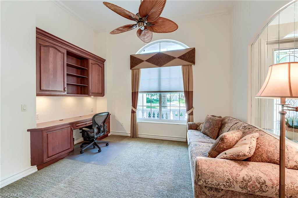 This Move-In-Ready Custom Harbourside Estate home offers the perfect combination of Location, Lifestyle and Luxury. It is in the premier neighborhood of Orchid Ridge in Shadow Wood and is conveniently located near the Clubhouse. Home is being offered turnkey furnished. Experience beautiful unobstructed views of the lake and the 7th south fairway on one of Shadow Wood's three championship golf courses. Full golf membership available to be purchased from Shadow Wood Country Club upon closing on this home. Skip the waitlist and head directly to the t-box. New flat tile roof has just been completed. This Astoria model has been meticulously maintained and features a split floor plan with 3 bedrooms ensuite, 1/2 bath, den and 3 car garage. Upon entering the foyer, you will immediately notice the travertine floors inside and on the lanai, coffered ceiling in the living room and double tray ceiling in the dining room. Spacious kitchen with center island for prepping, amble custom cabinet space, granite countertops and large walk-in pantry. Dine in the formal dining room, morning room or eat-in bar area. The primary suite features private double door entry, 2 spacious closets, and ensuite bath with water and linen closets, dual sinks, jetted tub and shower. Gas heated resort style pool and spa have been resurfaced and tile updated. Entertain at the outdoor bar with seating and TV. Generator and hurricane protection for your peace of mind. Recent updates include washer and dryer 2025, hot water heater 2025, pool pump 2024, pool heater 2023 and landscape lighting 2023. Member owned Shadow Wood Country Club has 54 holes of golf, 2 clubhouses, social/dining, tennis and bocce. The new Lifestyle Center is under construction and will include 2 resort style pools, a kid's pool, restaurant and bar, 6 indoor pickleball courts, racquet pro shop and grab and go café. The Commons Club membership offers access to private beach club, fitness center and spa, pickleball, social activities, private restaurant, playground and lap pool. Great location close to RSW Airport, restaurants, shopping, beaches and health care. Don't miss this opportunity to live a Luxurious Lifestyle in this Beautiful Home.