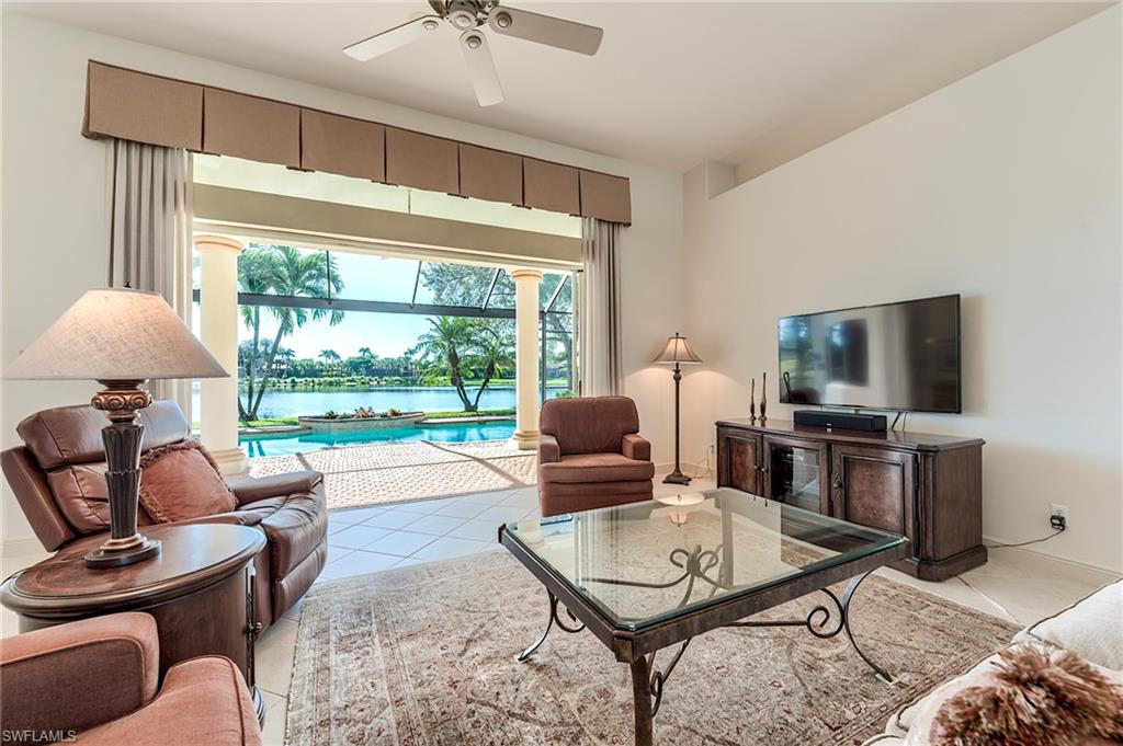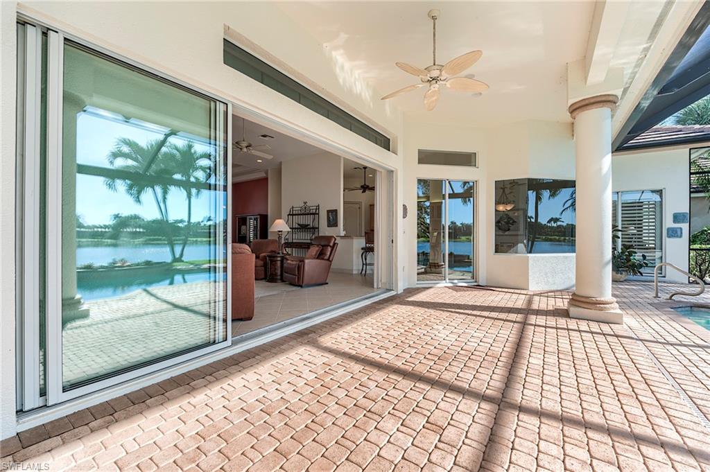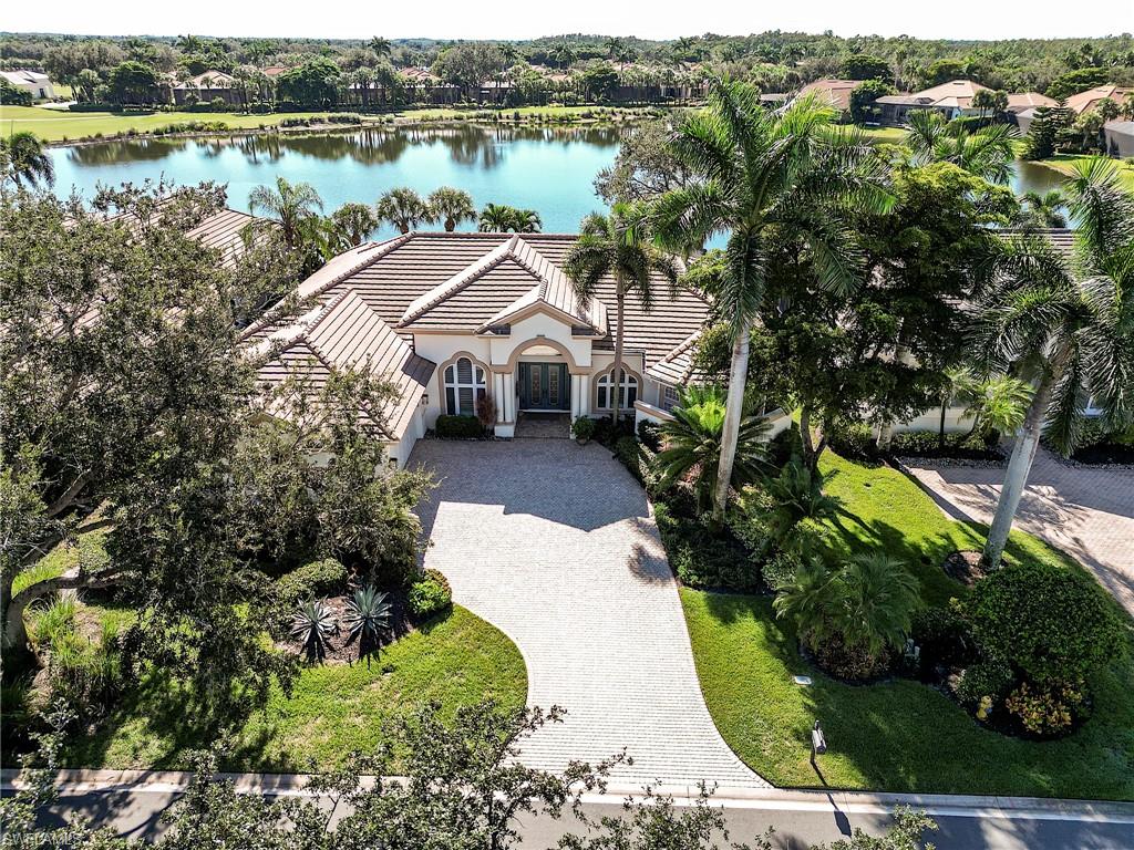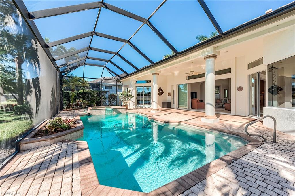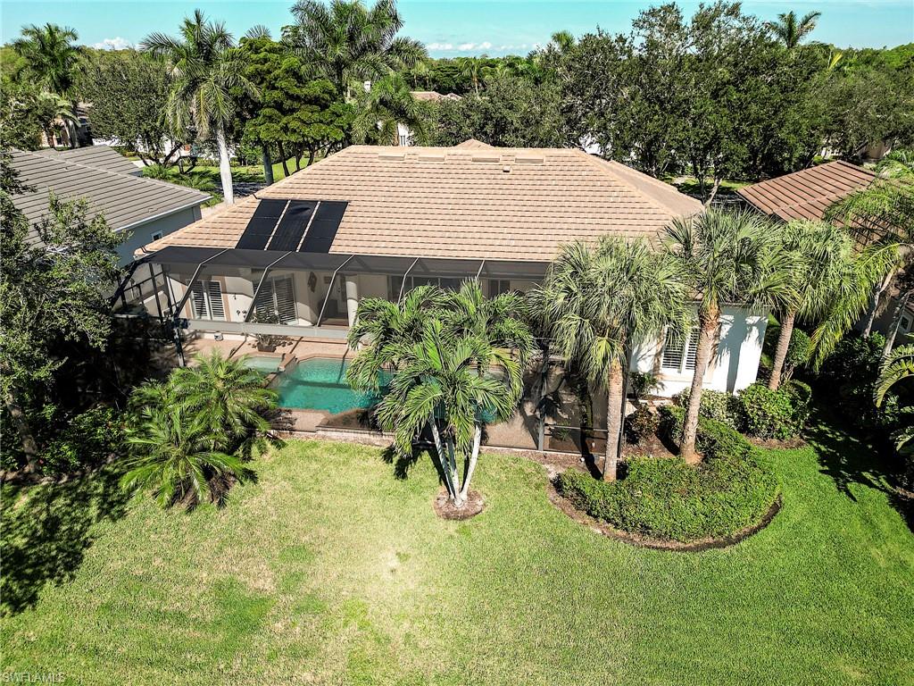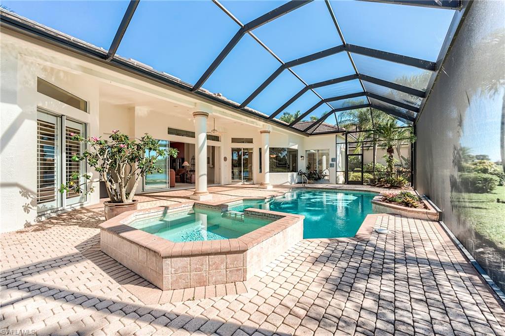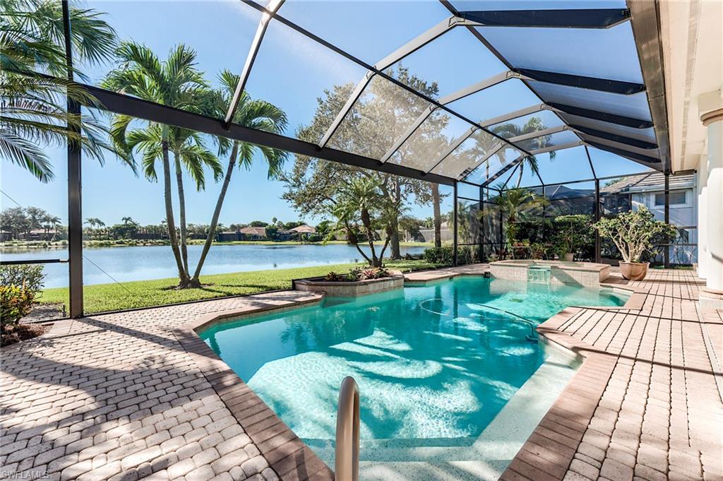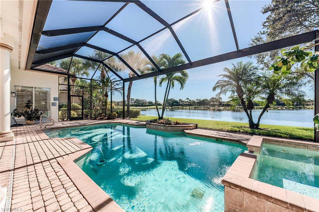 Harbourside Custom home located in the very popular Summerfield neighborhood in Shadow Wood. Full Golf Membership available to be purchased from Shadow Wood Country Club upon closing on this home. Skip the waitlist and head directly to the t-box. Ideal location for walking or biking to the Shadow Wood Clubhouse or the Commons Club. Fabulous great room floor plan features 3 bedrooms ensuite, 1/2 bath with access to the lanai, den and 2 car garage. Pocketing sliders open from the great room to the lanai with beautiful, picturesque views of the lake through the picture screen window. Relax or dine around the gas heated resort style saltwater pool and spa. Custom triple tray ceiling in dining room and coffered ceiling in the den. Kitchen complete with custom cabinetry, granite countertops, center island, eat-in-bar, morning room and walk in pantry. Split floor plan offers privacy for both guest and primary suites. New flat tile roof in 2022, 2023 AC unit in primary, 2019 hot water heater and kitchen appliances. Solar panels for pool heat and plantation shutters throughout. Shadow Wood Country Club has 54 holes of golf, social/dining, tennis and bocce. The new lifestyle Amenity Center is under construction and will include 2 resort style pools, a kid's pool, restaurant and bar, 6 indoor pickleball courts, racquet pro shop and grab and go cage. The Commons Club membership offers access to the private beach club, fitness center and spa, pickleball, social activities, private restaurant, playground, and lap pool. Great location close to airport, shopping, restaurants, beaches and health care. Add your special touches and features to this amazing home. Give me a call for your private tour today.