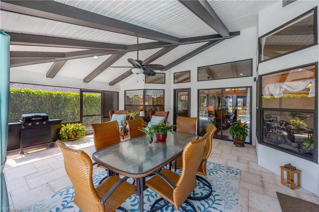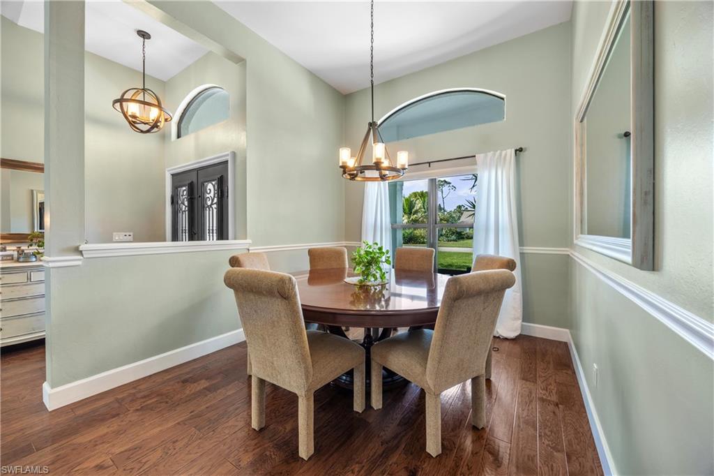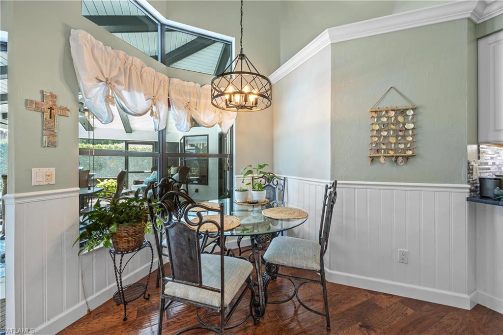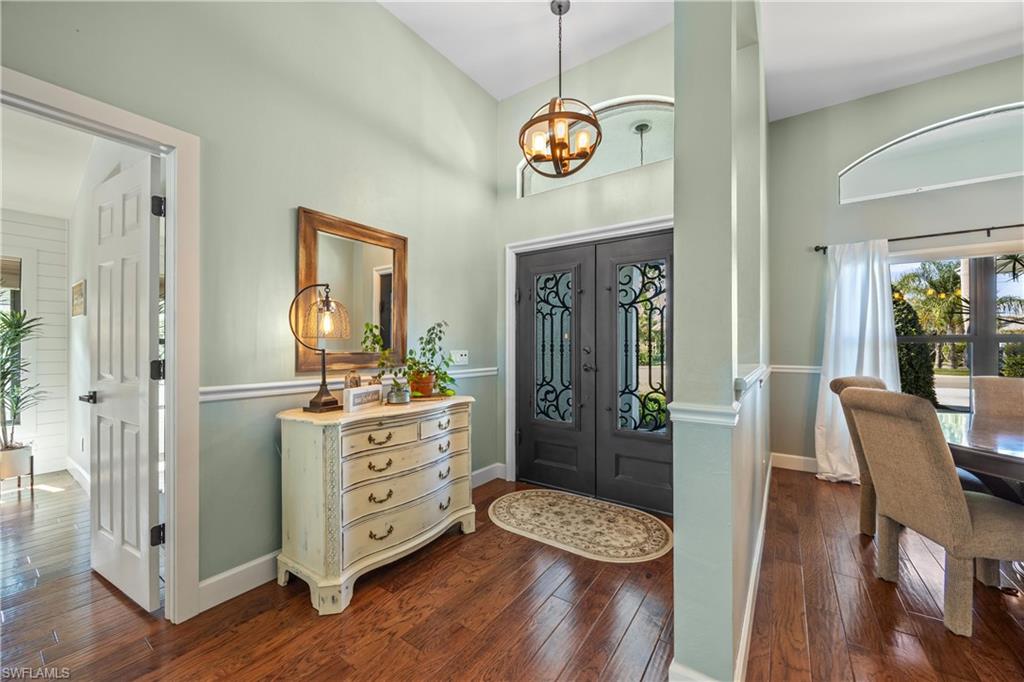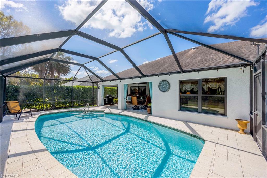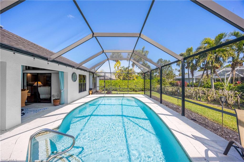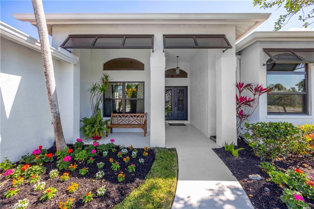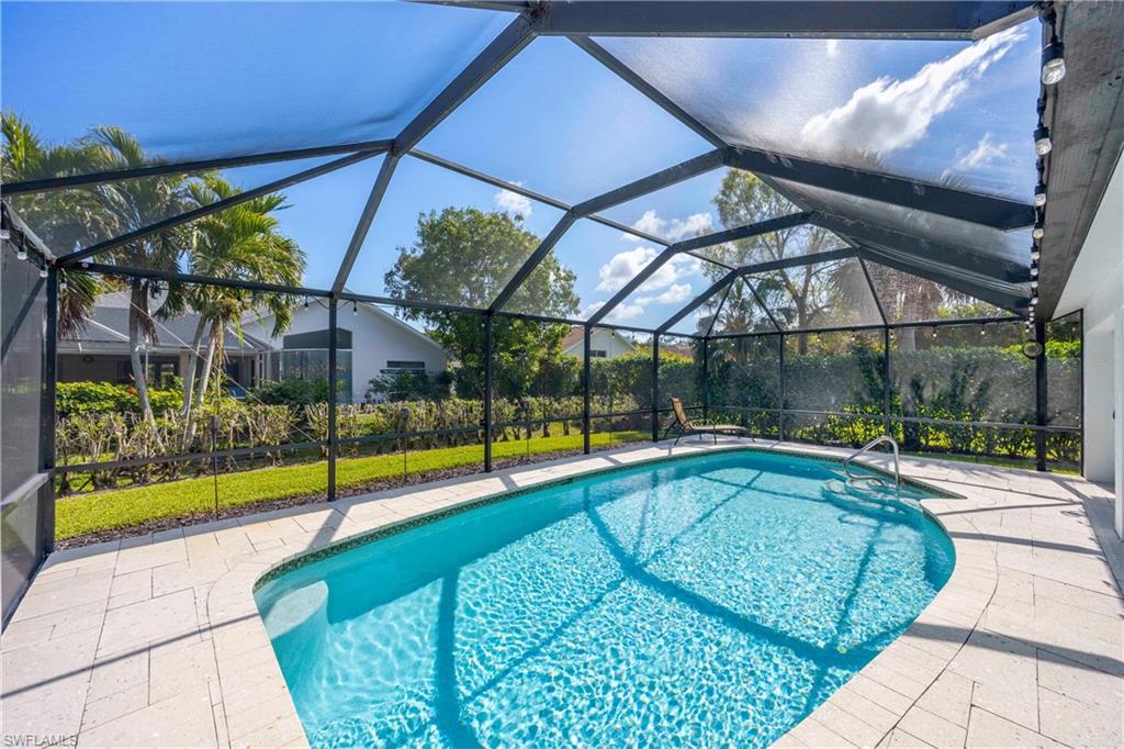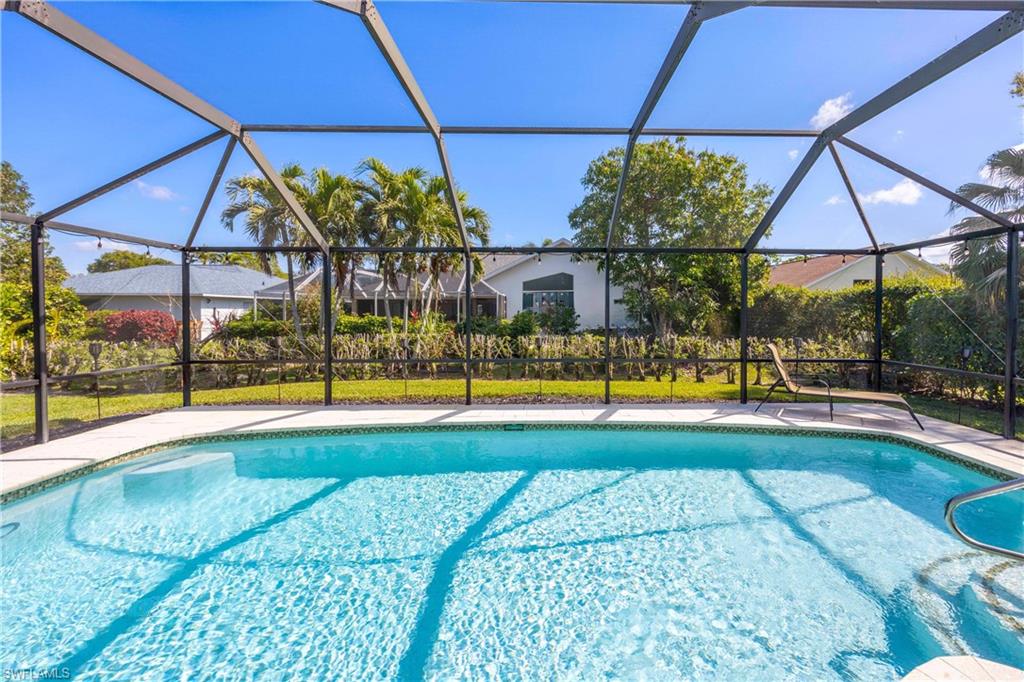 Welcome to your dream oasis in the heart of North Naples! This exquisitely renovated 3-bedroom, 2-bathroom ranch-style home in the sought- after Quail Crossing community seamlessly blends luxury, comfort, and modern sophistication. From the moment you arrive, lush tropical landscaping and a custom wrought iron double front door invite you into a world of refined elegance. Inside, hand-scraped wood floors flow throughout the open floor plan, leading to wraparound sliders and windows that bathe the space in natural light and offer serene views of the newly resurfaced and re-tiled pool. The expansive covered lanai, featuring brand-new pavers and a striking shiplap ceiling, creates the perfect outdoor retreat for relaxation and entertaining. The designer kitchen is a chef’s dream, boasting stainless steel appliances, under-cabinet and toe-kick lighting, and luxurious leather-washed granite countertops. Both bathrooms have been meticulously updated with high-end finishes, adding to the home's sophisticated charm. Additional upgrades include spray foam insulation in the house and garage attic, a newer multi- speed 4-ton AC unit, a NEST smart thermostat, and PEX plumbing. Every detail has been thoughtfully considered—from crown molding throughout to multi-colored accent lighting, beadboard wainscoting in the family room, and even a serene butterfly garden. Situated on a 0.23- acre lot, this 1,855 sq ft home offers a tranquil lifestyle with low HOA fees and proximity to Naples' pristine beaches, top-rated schools, and vibrant dining and shopping destinations.