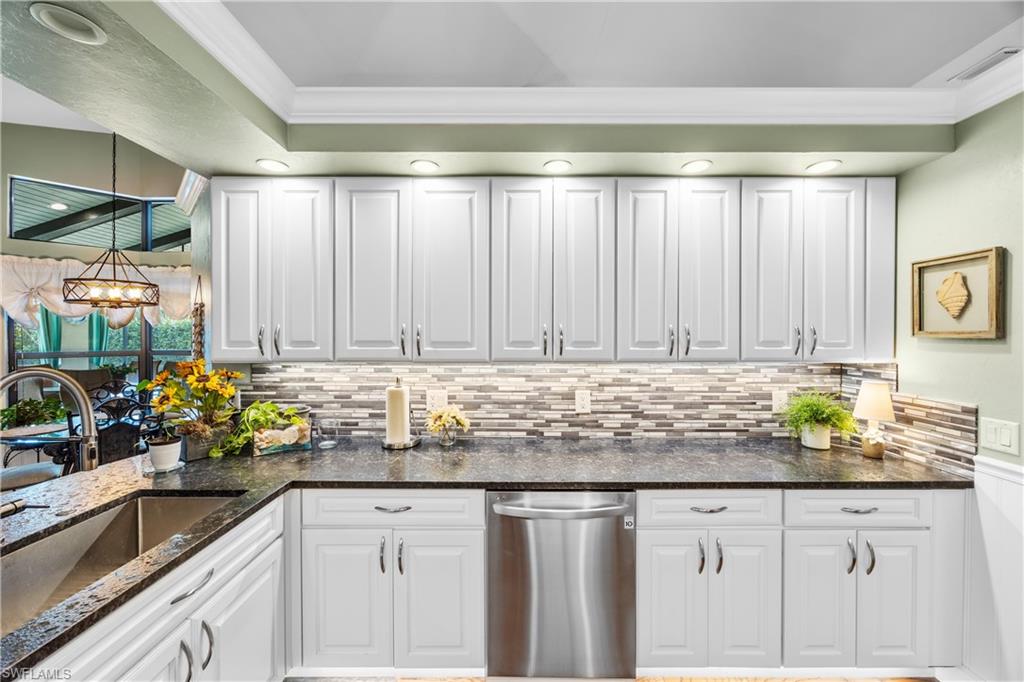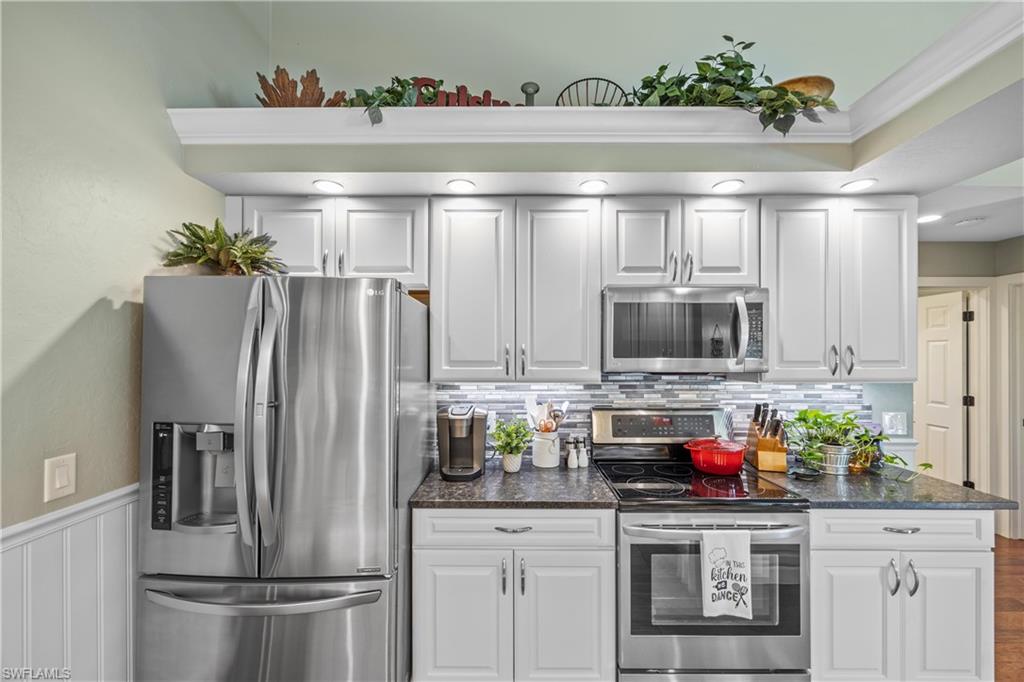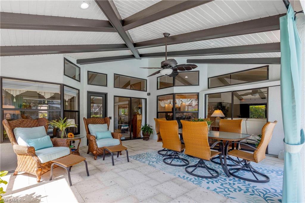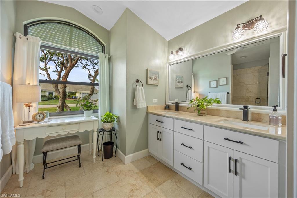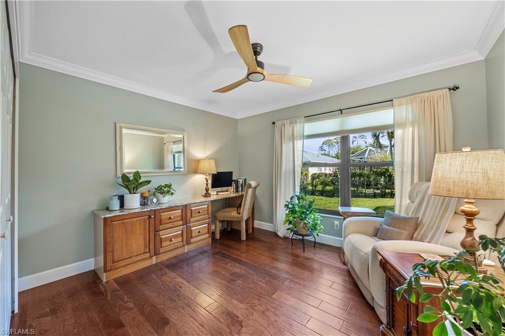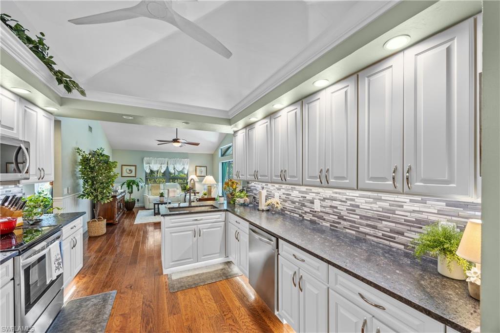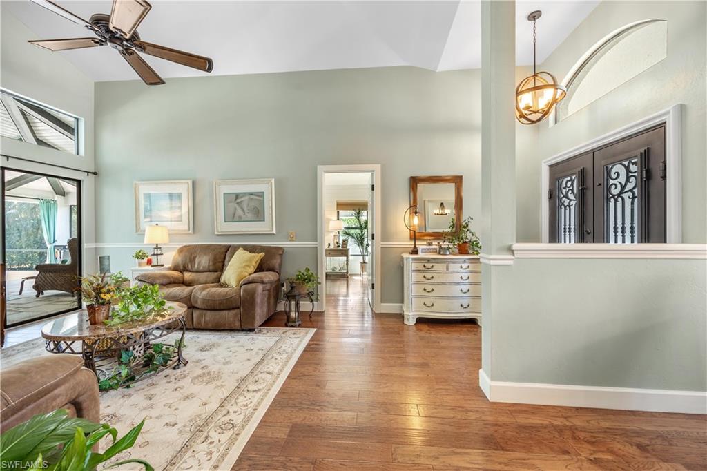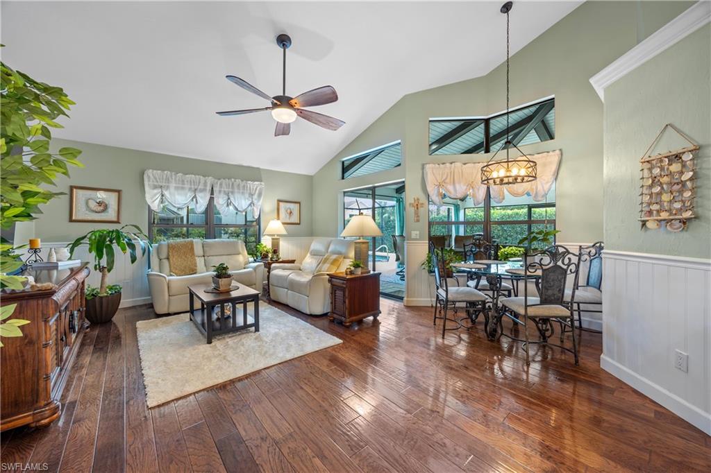 Welcome to your dream oasis in the heart of North Naples! This exquisitely renovated 3-bedroom, 2-bathroom ranch-style home in the sought- after Quail Crossing community seamlessly blends luxury, comfort, and modern sophistication. From the moment you arrive, lush tropical landscaping and a custom wrought iron double front door invite you into a world of refined elegance. Inside, hand-scraped wood floors flow throughout the open floor plan, leading to wraparound sliders and windows that bathe the space in natural light and offer serene views of the newly resurfaced and re-tiled pool. The expansive covered lanai, featuring brand-new pavers and a striking shiplap ceiling, creates the perfect outdoor retreat for relaxation and entertaining. The designer kitchen is a chef’s dream, boasting stainless steel appliances, under-cabinet and toe-kick lighting, and luxurious leather-washed granite countertops. Both bathrooms have been meticulously updated with high-end finishes, adding to the home's sophisticated charm. Additional upgrades include spray foam insulation in the house and garage attic, a newer multi- speed 4-ton AC unit, a NEST smart thermostat, and PEX plumbing. Every detail has been thoughtfully considered—from crown molding throughout to multi-colored accent lighting, beadboard wainscoting in the family room, and even a serene butterfly garden. Situated on a 0.23- acre lot, this 1,855 sq ft home offers a tranquil lifestyle with low HOA fees and proximity to Naples' pristine beaches, top-rated schools, and vibrant dining and shopping destinations.