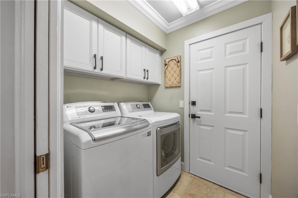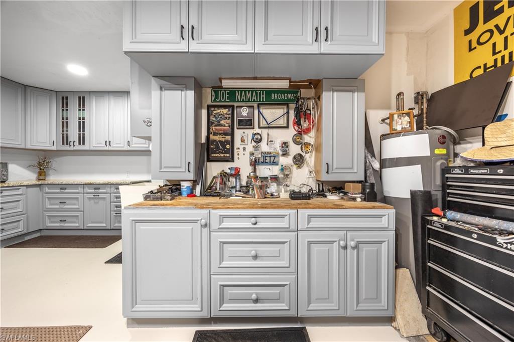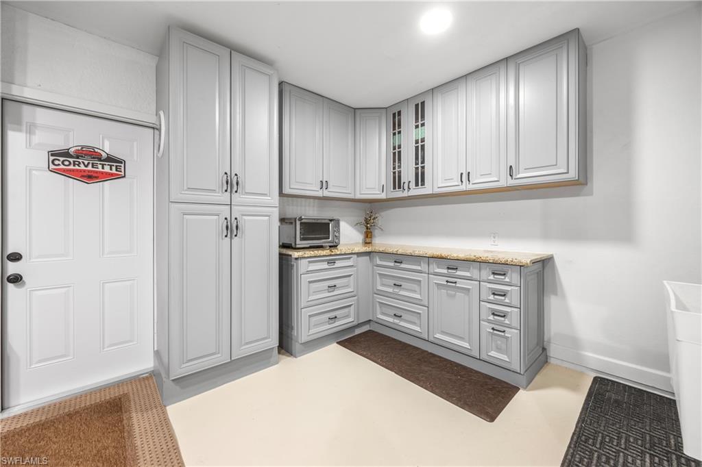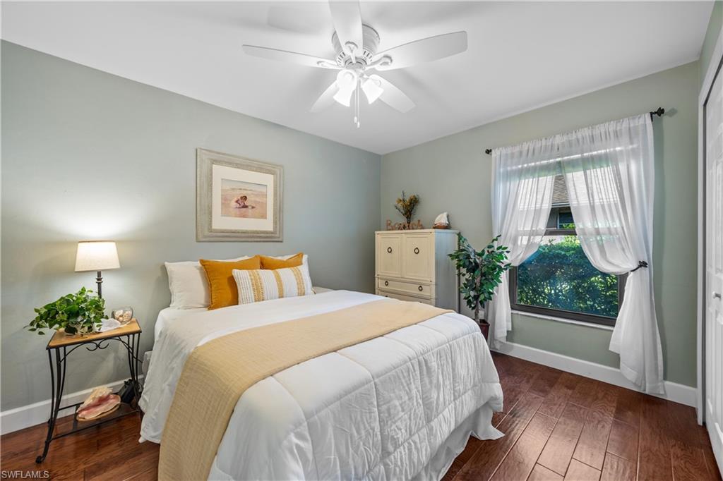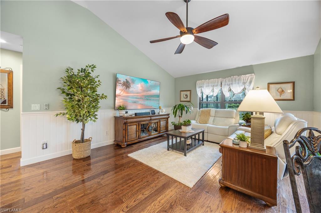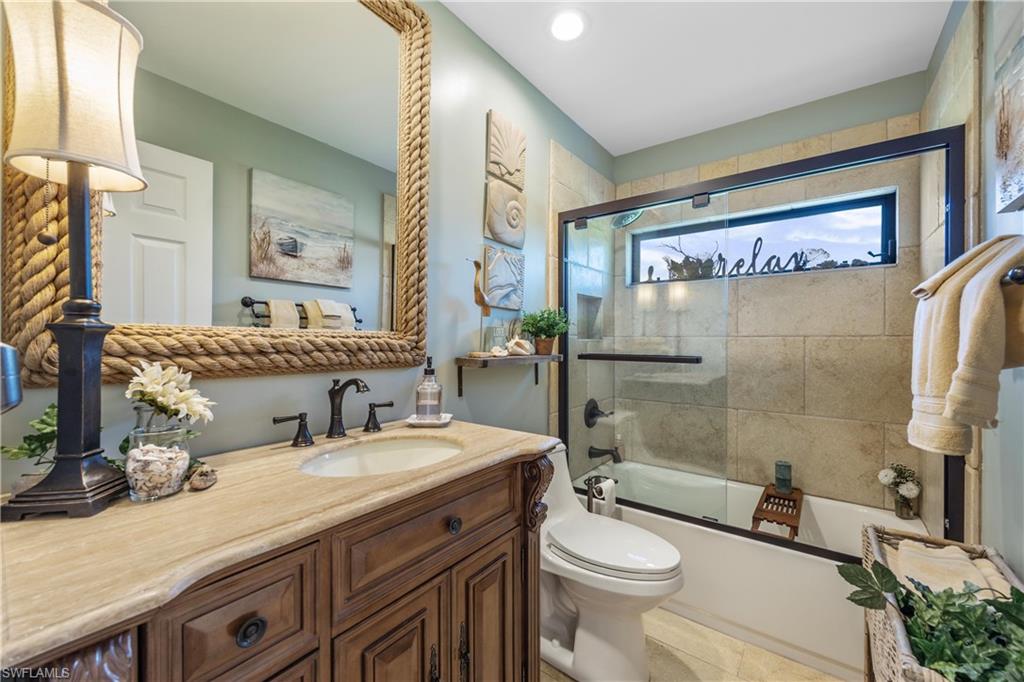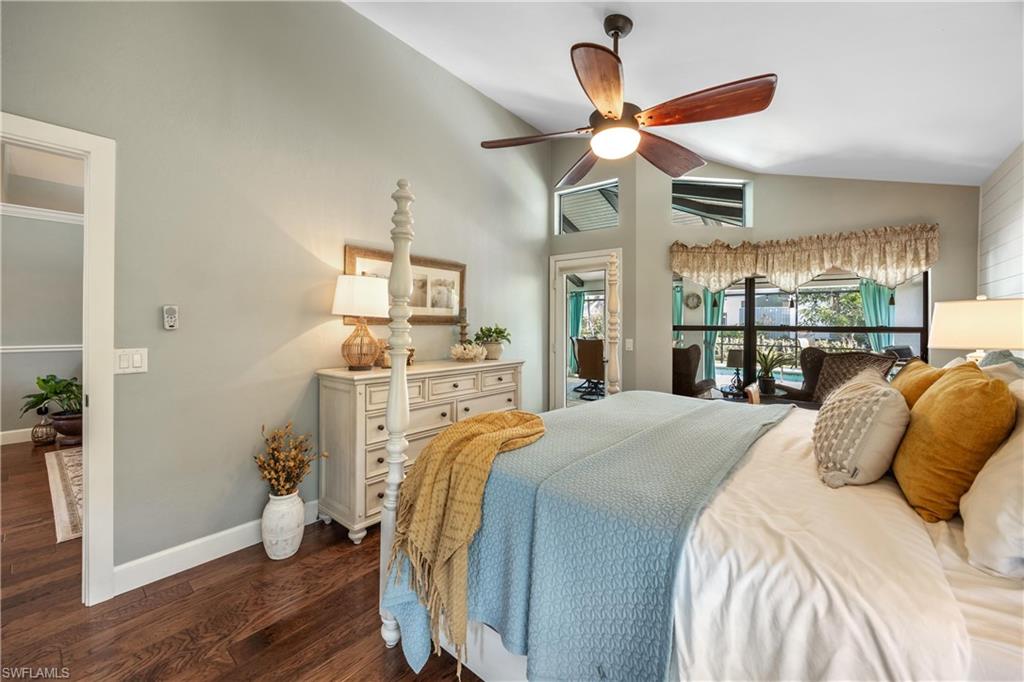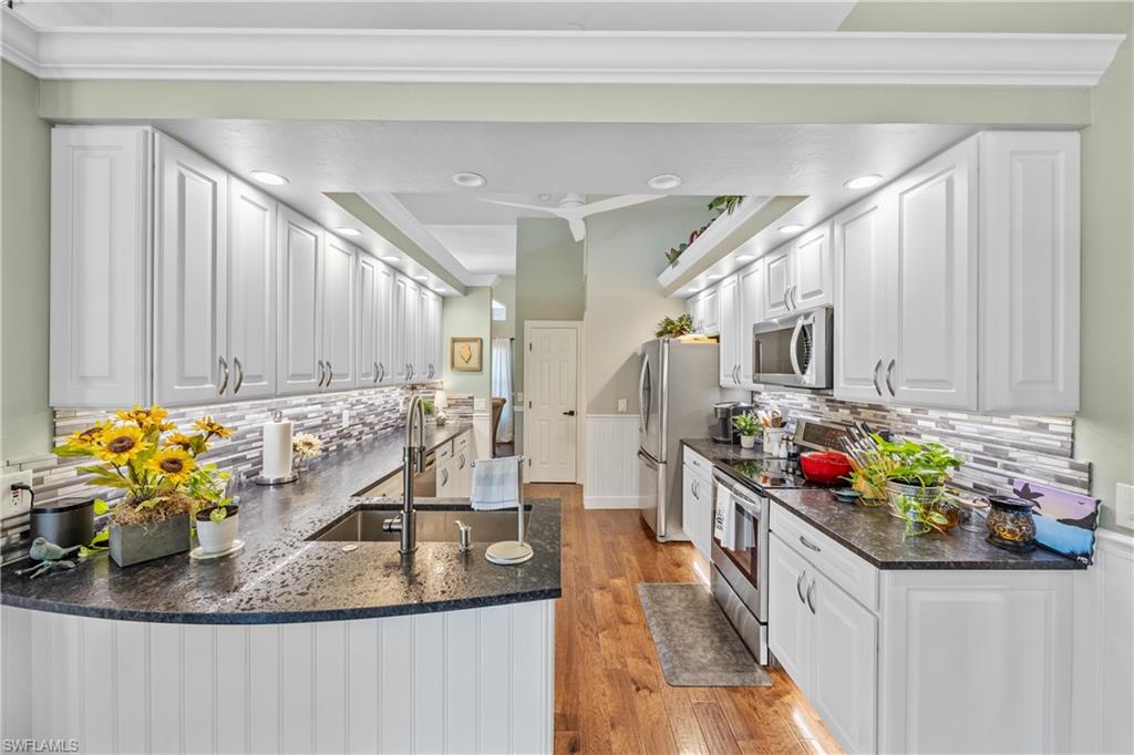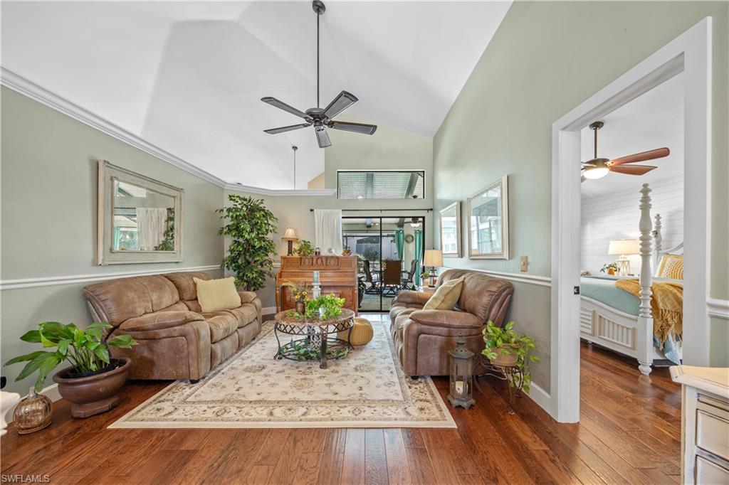 Welcome to your dream oasis in the heart of North Naples! This exquisitely renovated 3-bedroom, 2-bathroom ranch-style home in the sought- after Quail Crossing community seamlessly blends luxury, comfort, and modern sophistication. From the moment you arrive, lush tropical landscaping and a custom wrought iron double front door invite you into a world of refined elegance. Inside, hand-scraped wood floors flow throughout the open floor plan, leading to wraparound sliders and windows that bathe the space in natural light and offer serene views of the newly resurfaced and re-tiled pool. The expansive covered lanai, featuring brand-new pavers and a striking shiplap ceiling, creates the perfect outdoor retreat for relaxation and entertaining. The designer kitchen is a chef’s dream, boasting stainless steel appliances, under-cabinet and toe-kick lighting, and luxurious leather-washed granite countertops. Both bathrooms have been meticulously updated with high-end finishes, adding to the home's sophisticated charm. Additional upgrades include spray foam insulation in the house and garage attic, a newer multi- speed 4-ton AC unit, a NEST smart thermostat, and PEX plumbing. Every detail has been thoughtfully considered—from crown molding throughout to multi-colored accent lighting, beadboard wainscoting in the family room, and even a serene butterfly garden. Situated on a 0.23- acre lot, this 1,855 sq ft home offers a tranquil lifestyle with low HOA fees and proximity to Naples' pristine beaches, top-rated schools, and vibrant dining and shopping destinations.