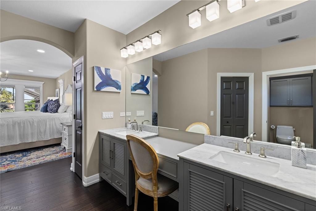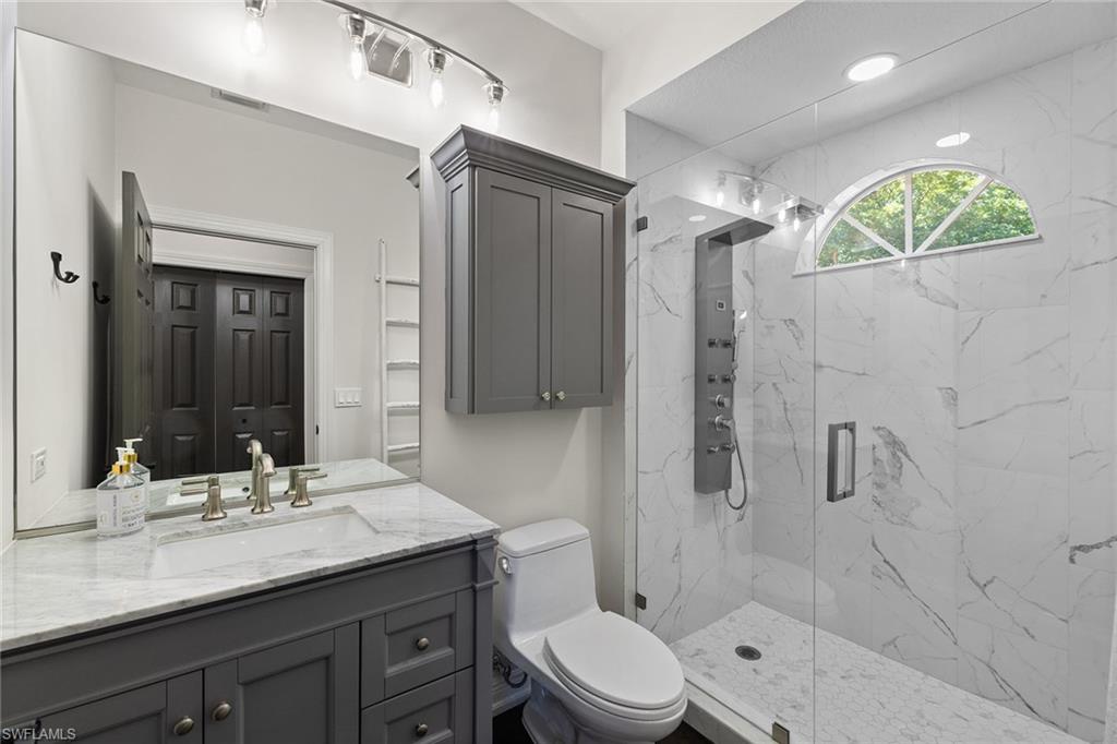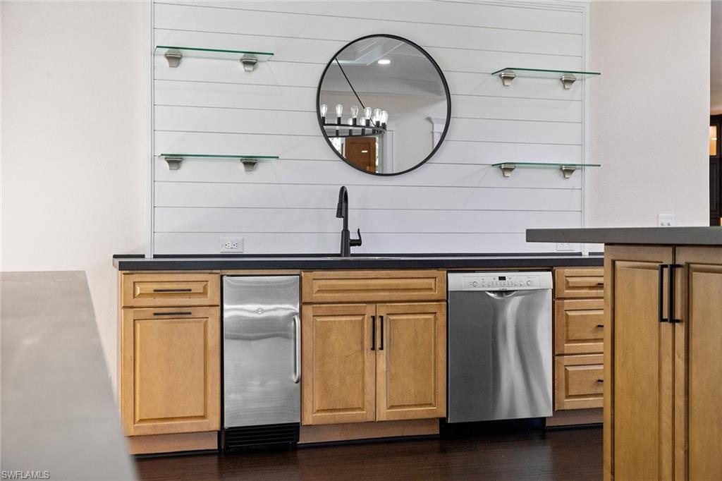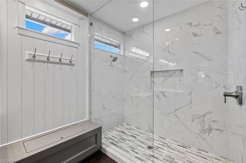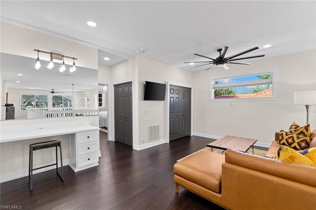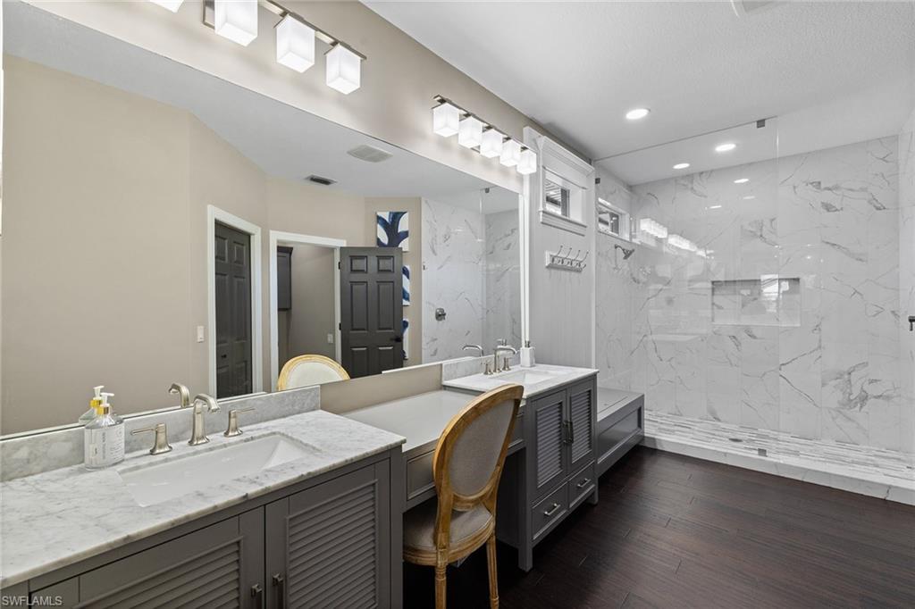 This recently renovated furnished residence in the sought-after Lely Resort offers 3,100 square feet of elegant living space with four bedrooms and three full baths. Designed for both daily comfort and sophisticated entertaining, the home features an expansive kitchen anchored by a 20-foot island, granite countertops, custom cabinetry, a gas cooktop, high-end stainless steel appliances and a coffee bar with a beverage cooler. A second gathering room provides an additional 8-by-5-foot island, a built-in ice maker, a wine cooler and a secondary dishwasher, creating a seamless setting for hosting. Throughout the home, wood flooring, recessed lighting and two fireplaces add warmth and style. The first-floor bedroom provides convenience and privacy for guests, while the upstairs suites include a spacious primary retreat with a spa-inspired bath. The outdoor living space is enhanced by a soaring screened lanai with paver decking, tongue-and-groove accents, ceiling fans, and privacy screens. Overlooking the peaceful lake, the heated pool offers a tranquil backdrop for relaxation. Other key updates include impact windows and doors, a whole-home generator, a buried propane gas tank, a whole-home water filtration system, custom garage cabinet organization and much more! Residents may also take advantage of optional membership at the award-winning Players Club and Spa, which includes resort-style pools, a fitness center, dining venues, tennis, pickleball, and more. Lely Resort also offers three championship golf courses. The home is minutes from the beaches of Naples and Marco Island as well as the cultural and dining attractions of Fifth Avenue South.