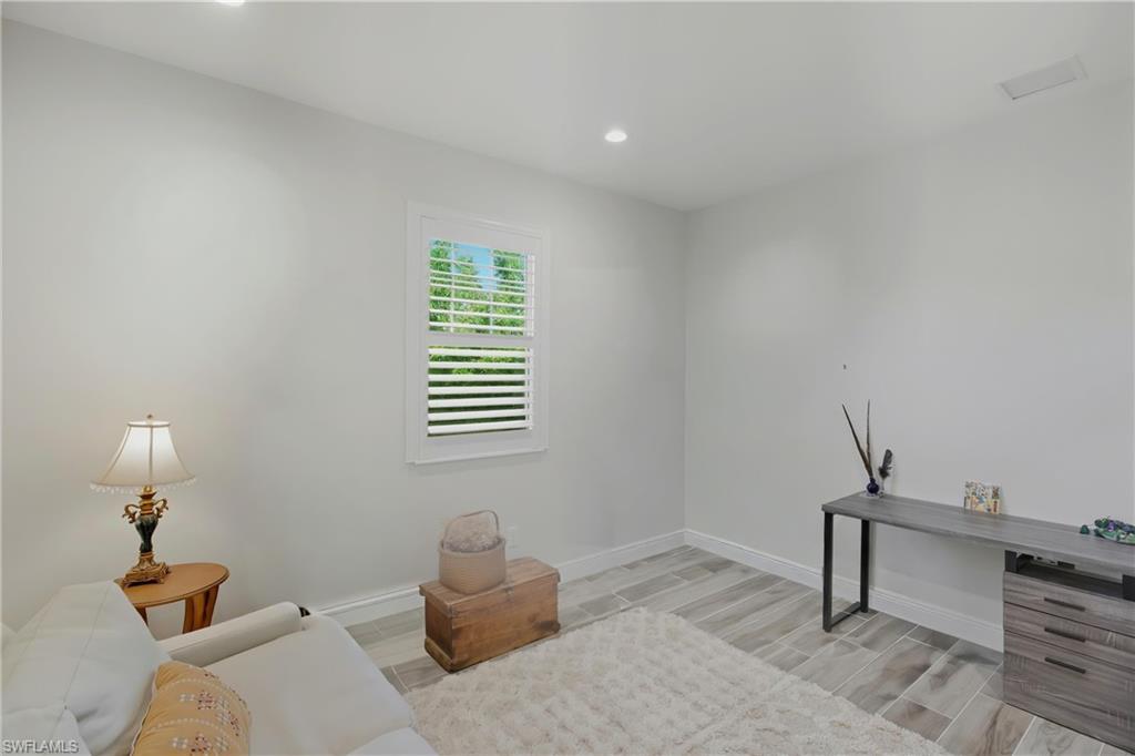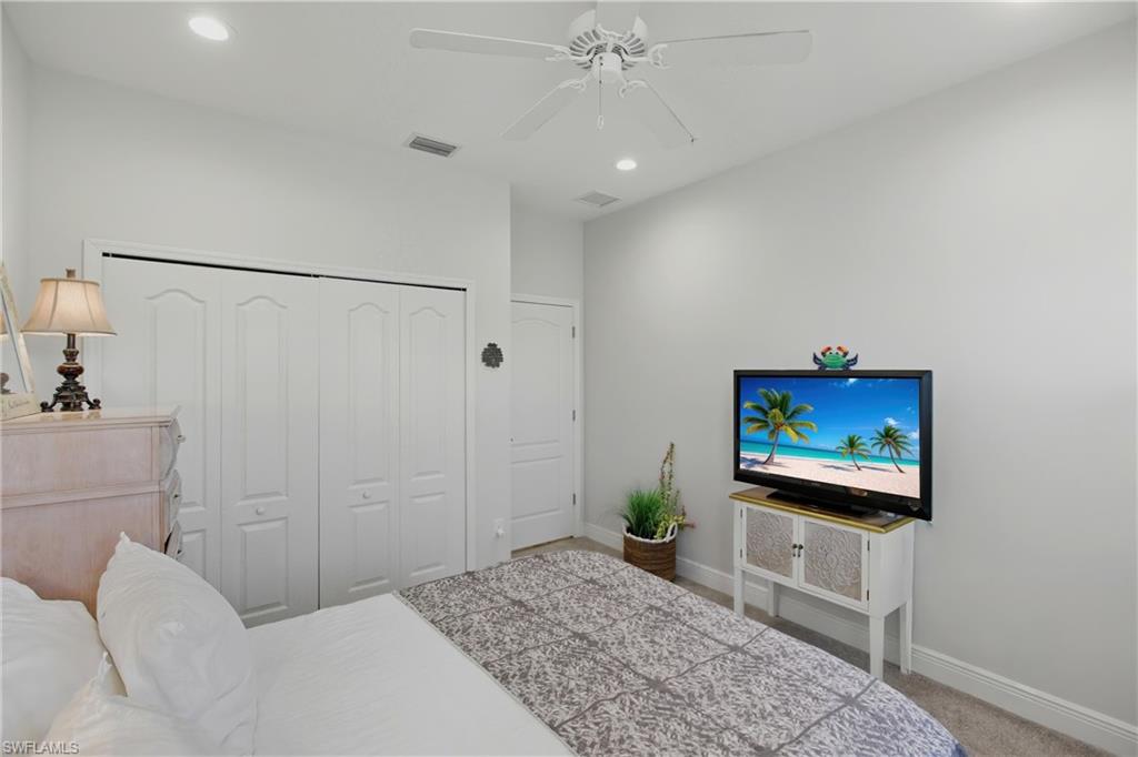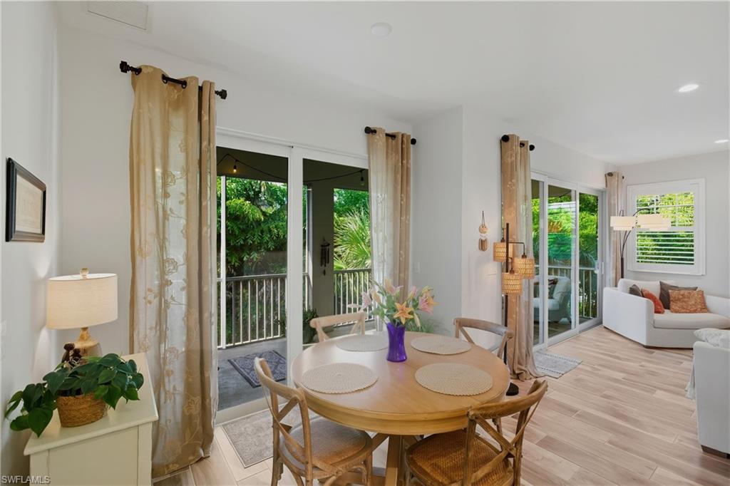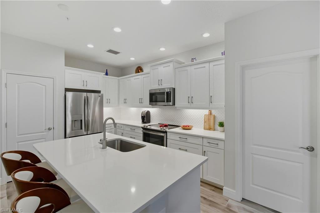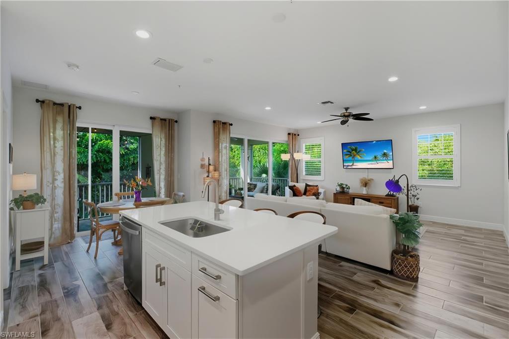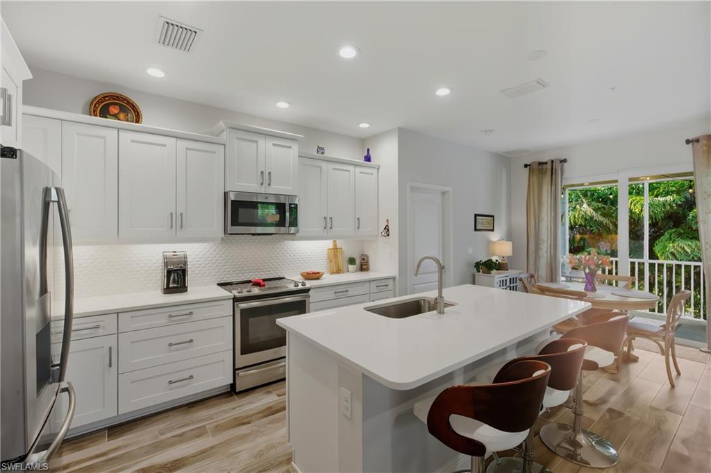 Pristine second-floor end unit offering private views and abundant natural light. This Windemere model carriage home in Avalon of Naples features 2 bedrooms plus a den, 2 bathrooms, and a 1-car garage with 1,660 square feet under air. The south and southwest exposure fills the home with light throughout the day. The upgraded kitchen includes white cabinets, quartz countertops, and stainless-steel appliances. Stylish 8x36 wood-look plank tile floors and plantation shutters run through every room, while the light color palette creates a clean, timeless look. As a newer construction home, it meets modern hurricane standards with impact windows and doors, and solid concrete construction provides added peace of mind. The split floor plan gives guests privacy, with the second bedroom and bathroom separated from the primary suite and featuring its own full bath. Avalon is a gated community located just minutes from Naples’ sandy beaches, 5th Avenue, 3rd Street South, and some of the best dining and shopping in the area. You’re only 5 miles from the historic charm of Olde Naples, Naples Pier, and Naples Beach. Residents enjoy a resort-style pool and hot tub, along with a clubhouse that can be reserved for private gatherings, making it easy to relax and entertain close to home. A 3D walk-through is available through the Virtual Tour link.