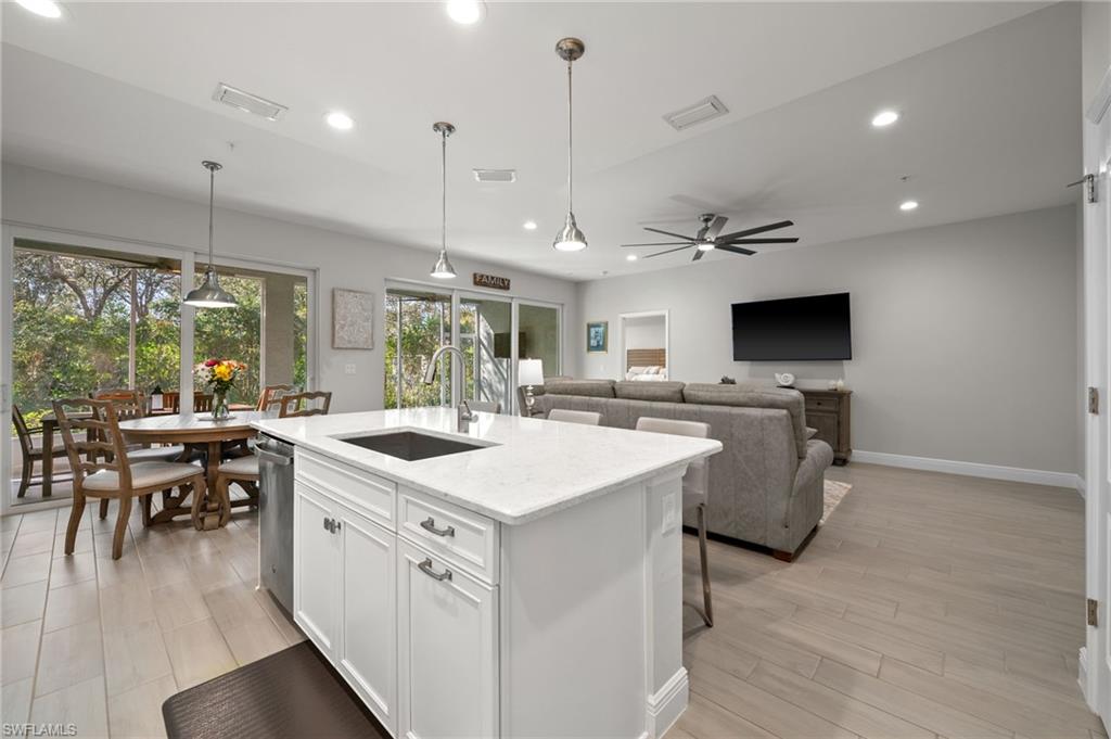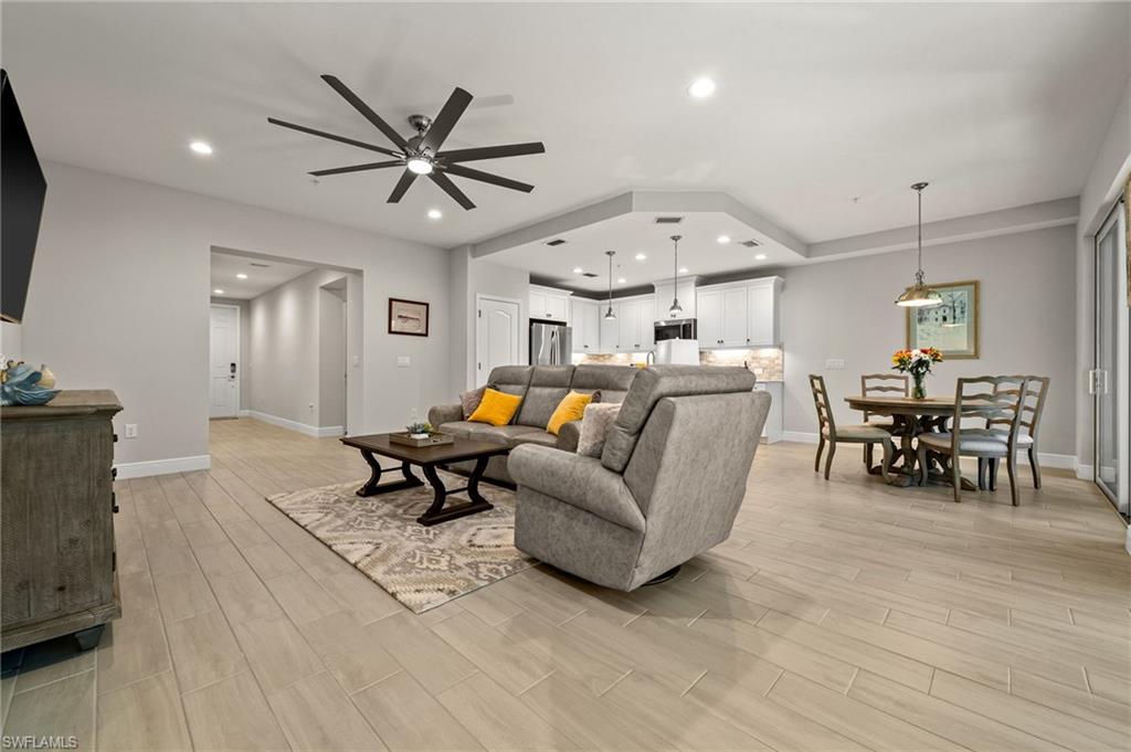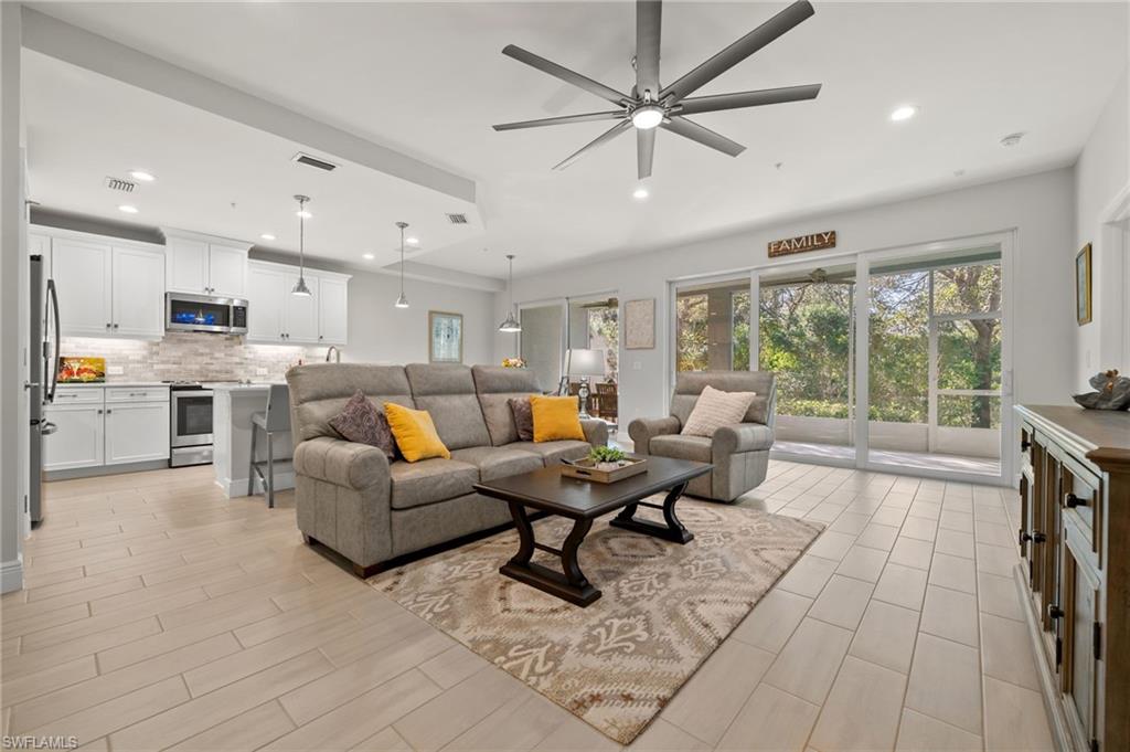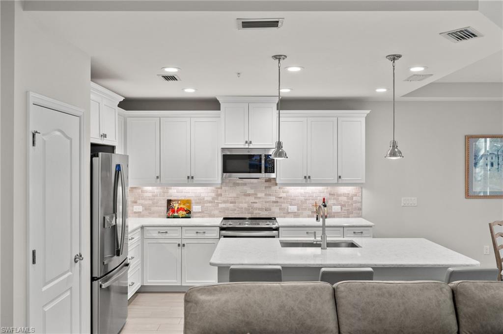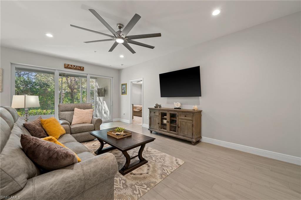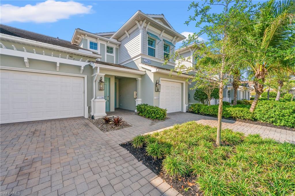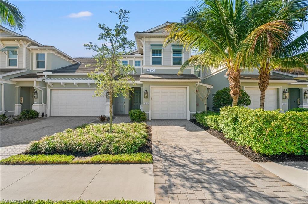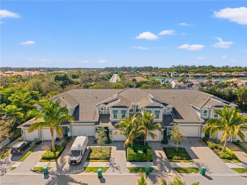 Welcome to Richmond Park, a highly sought-after boutique community in North Naples that offers an exclusive and tranquil living experience. This beautifully designed and meticulously maintained 2-bedroom, 2-bathroom coach home, built in 2021 by Neal Communities, boasts 1,779 square feet of thoughtfully planned living space, creating the perfect balance of elegance and functionality. As you step inside, you're greeted by an expansive great room, bathed in natural light thanks to its Southern rear exposure. The open floor plan seamlessly connects the main living areas, offering an inviting atmosphere for relaxing or entertaining. Modern plank tile flooring throughout the living spaces enhances the sophisticated feel, while plush carpeting in the bedrooms provides added comfort. At the heart of the home, the gourmet kitchen is a standout feature, designed to impress. It boasts white shaker cabinets, high-end stainless steel appliances, stunning quartz countertops, a stylish tile backsplash, and upgraded lighting—an ideal space for cooking and gathering. Storage is plentiful throughout, with a large walk-in finished closet in the primary suite, built-in closets in the laundry room, and overhead shelving in the garage—ensuring you have a dedicated space for all your essentials. The primary bedroom is a luxurious retreat, offering an ensuite bath with an elegant tile and stone shower and dual vanities, adding a spa-like touch to everyday living. Outdoor enjoyment is effortless with your private screened lanai, a serene retreat backing up to a peaceful grove of trees, offering a sense of seclusion and tranquility. Whether enjoying a morning coffee or an evening glass of wine, this space is perfect for relaxation. The home’s exterior is equally impressive, featuring a paver driveway and walkway, a durable tile roof, and lush tropical landscaping, contributing to fantastic curb appeal. Impact-resistant windows and sliding doors enhance safety, energy efficiency, and peace of mind. Situated in Richmond Park, a community of just 104 coach homes, residents enjoy a private and intimate setting while being moments away from the vibrant Founders Square. This prime location provides easy access to dining, shopping, and entertainment, making everyday life effortless. If you're searching for a home that combines modern elegance, thoughtful design, and an unbeatable location, this Richmond Park coach home is a must-see. Don’t miss this rare opportunity to experience luxury living in North Naples.
