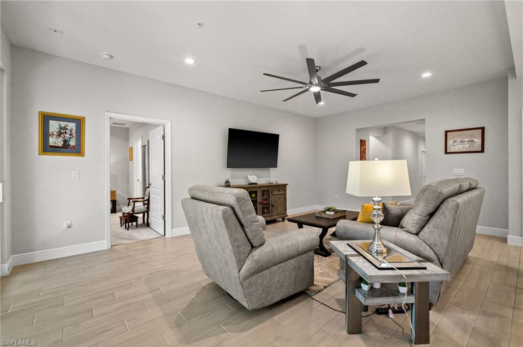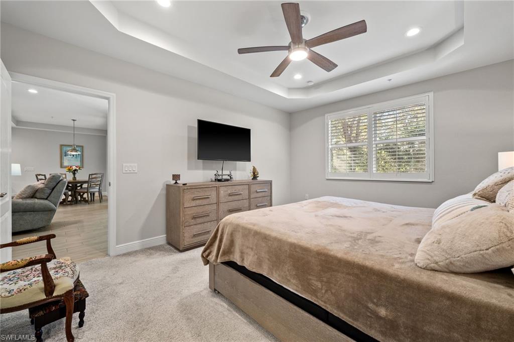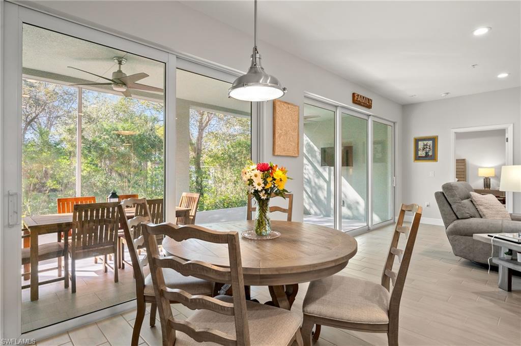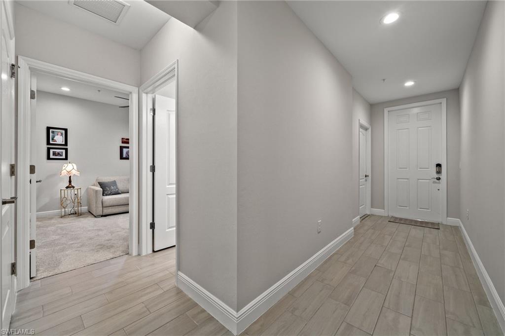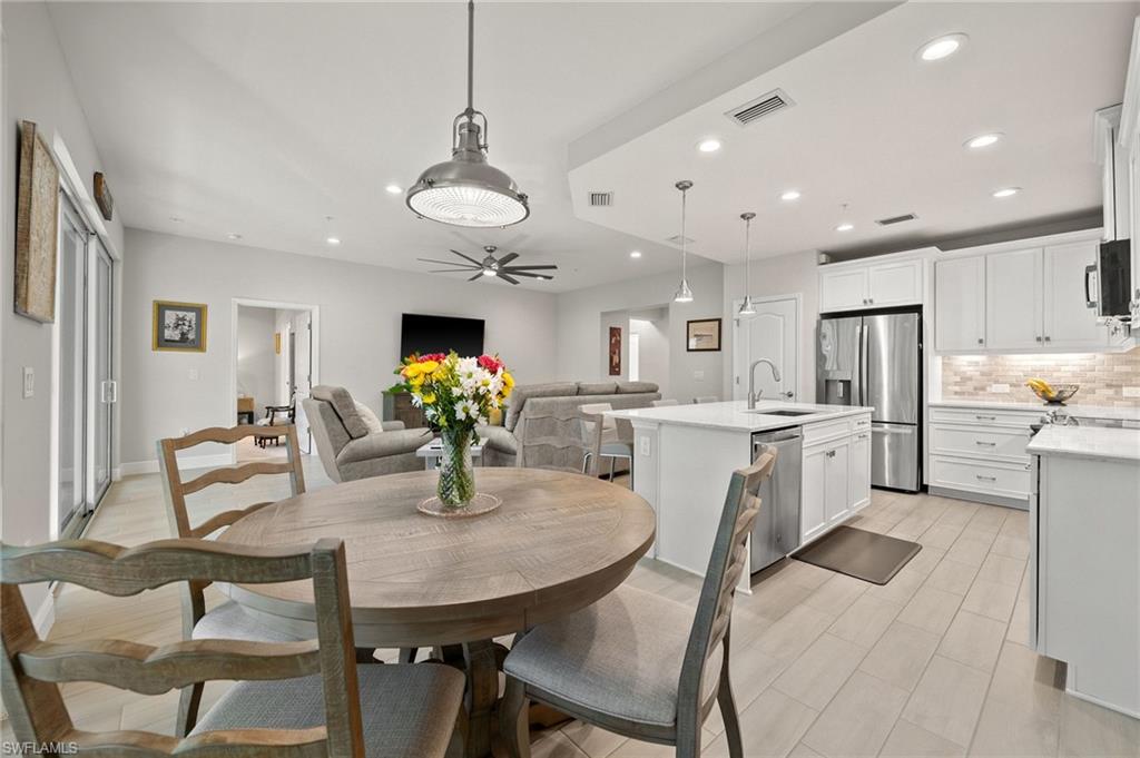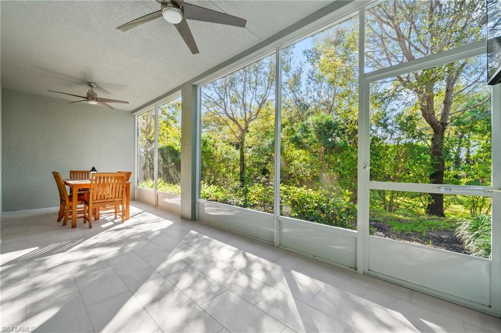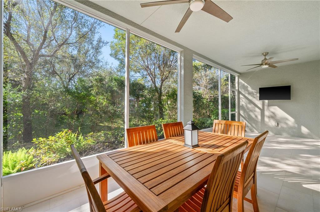 Welcome to Richmond Park, a highly sought-after boutique community in North Naples that offers an exclusive and tranquil living experience. This beautifully designed and meticulously maintained 2-bedroom, 2-bathroom coach home, built in 2021 by Neal Communities, boasts 1,779 square feet of thoughtfully planned living space, creating the perfect balance of elegance and functionality. As you step inside, you're greeted by an expansive great room, bathed in natural light thanks to its Southern rear exposure. The open floor plan seamlessly connects the main living areas, offering an inviting atmosphere for relaxing or entertaining. Modern plank tile flooring throughout the living spaces enhances the sophisticated feel, while plush carpeting in the bedrooms provides added comfort. At the heart of the home, the gourmet kitchen is a standout feature, designed to impress. It boasts white shaker cabinets, high-end stainless steel appliances, stunning quartz countertops, a stylish tile backsplash, and upgraded lighting—an ideal space for cooking and gathering. Storage is plentiful throughout, with a large walk-in finished closet in the primary suite, built-in closets in the laundry room, and overhead shelving in the garage—ensuring you have a dedicated space for all your essentials. The primary bedroom is a luxurious retreat, offering an ensuite bath with an elegant tile and stone shower and dual vanities, adding a spa-like touch to everyday living. Outdoor enjoyment is effortless with your private screened lanai, a serene retreat backing up to a peaceful grove of trees, offering a sense of seclusion and tranquility. Whether enjoying a morning coffee or an evening glass of wine, this space is perfect for relaxation. The home’s exterior is equally impressive, featuring a paver driveway and walkway, a durable tile roof, and lush tropical landscaping, contributing to fantastic curb appeal. Impact-resistant windows and sliding doors enhance safety, energy efficiency, and peace of mind. Situated in Richmond Park, a community of just 104 coach homes, residents enjoy a private and intimate setting while being moments away from the vibrant Founders Square. This prime location provides easy access to dining, shopping, and entertainment, making everyday life effortless. If you're searching for a home that combines modern elegance, thoughtful design, and an unbeatable location, this Richmond Park coach home is a must-see. Don’t miss this rare opportunity to experience luxury living in North Naples.