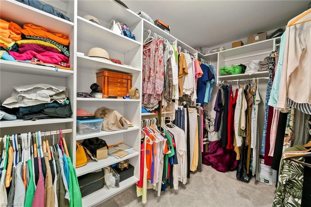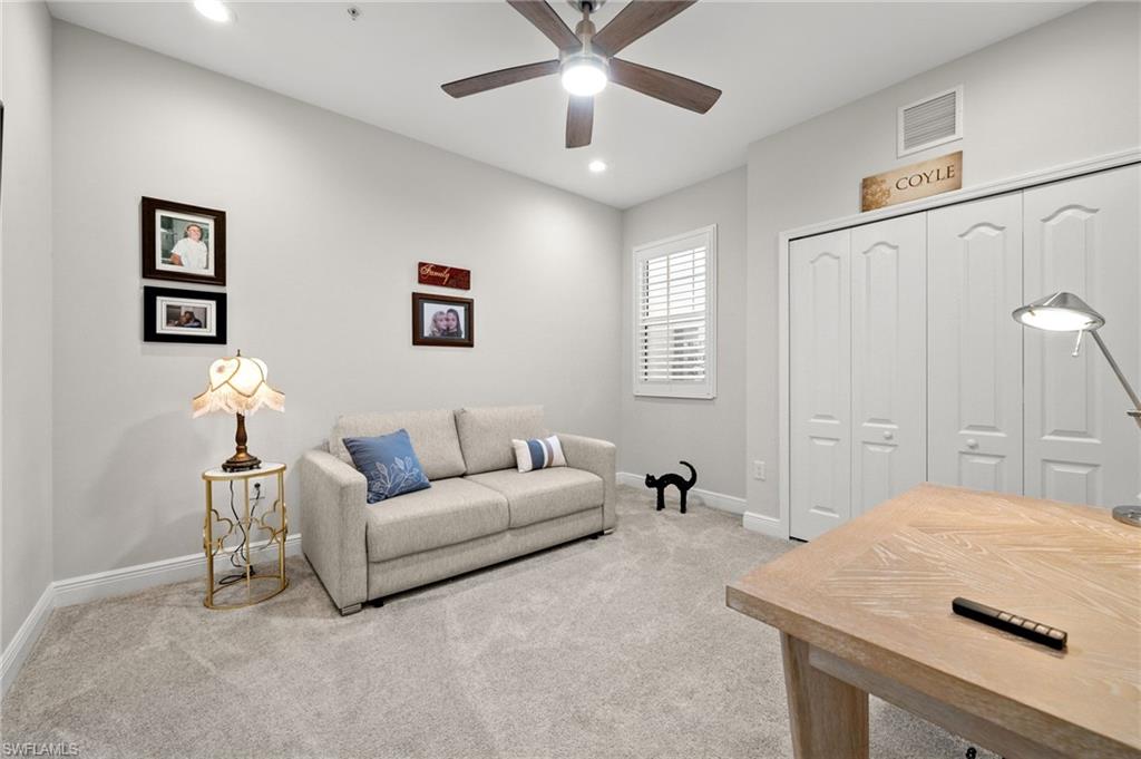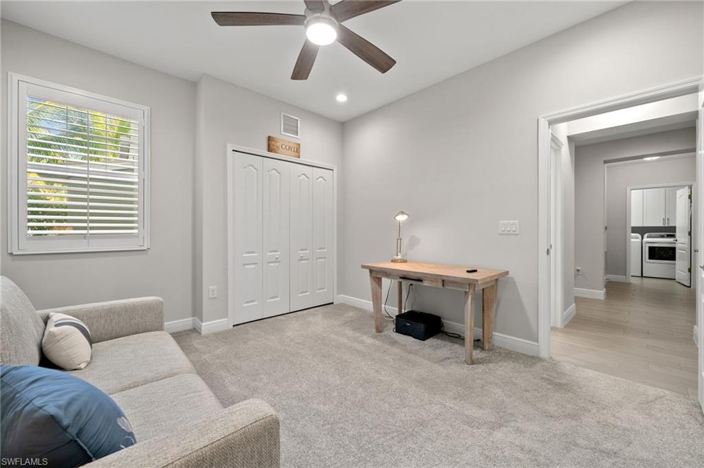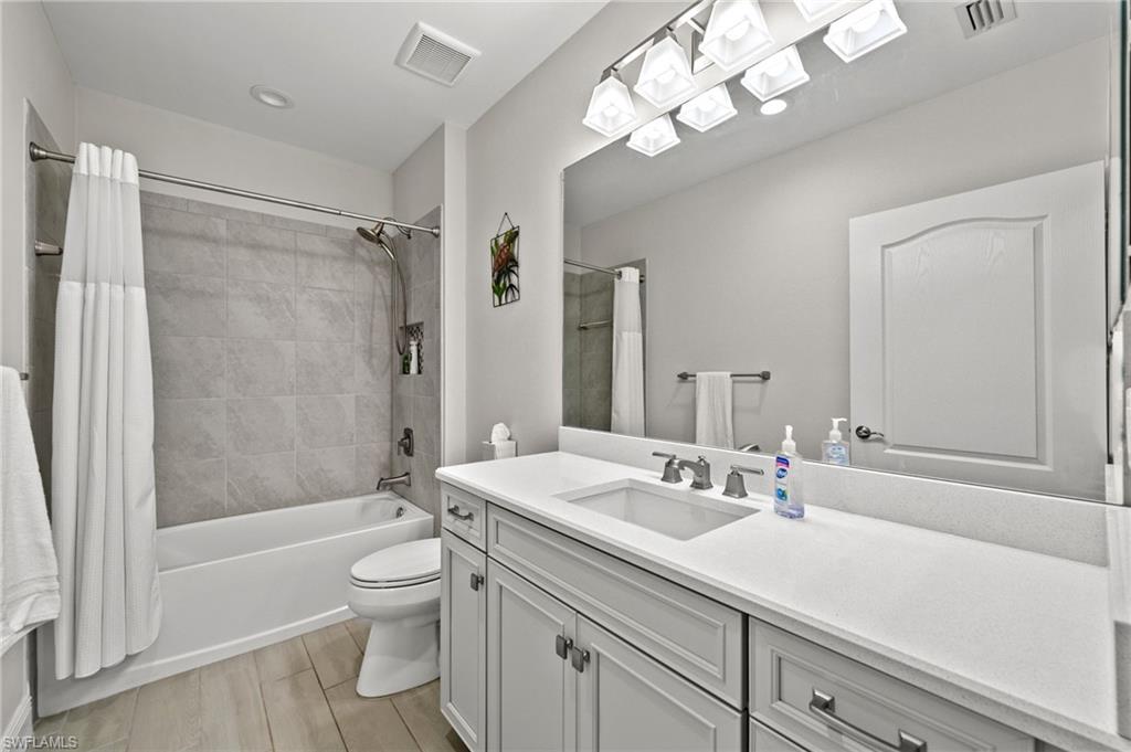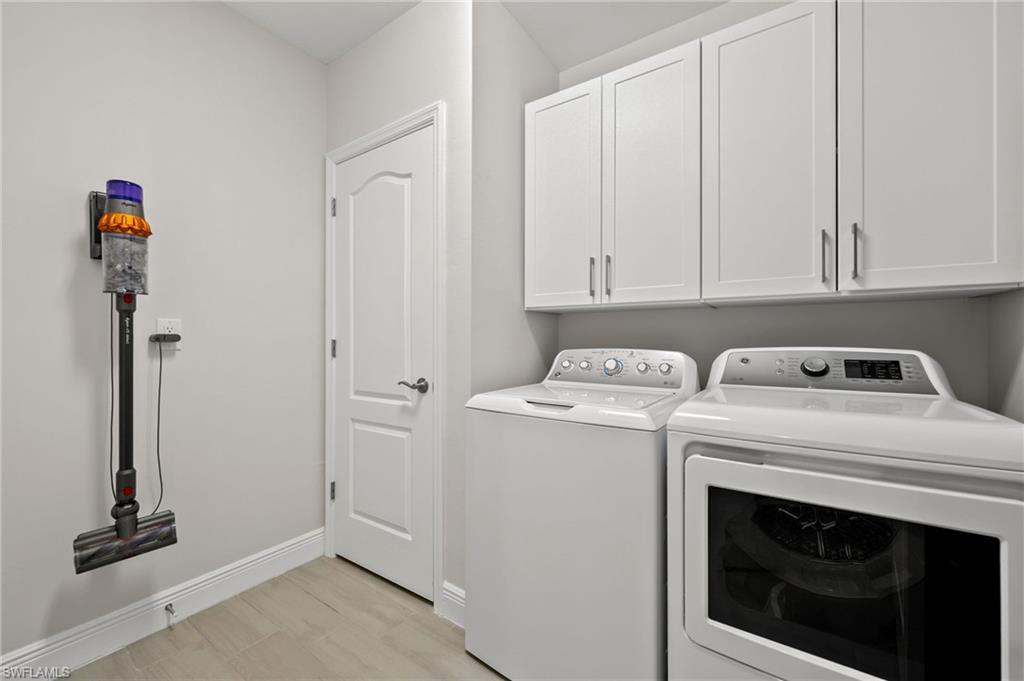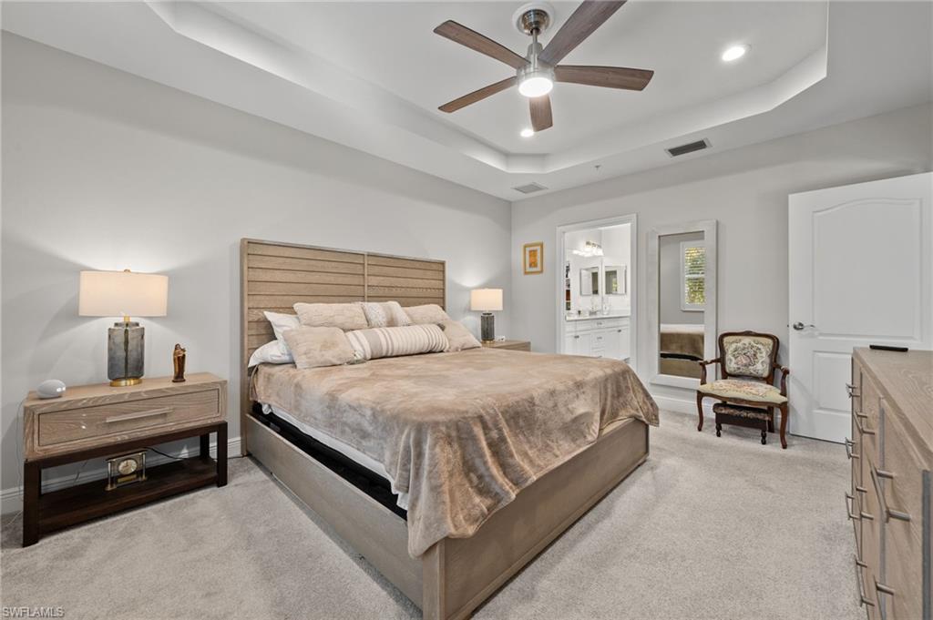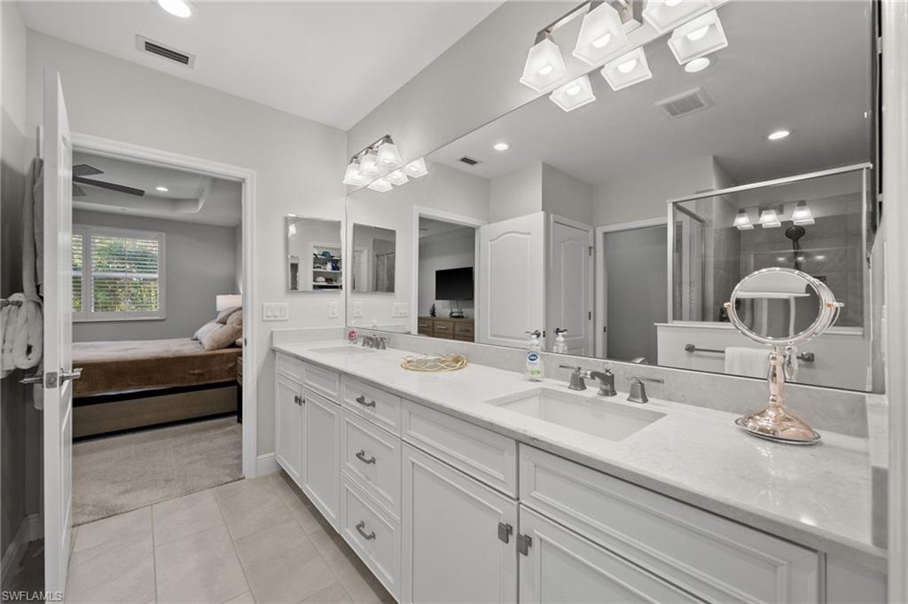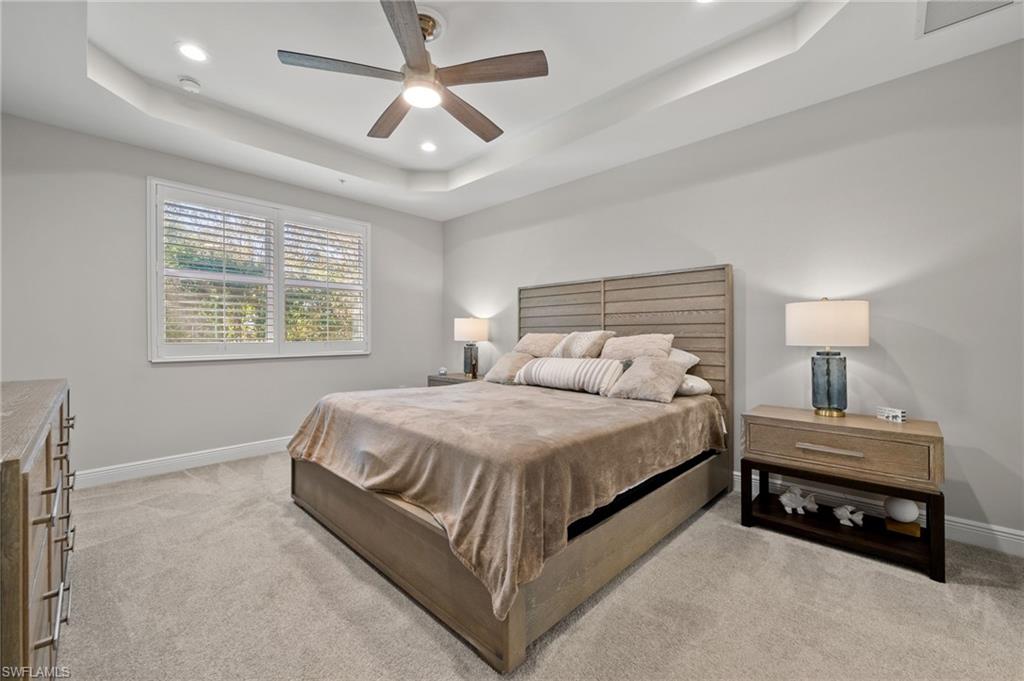 Welcome to Richmond Park, a highly sought-after boutique community in North Naples that offers an exclusive and tranquil living experience. This beautifully designed and meticulously maintained 2-bedroom, 2-bathroom coach home, built in 2021 by Neal Communities, boasts 1,779 square feet of thoughtfully planned living space, creating the perfect balance of elegance and functionality. As you step inside, you're greeted by an expansive great room, bathed in natural light thanks to its Southern rear exposure. The open floor plan seamlessly connects the main living areas, offering an inviting atmosphere for relaxing or entertaining. Modern plank tile flooring throughout the living spaces enhances the sophisticated feel, while plush carpeting in the bedrooms provides added comfort. At the heart of the home, the gourmet kitchen is a standout feature, designed to impress. It boasts white shaker cabinets, high-end stainless steel appliances, stunning quartz countertops, a stylish tile backsplash, and upgraded lighting—an ideal space for cooking and gathering. Storage is plentiful throughout, with a large walk-in finished closet in the primary suite, built-in closets in the laundry room, and overhead shelving in the garage—ensuring you have a dedicated space for all your essentials. The primary bedroom is a luxurious retreat, offering an ensuite bath with an elegant tile and stone shower and dual vanities, adding a spa-like touch to everyday living. Outdoor enjoyment is effortless with your private screened lanai, a serene retreat backing up to a peaceful grove of trees, offering a sense of seclusion and tranquility. Whether enjoying a morning coffee or an evening glass of wine, this space is perfect for relaxation. The home’s exterior is equally impressive, featuring a paver driveway and walkway, a durable tile roof, and lush tropical landscaping, contributing to fantastic curb appeal. Impact-resistant windows and sliding doors enhance safety, energy efficiency, and peace of mind. Situated in Richmond Park, a community of just 104 coach homes, residents enjoy a private and intimate setting while being moments away from the vibrant Founders Square. This prime location provides easy access to dining, shopping, and entertainment, making everyday life effortless. If you're searching for a home that combines modern elegance, thoughtful design, and an unbeatable location, this Richmond Park coach home is a must-see. Don’t miss this rare opportunity to experience luxury living in North Naples.