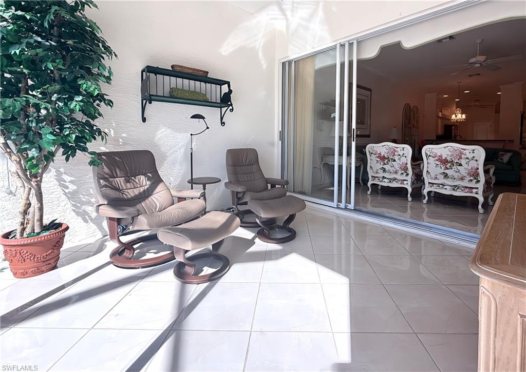 Beautiful 2 BR + DEN Villa Naples Heritage Golf and Country Club! Immediate golf membership ... 2 car garage! Move-in-ready, this beautifully furnished home is being offered turnkey. Upon entry, you'll notice the spotless porcelain tile flooring throughout main living areas. The kitchen has been updated and features beautiful granite counter tops, custom stone backsplash, under cabinet lighting and Kitchen Aide stainless steel appliances. The breakfast room/eat in kitchen boast built in storage cabinets with granite countertop. Dining room is open to main living room. Double doors enclose a den which is located just off main living area and can double as a home office or third bedroom when needed. Spacious primary suite offers a large walk in closet, updated dual sink vanity with granite counter tops, custom tile walk in shower, separate tub and water closet for privacy. Guest bedroom is split from primary bedroom for added privacy. Updated guest bath has custom tile walk in shower with glass doors. Current homeowner enlarge heated/cooled living space by enclosing the covered lanai. This added flex room is an ideal space to relax while looking out to the golf course and water. Outside extended screened lanai provides is optional area to entertain friends. Lanai has plenty of space for grilling out, dining and multiple conversation areas. Lives like a single family home without all the maintenance. Naples Heritage is premier bundled golf community with 18 hole golf course, driving range, putting green, resort style pool w/ cabana bar for poolside dining, tennis complex, fitness center and pickleball courts. Naples Heritage is an active community with a full social calendar of events members enjoy throughout the year. The community is conveniently located just 15 minutes from downtown Naples and beaches. Also extremely convenient to I-75 and Marco Island.