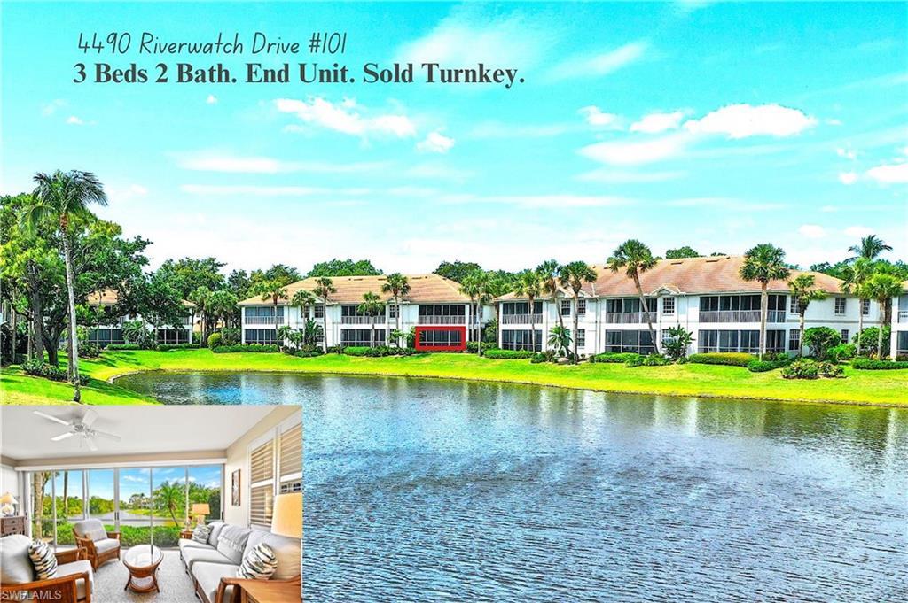 Price Improvement & worth a look! One of the nicest first floor units in Bonita Bay. LONG LAKE VIEWS where nothing is out of place. END UNIT, SOLD TURNKEY and NO INTERIOR FLOODING DURING IAN, HELENE OR MILTON due to higher elevation. 4490 Riverwatch Dr #101 feels like home the moment you step inside and with three bedrooms and two full baths, it’s the perfect size. You will notice the refurbished bamboo floors (March 2025), the tasteful furniture, and pride of ownership as it’s SPOTLESS! The kitchen has updated stainless steel appliances, a functional breakfast bar, complete with amazing lake views. Fresh paint and a comfortable dining and living room are great for entertaining. This unit is light and airy with great natural light soaking in from the lanai and large northern windows. A unique benefit of being an END UNIT. The lanai faces east, is fully enclosed and the thresholds have been removed—the flooring effortlessly flows—making the space feel open and inviting as if you were ON THE WATER! AND, buy with confidence knowing that this unit experienced NO INTERIOR FLOODING during any of the hurricanes. The added ground elevation (certificate available 10.5') makes this unit valuable and desired for those looking for first floor living. If you’re looking for a CLEAN, FIRST FLOOR, TURNKEY UNIT that offers AMAZING VIEWS, 4490 Riverwatch Drive #101 is for you. Just bring your personal touches to call this home. Residents of Bonita Bay enjoy 12 miles of walking/ biking trails, bocce, outdoor gym, pickleball, tennis, canoe/kayaking, boat launch, and three on site parks, as well as a private beach park with in-season shuttle all included in the HOA. Check out the renderings of the gorgeous new beach facilities with an anticipated opening in summer 2025. OPTIONAL membership to Bonita Bay Club, one of Southwest Florida's premier golf communities, offering an active country club lifestyle, five of championship golf courses and state-of-the-art amenities.