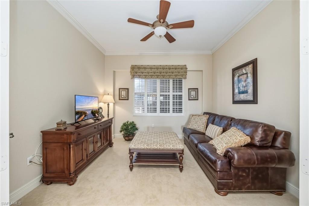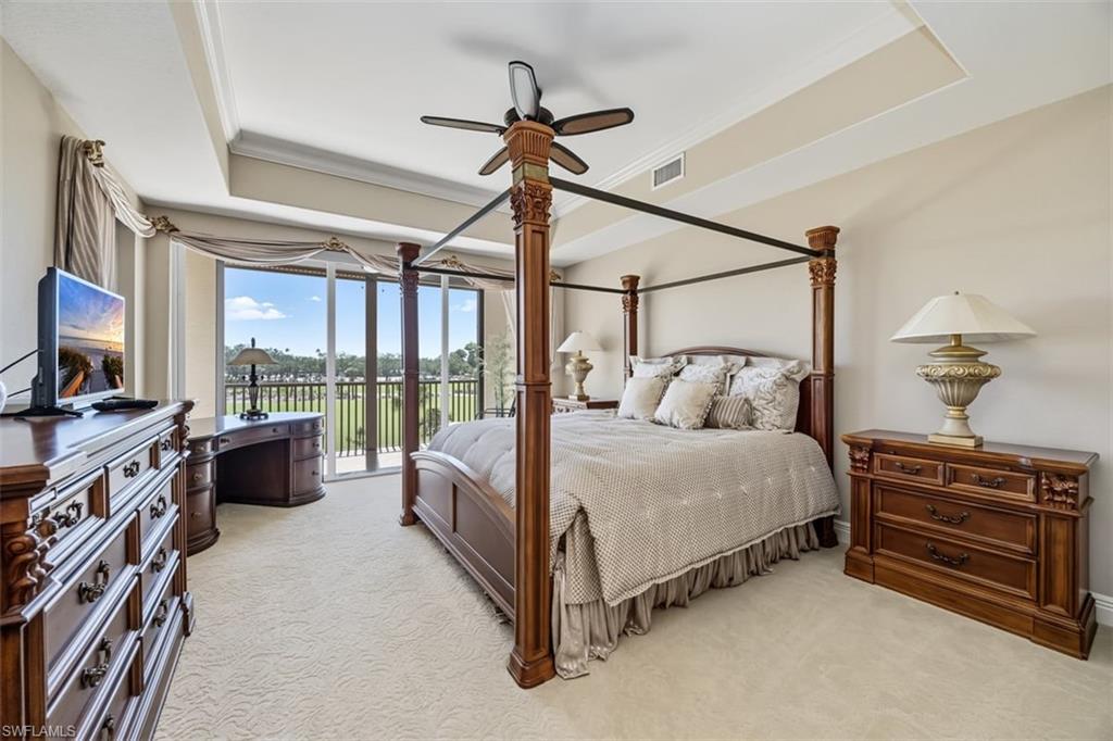 Enjoy sweeping golf course and lake views from this 2-bedroom plus den (which can function as a 3rd bedroom) residence in Vista Pointe at the Vineyards. With over 2,400 sq. ft. under air, this desirable floor plan features high ceilings, marble flooring, granite countertops, 2.5 baths, and a spacious primary suite with walk-in closet, dual sinks, soaking tub, and oversized shower. Additional highlights include plantation shutters, ensuite guest bedroom, crown molding, and a large, screened lanai ideal for entertaining. Property is being offered Turnkey Furnished and is move in Ready! Vista Pointe offers a gated entrance, secured lobby with elevators, storage, and two enclosed garage spaces. Residents enjoy a resort-style pool with waterfalls, fitness room, community room, and more. The property is professionally managed, with an on-site manager available weekday at the Vista Pointe Clubhouse. The Vineyards Country Club membership is optional and offers two tiers of membership. The Club is within walking distance and features a state-of-the-art Wellness Center and Spa, Tennis Complex, and an 80,000-square-foot clubhouse. Members enjoy 36 holes of championship golf, fine and casual dining, an aqua pool area with sundeck and poolside restaurant service, as well as bocce courts, pickleball courts, and outdoor gas fire pits. Come experience the exceptional lifestyle offered at Vista Pointe in The Vineyards.