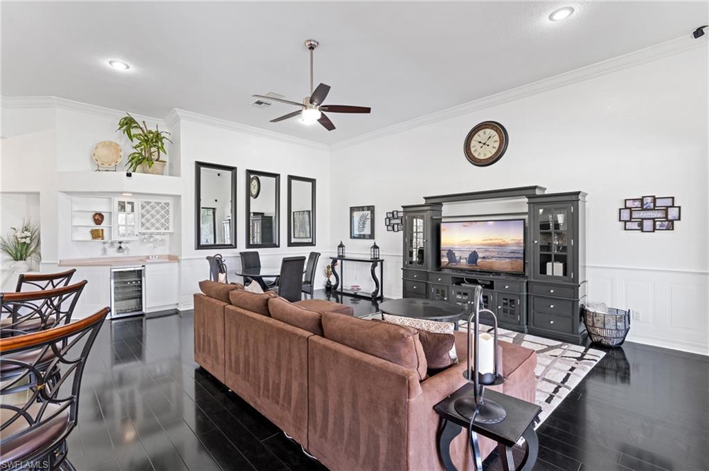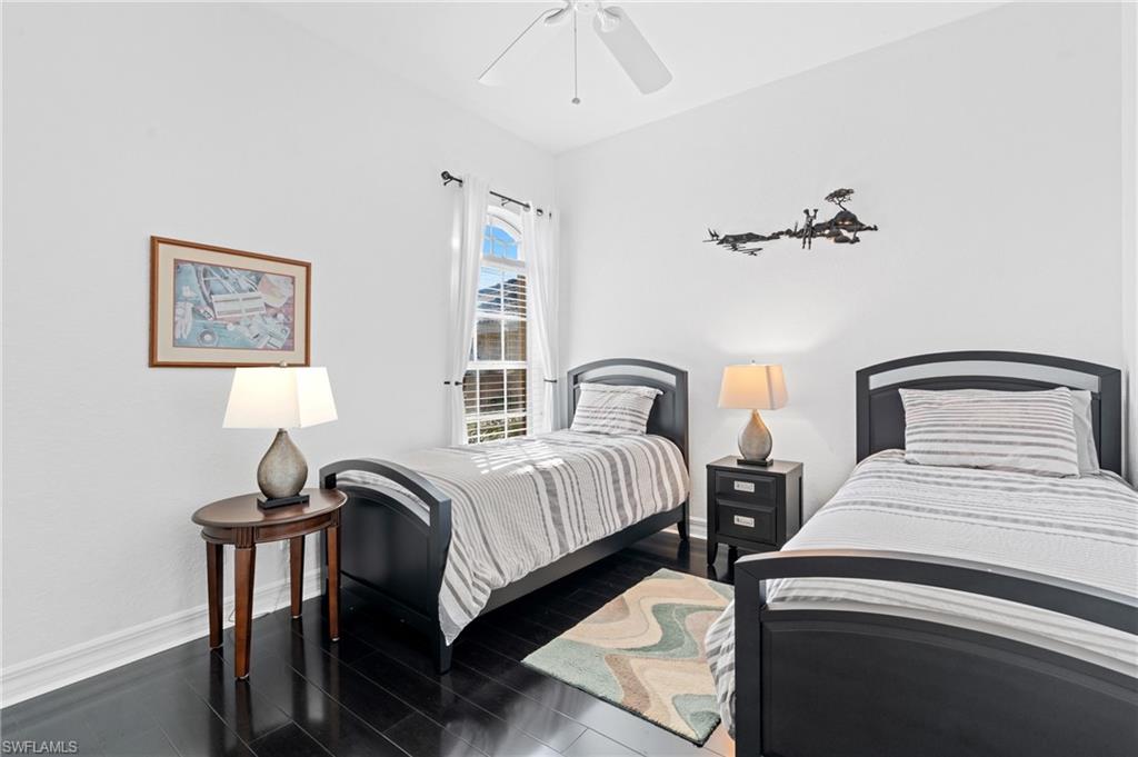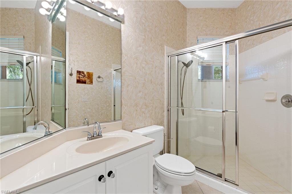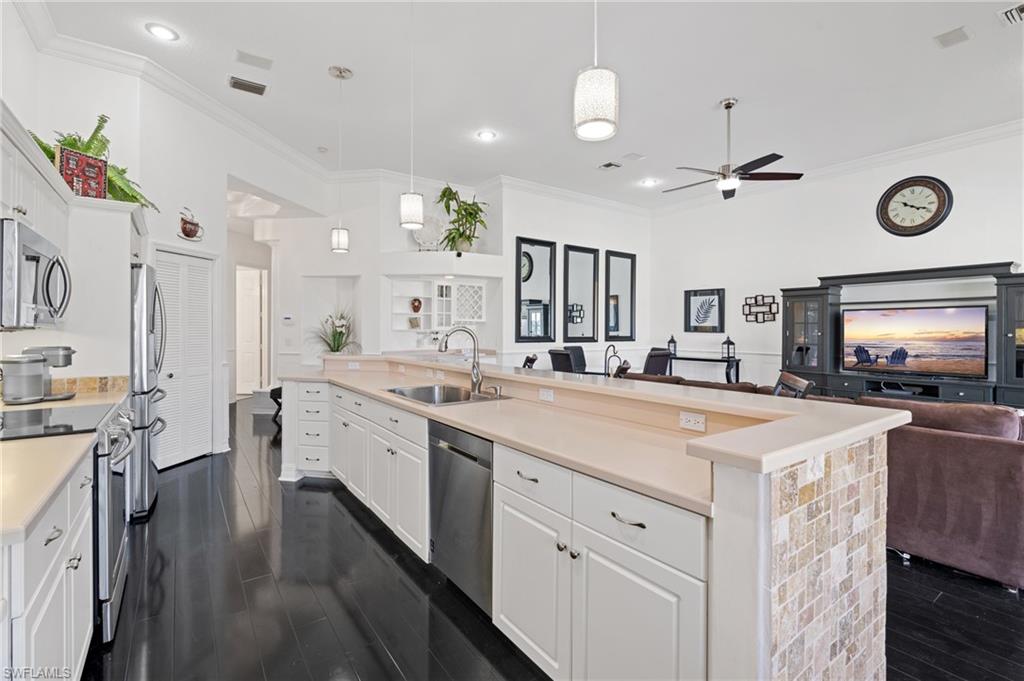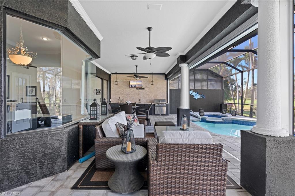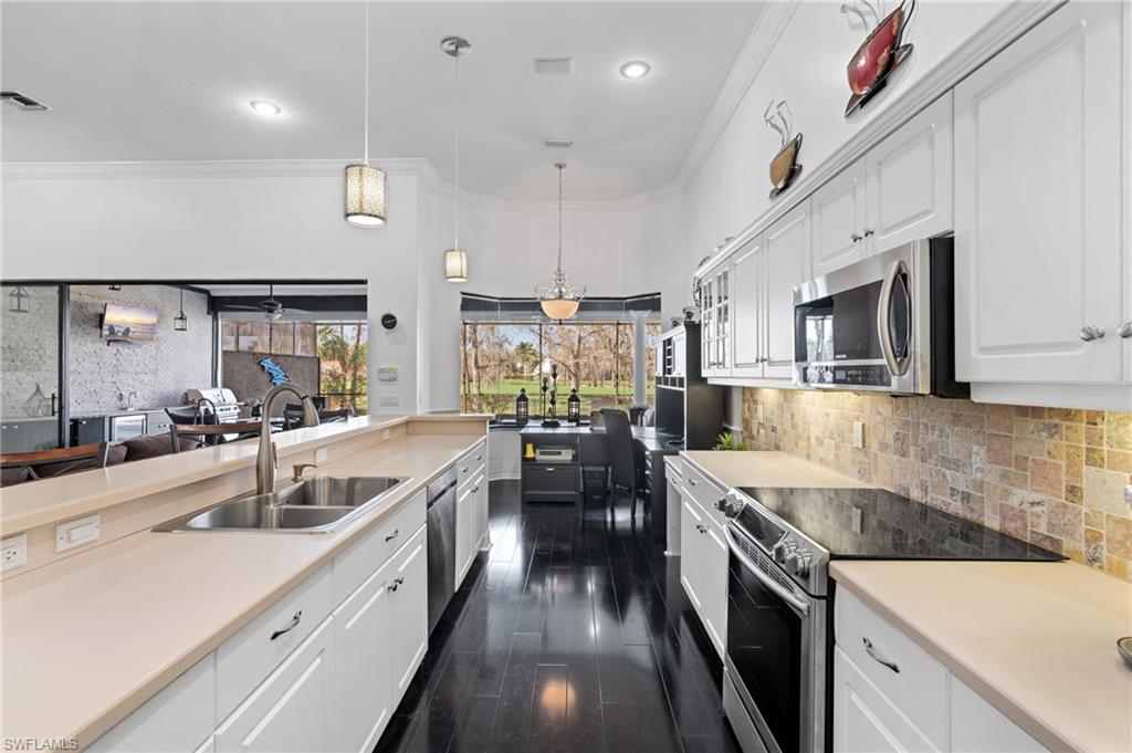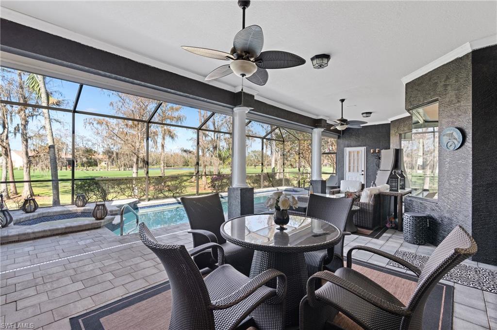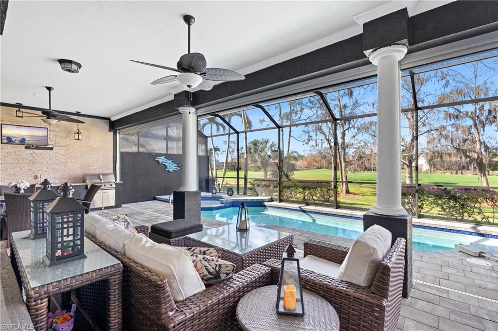 This 3 bedroom, 3 full and 1/2 bath attached villa pool/spa property lives like a single family home. A few updates are the beautifully engineered wood flooring throughout and the refurnished pool/spa. A new pool heater was installed in Dec. 2024. Exterior freshly painted in the spring of 2025. The new roof was installed in 2018. The kitchen stone backsplash is neutral in color and was also installed under the breakfast bar for a nice accent. The property is being sold turnkey for the convenience of both sellers & buyers. Being situated on the 14th fairway of the Arnold Palmer Signature 18 hole golf course provides a beautiful view of the fairway and approach to the green. The 1/2 bath is located on the lanai and serves as a pool bath for convenience. Along with the golf course, Wildcat Run offers tennis, pickleball, bocce and the state of the art fitness center which is fully staffed by a professional certified trainer. Two restaurants on campus allow you to enjoy lunch and dinner in the Grillroom with indoor/outdoor seating or dinner in the Clubhouse for a more formal atmosphere. Outdoor gathering is a popular spot when meeting up with friends after your day of activities. Wildcat Run is convenient to 3 large shopping malls, fine & casual dining, SWFL International airport and white sandy Gulf beaches.
