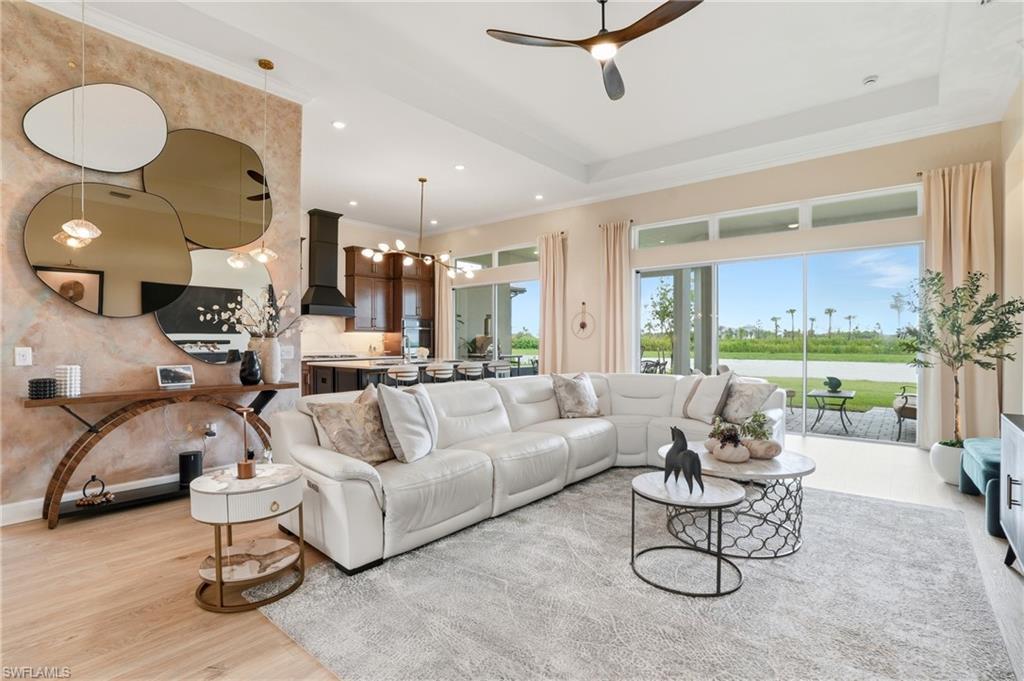Welcome to 15445 Turin Drive, an exceptional 2,941-square-foot residence in the highly sought- after Esplanade by the Islands. Showcasing the desirable Lincoln floor plan — no longer offered by the developer — this home perfectly blends elegant design, modern comfort, and the relaxed Naples lifestyle. Step inside to discover an open-concept layout with soaring 12-foot ceilings, rising to 13 feet within one of five beautifully detailed tray ceilings thoughtfully placed throughout the home. Expansive eight-foot sliders invite natural light into the living areas, highlighting the home’s spacious and sophisticated design. At the heart of the home, the gourmet kitchen features built-in appliances, a large island with two-sided storage, quartz countertops, and a custom hand-painted backsplash. Additional features include an undermount single-bowl sink, walk-in pantry, and an extra-large butler’s pantry, providing abundant storage and prep space. The dining room includes a built-in bar or buffet, ideal for entertaining, while crown molding throughout the main living areas adds a refined touch. The owner’s suite is a true retreat with two walk-in closets and an ensuite bathroom featuring dual sinks and an extra-large shower with tile extending to the ceiling. Each guest bathroom also features floor-to-ceiling tile for a consistent touch of luxury. The study offers flexibility — ideal as a home office, media space, or flex room. Additional highlights include impact glass on the front of the home and pool bath, energy- efficient windows, smart home technology, and pre-wiring for Vitek. Outdoor living is equally impressive, with an extended covered patio designed to capture stunning sunsets over the peaceful lake. A gas line rough-in on the privacy wall allows for a custom outdoor kitchen, and there’s ample room to design your own pool. The three-car side- load garage completes this extraordinary home. Experience refined Florida living in Esplanade by the Islands, where luxury, comfort, and lifestyle come together seamlessly.