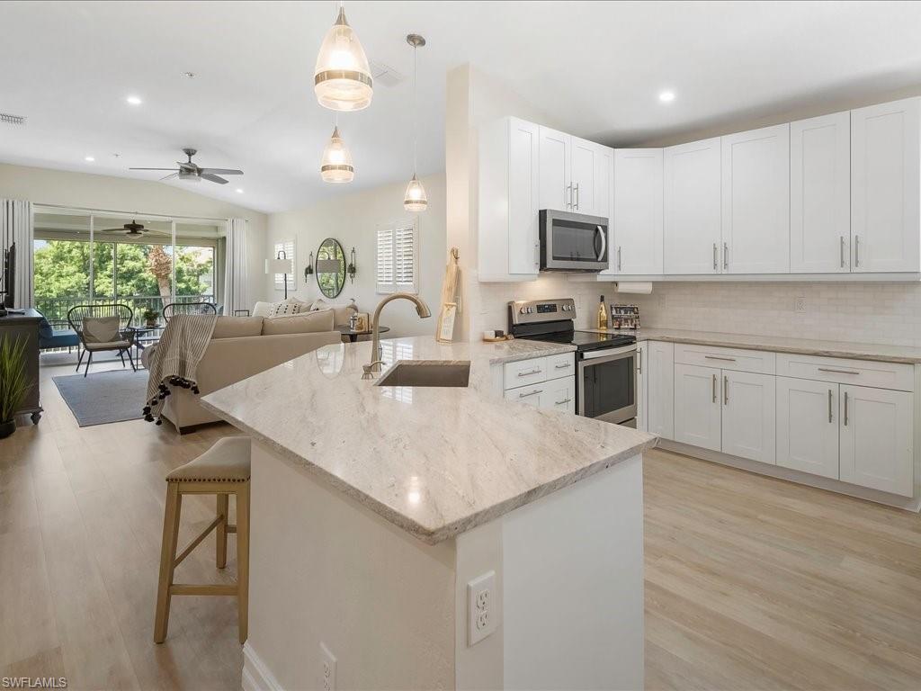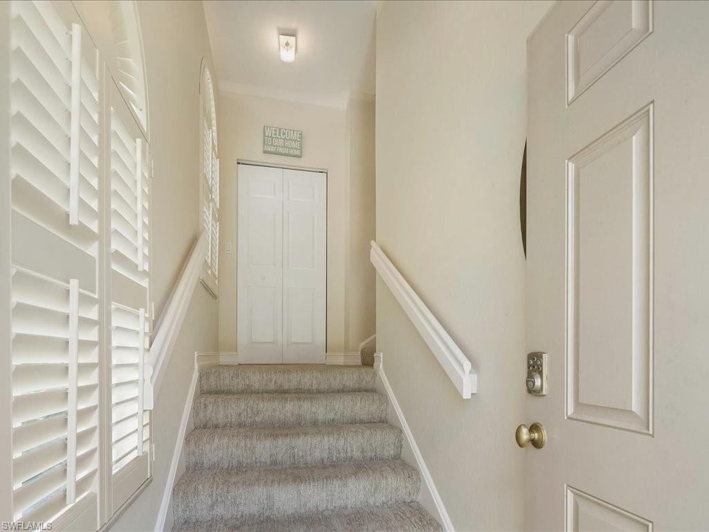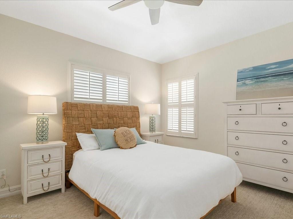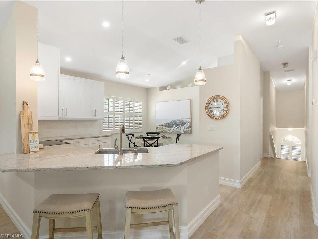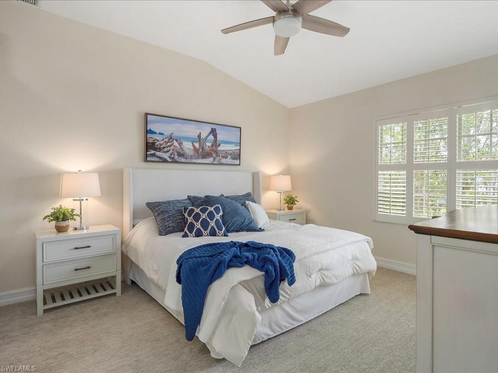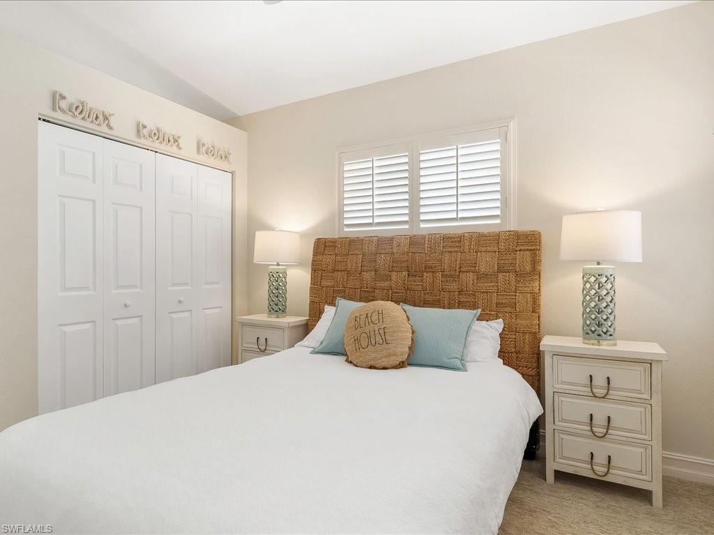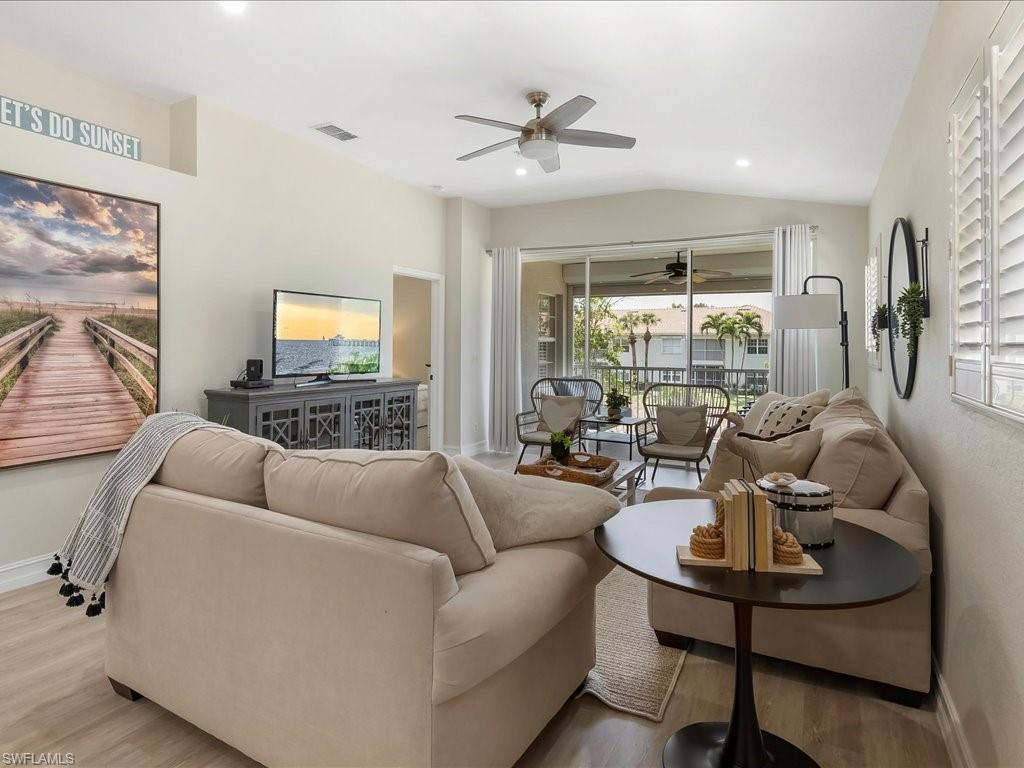 Welcome to your Naples oasis! This beautifully updated 3-bedroom, 2-bathroom lakeside condo is located in the highly desirable gated community of Calusa Bay, where residents enjoy a blend of comfort, convenience, and resort-style amenities. As a corner unit, this home is filled with natural light, creating a warm and inviting atmosphere that highlights its open design, high ceilings, and thoughtful finishes. Plantation shutters add timeless elegance, while electric hurricane shutters provide both security and peace of mind. Step inside to discover a home that has been meticulously maintained and recently upgraded to ensure modern living at its best. A full renovation of cabinetry and CoreTec flooring was completed in 2019, followed by additional improvements including a new A/C system (2021), water heater (2022), remodeled guest bath shower (2022), two new toilets, new dryer (2023), and plush new carpeting (2024). Every upgrade has been chosen with care, so you can move right in and start enjoying all that Naples has to offer. Living in Calusa Bay means enjoying unmatched amenities: two sparkling swimming pools (including a lap pool and a resort-style pool with sun deck), a fitness center, clubhouse for social gatherings, tennis courts, and scenic walking and biking trails that wind throughout the community. Your HOA fees also include fiber optic internet, cable, water, sewer, pest control, landscaping, and building maintenance—all designed to make life easy and carefree. A detached garage adds to the convenience and functionality of this exceptional condo. And then, there’s the location. Just a short drive away are the world-renowned white sand beaches of Naples, where Gulf sunsets are nothing short of spectacular. You’ll be minutes from the upscale shopping, dining, and nightlife of Mercato, as well as endless cultural experiences, art galleries, and outdoor adventures. Whether you’re a beachgoer, a foodie, a golfer, or someone who simply enjoys the Southwest Florida lifestyle, this location puts you at the center of it all. Furniture is negotiable, giving you the flexibility to move in with ease. Whether as your year-round residence, seasonal retreat, or investment property, this lakeside condo offers the perfect combination of luxury, convenience, and location in one of Naples’ most beloved communities.