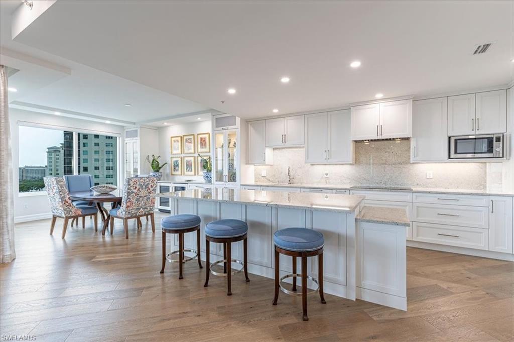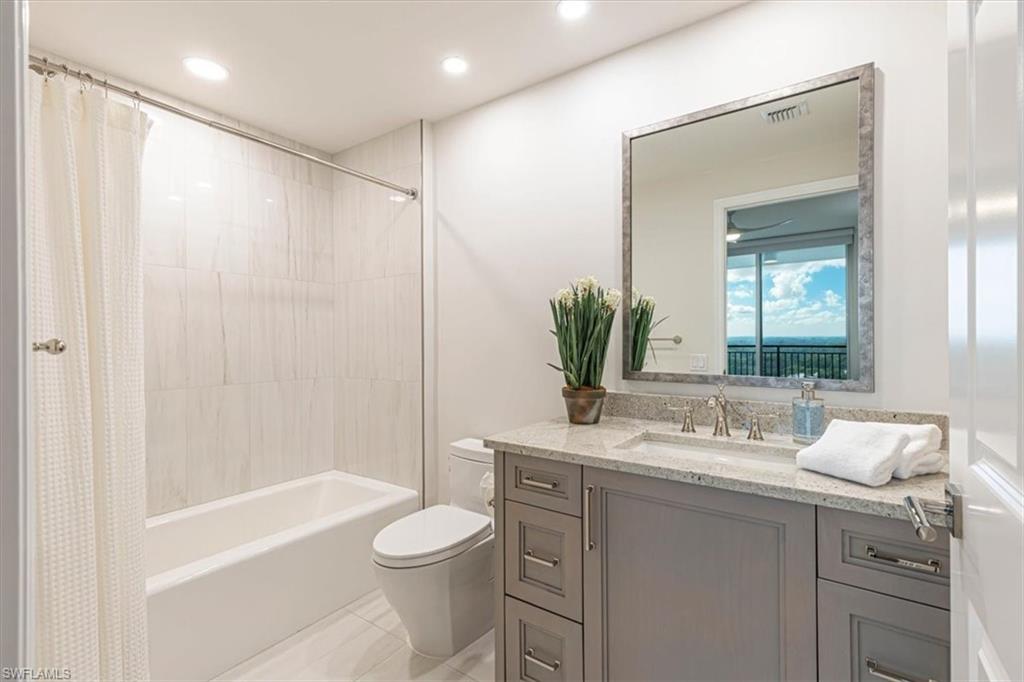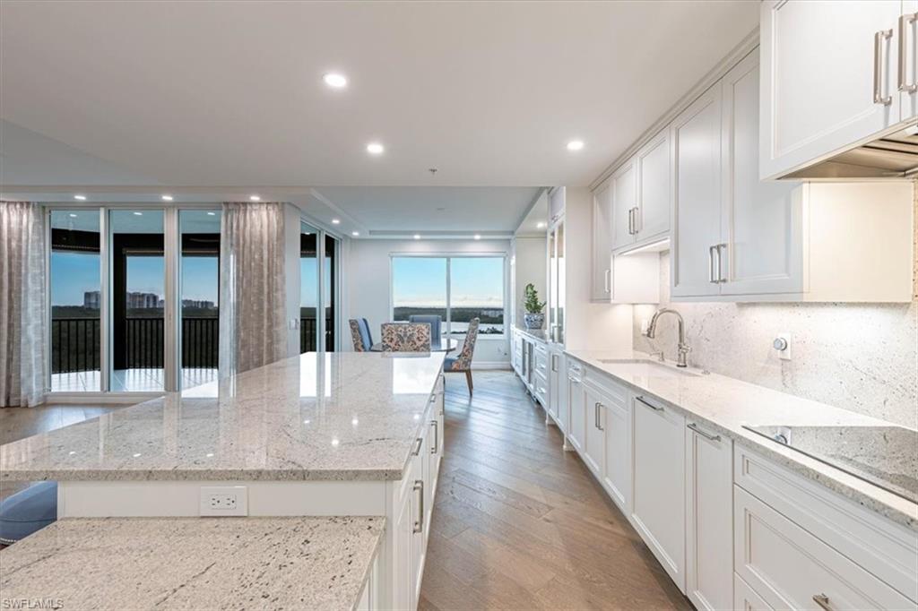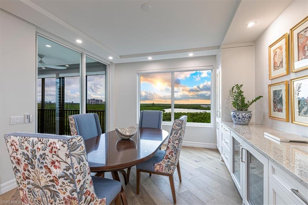 Experience refined coastal living in this fully renovated 9th-floor residence at Montego in Cove Towers Preserve. A private elevator opens to an elegant foyer and a reimagined wide-open floorplan, where the former kitchen wall was removed to create seamless living, dining, and entertaining spaces. The designer kitchen features a built-in Sub-Zero refrigerator/freezer, Thermador steam-convection oven & induction cooktop, and high-end fixtures. Volume ceilings and floor-to-ceiling glass frame out the sweeping southwest views across the mangroves to the Gulf, and extending to an expansive screened in terrace with electronic storm shutters. The split bedroom layout includes two guest suites opening to a private balcony with long views over the new Kinsale Golf Club. Every closet is finished with custom cabinetry, and all baths were fully renovated with premium fixtures and Toto toilets. Additional highlights include new wood flooring throughout, tile in the baths, and impact-resistant windows. Plus two prime garage spaces and a storage locker. Residents of Montego & Nevis can enjoy the Calypso Club which features a resort-style pool & spa, outdoor pavilion with fireplace & grills, social room & activities, fitness center, and two guest suites. Optional Tarpon Cove Yacht Club membership expands the lifestyle with dining, tiki bar, pool, tennis, pickleball, and a boat shuttle to Delnor-Wiggins State Park. Boat slips are available for purchase or lease. Enjoy this polished Naples retreat where luxury, privacy, and panoramic views meet.