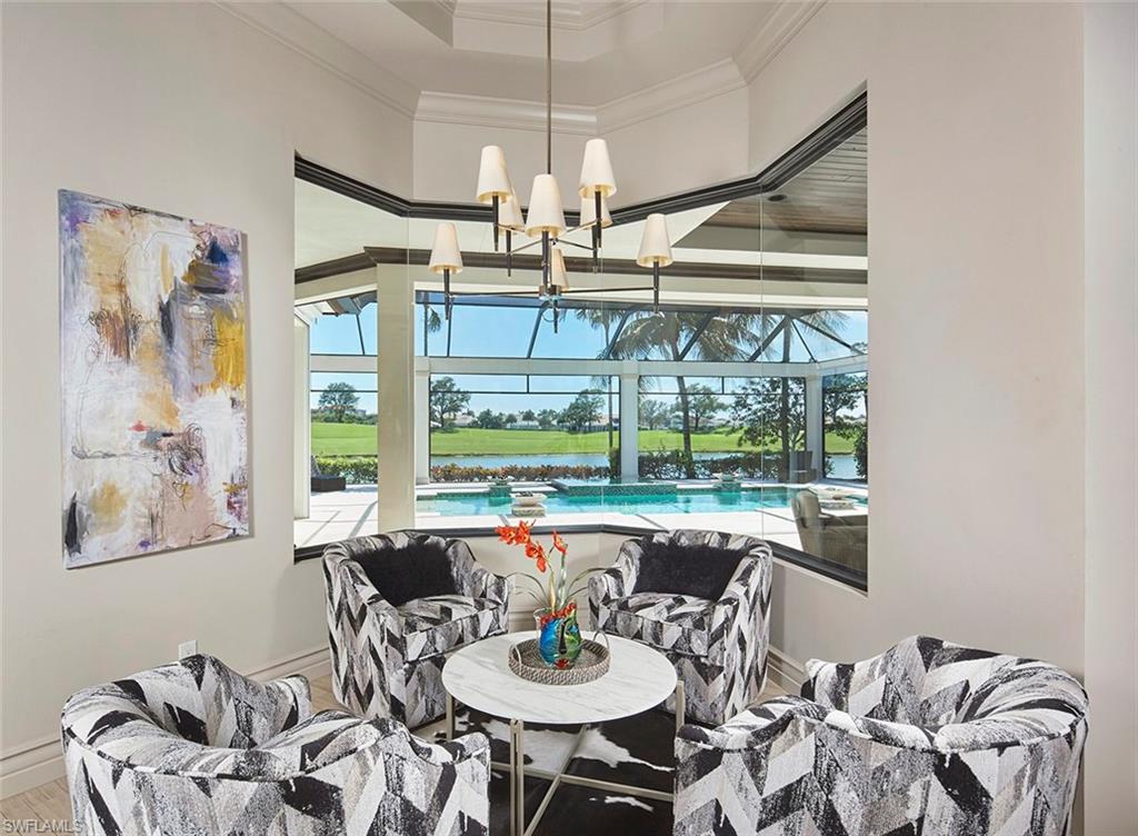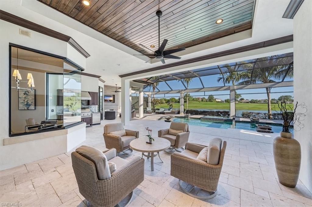 IMMEDIATE GOLF MEMBERSHIP with golf cart. A southern exposure, Model-home provenance on one of the most desirable street in Talis Park, this 3-bedroom with den/office/flex space coastal retreat presents a 180° panorama across a shimmering pond—where bald eagles and pelicans dip into for a bite—sitting on the Newly resurfaced Dye/Norman–overviewing of the 8th fairway, setting a distinctly Resort tone. Inside, 14-foot vaulted ceilings and expansive glass bathe the interiors in natural light, while an entertainer’s kitchen—with double islands, double wall ovens, and refined designer finishes—flows seamlessly into a 29'×20' great room with floor to ceiling glass sliders giving Florida living at its best, full bar, and dining area; the private owner’s suite offers a generous bath & separate dual headed shower area, complemented by two en-suite guest rooms, all with walk-in closets, and a discreet office/den/flex space room . Beyond, a screened outdoor pavilion presents two lounge areas anchored by a fireplace/TV and a well-appointed summer kitchen with dining , all overlooking a pool SECLUDED from "cart paths" with a pond view for rare privacy; three Air-conditioned garage bays with custom built cabinets , newly electronic Auto/wifi CAT-5 Hurricane shutterblinds, Brand new whole house generac generator, pool heater & main AC has been replace last year, completes this residence. Home being sold furnished.