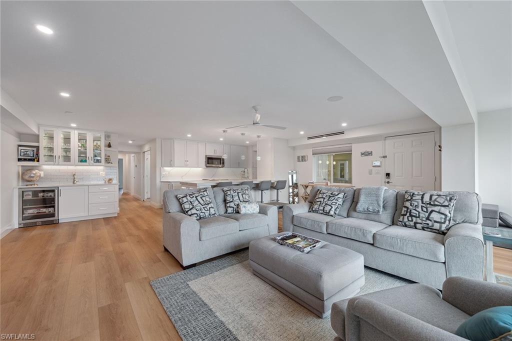 This updated third-floor, three-bedroom home offers stunning views of Moorings Bay. Conveniently located across from beach access, you can spend your days basking in the sunshine and end the day watching the colorful sunset. This newly remodeled unit features luxury vinyl plank flooring throughout, a smart home control panel, in-unit laundry, a west-facing open-air private balcony off the primary bedroom with Gulf views, and much more. Enjoy this bay-front residence featuring a wall of impact glass sliders designed to maximize the view. The kitchen is equipped with Lincoln quartz countertops and backsplash, a large island with bar seating that is perfect for entertaining guests, Bosch appliances and a wet bar complete with a wine cooler. Harbour Cove residents enjoy a peaceful bay-front pool, grills, and on-site boat slips that can be leased through the association. Owners can lease their units three times a year with a 60-day minimum. Located on Gulf Shore Boulevard, just north of Harbour Drive, it's a quick bike ride to the private Moorings Beach Park or the renowned shopping and dining at Venetian Village.