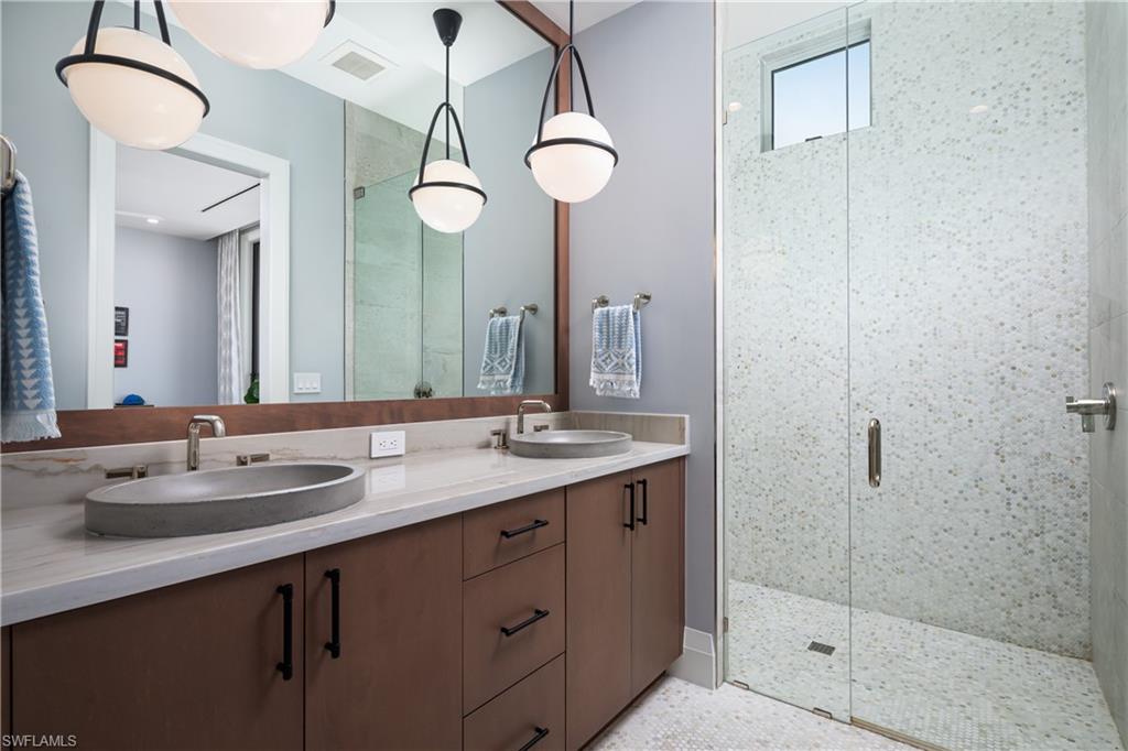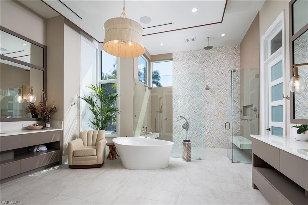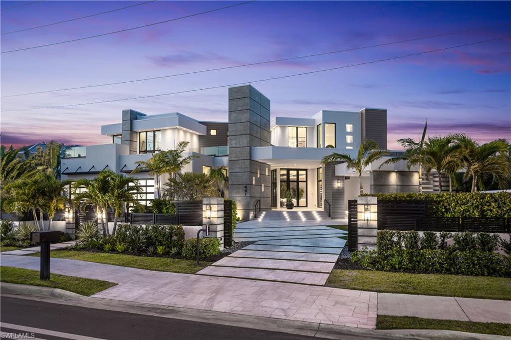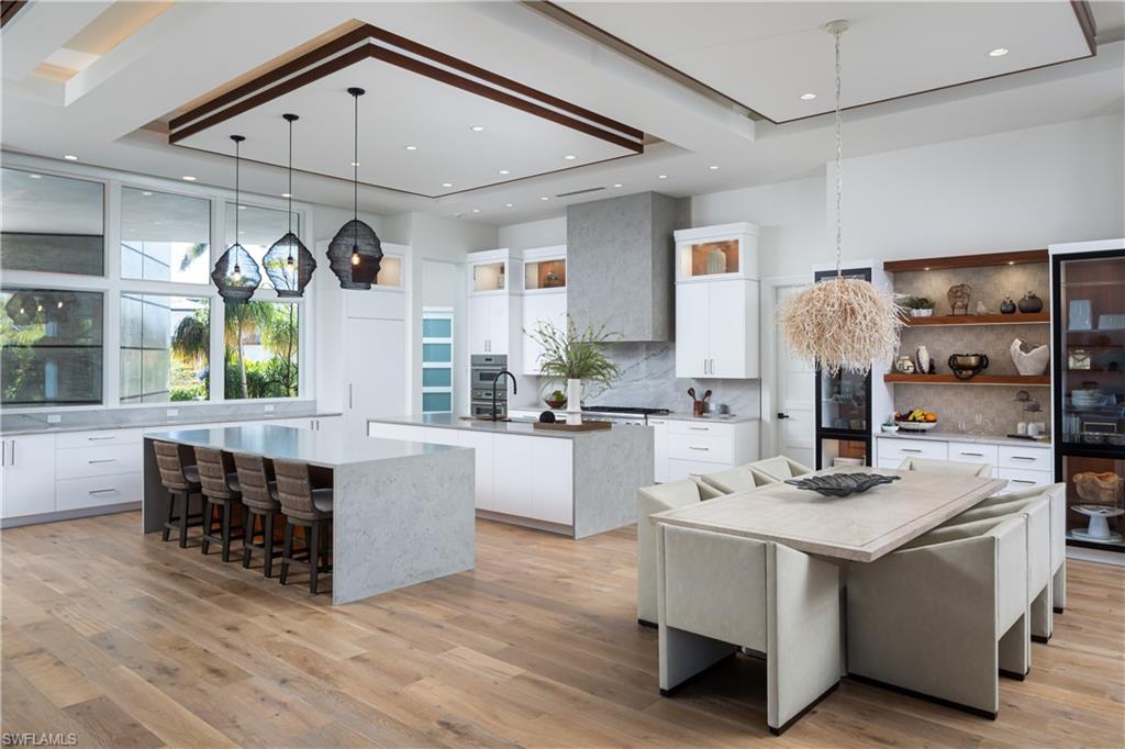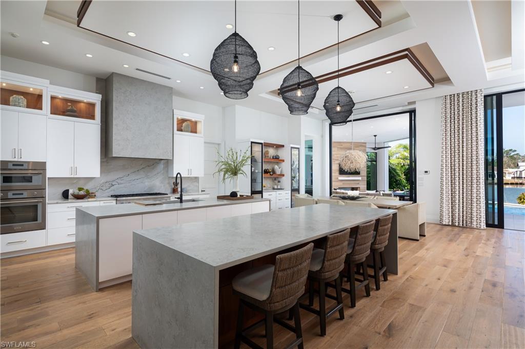One-of-a-kind masterpiece built in December 2022 (nearly 2023) in the highly sought-after Moorings neighborhood of Naples with breathtaking bay views. Just a 10-minute walk (0.4 miles) to the beach, this architectural marvel offers an unparalleled coastal living experience. As a Moorings resident, you are eligible for membership (at a very low cost) to the exclusive Moorings Beach Park for effortless beach access. This modern estate was custom-built by the award-winning Potter Homes & expertly designed by Adelyn Charles Interior. Designed for the utmost privacy & exclusivity featuring electric motorized entry gates, a solid fortress-like construction of all concrete block, hurricane impact windows/doors throughout & electric hurricane shutters. Every aspect of this property has been crafted with the finest materials & attention to detail, including stunning oak flooring, reverse tray ceilings with wood paneling/uplighting & soaring 14-ft ceilings. Part of the exclusive “Golden 50” in the Moorings, with direct, bridge-free access to the Gulf in just 5 minutes via Doctors Pass. For boating enthusiasts, the home is equipped with dual lifts—one featuring a 30 ft boat lift with a 16,000 lb weight capacity, and the other for dual jet skis. The outdoor living space is a true paradise, with a luxurious pool and spa, fireplace, sun deck with built-in firepit, and a fully equipped summer kitchen perfect for al fresco dining. With 12 ft pocketing floor-to-ceiling sliders, the space effortlessly blends the interior and exterior for seamless waterfront living. Inside, this expansive estate offers 6,900 sq ft under air with 6 bedrooms, 6 full bathrooms (all with dual vanities), 3 half baths, a separate guest house, 3 laundry rooms & a 3-car garage. The state-of-the-art kitchen is a chef’s dream, with custom white cabinetry, dual wood islands with waterfall concrete overlays, high-end Thermador appliances & a butler’s pantry. The main-level primary suite is a private retreat, complete with custom wood ceilings, a wet bar, massive walk-in closets, and a spa-like bathroom with dual vanities, dual water closets, a generous shower with multiple showerheads, dual benches & a separate soaking tub. Upstairs, a spacious living room area with a wet bar, island with bar seating & 3 bedrooms create the perfect space for relaxation, while a sundeck provides breathtaking water views. For ultimate guest privacy, the separate guest villa offers a bedroom, ensuite bathroom, laundry room, full kitchen & private sundeck—ideal for hosting guests. Another highlight of this home is the rooftop observation deck offering sweeping views of the Gulf & Bay—perfect for sunset vistas. Additional features include a private elevator, buried gas propane tank, electric screens, lush landscaping, a spacious front yard ideal for pets & more. An extraordinary sanctuary in one of Naples' most coveted communities, The Moorings, this residence is truly a showcase of visionary design.