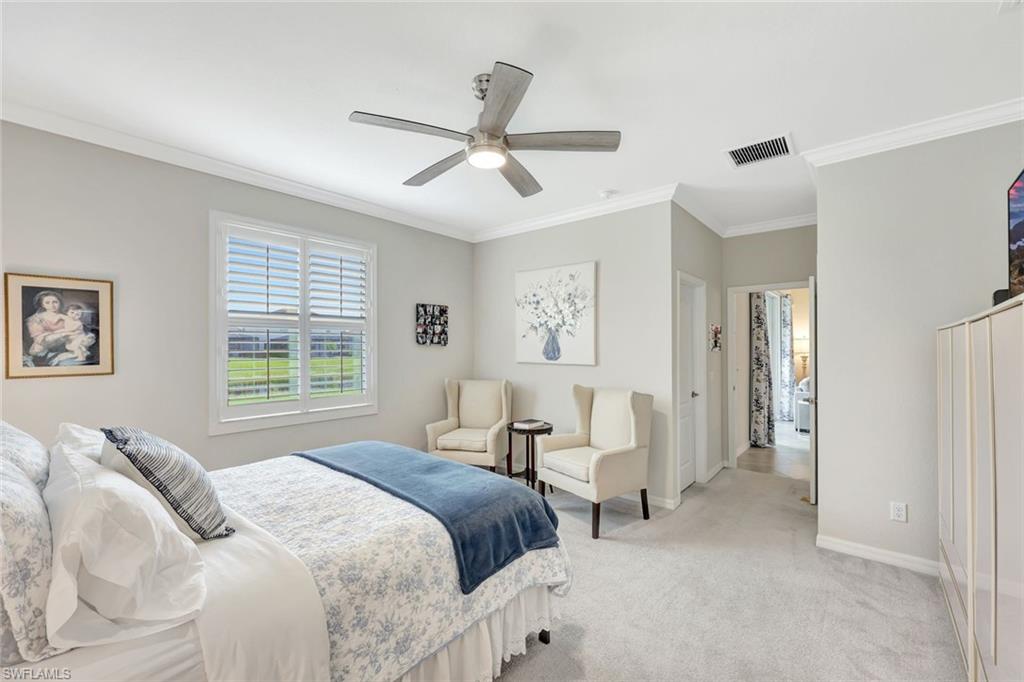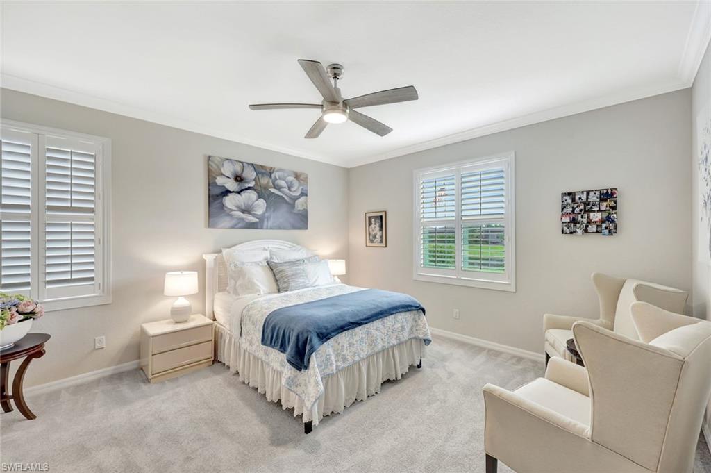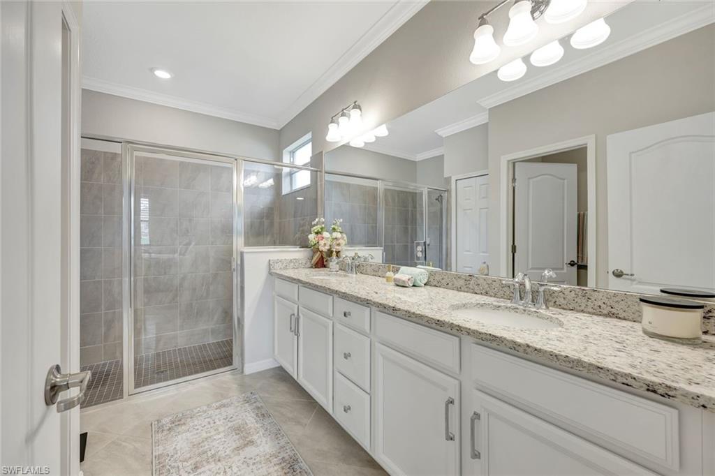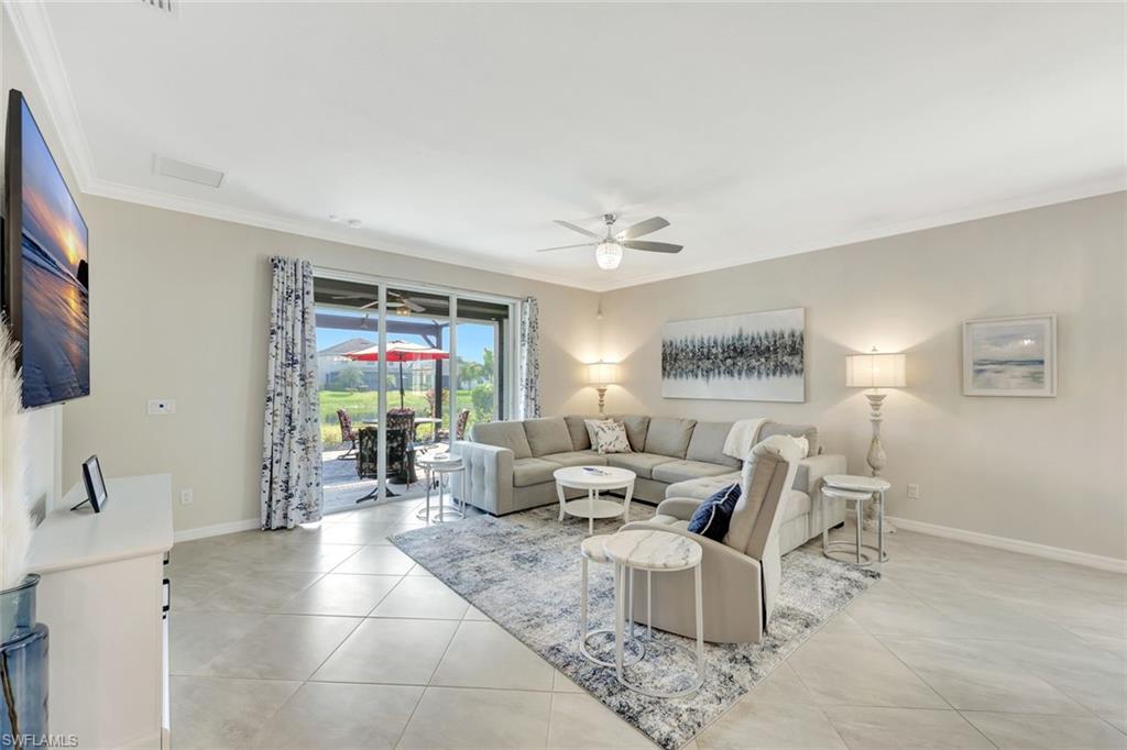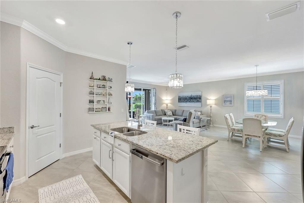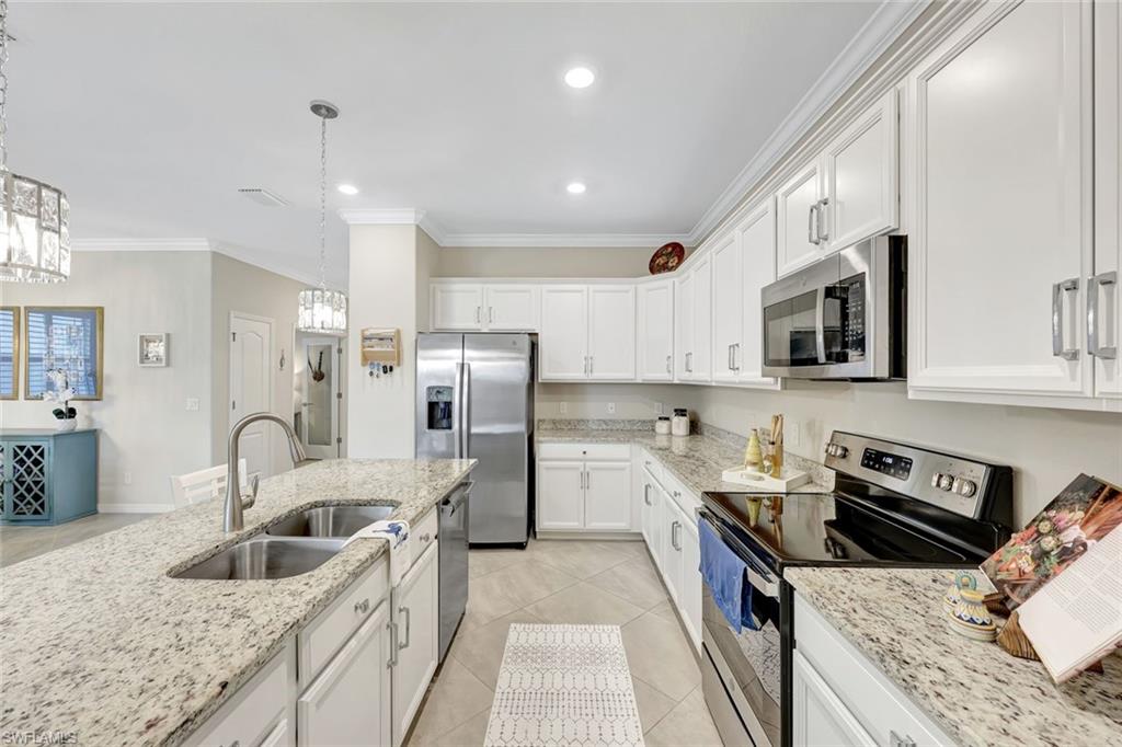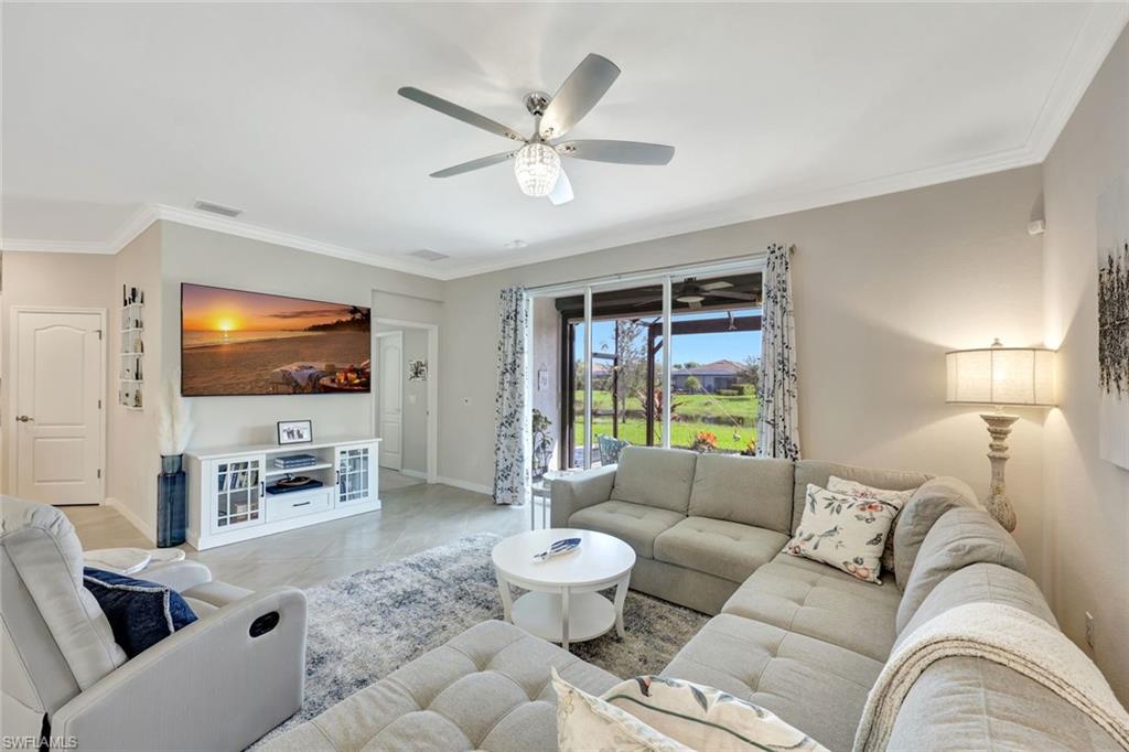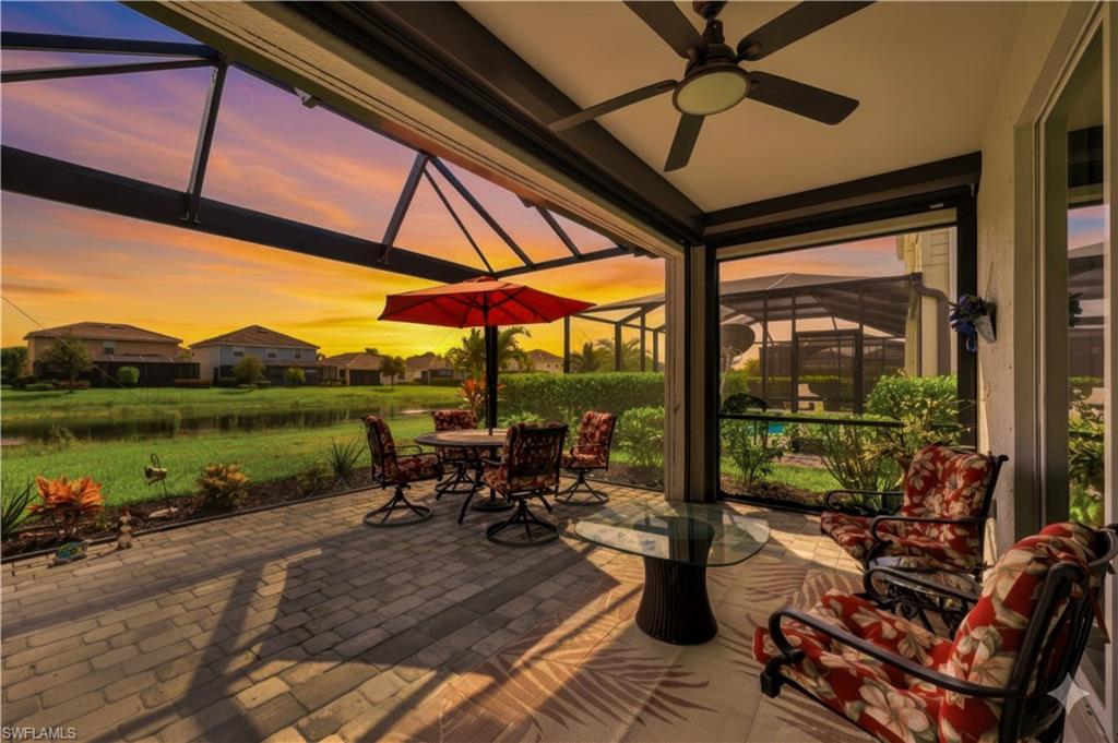 Welcome to Orange Blossom Ranch, a warm community with newer construction, plenty of amenities for an active lifestyle, and a Naples address. This bright and airy 3 bedroom plus den, 3 bath home has it all! From the minute you enter this home you will notice the attention to detail. High ceilings, beautiful lighting choices, crown molding, plantation shutters and a custom-built office space let you see that this home is move in ready! The great room, open to the kitchen, dining area and extended lanai is the perfect place for a gathering of family or friends. The kitchen area, with breakfast bar, pendent lighting, roll out cabinet shelves, quiet Bosch dishwasher, and a walk-in pantry has plenty of counterspace and cabinet space for even the most discerning chef! As it opens to the great room, being in the kitchen doesn't keep you away from the action! A formal dining area in the great room gives you plenty of seating space. The beautiful and functional custom-built cabinetry in the office makes this room perfect of those working from home or just for quiet computer time. The generous primary bedroom, with view of the lake behind the house, has his and hers ample sized walk-in closets, room for a seating area and can be your sanctuary for reading or relaxing. A split bedroom floor plan offers privacy for you and your guests with each bedroom having its own en-suite bathroom. The extended lanai, with picture screen, offers serene sunset and lake views. The two-car garage, with two large overhead storage racks, provides plenty of extra storage room. Orange Blossom Ranch amenities include resort style pools, playground, tennis/pickleball, basketball, and sand volleyball courts. A fully equipped Fitness Center and Clubhouse provide multiple places for your enjoyment and community activities! The community has easy access to Naples, fining dining, shopping and is a short distance to I75 with easy access to RSW airport. Brank-New Publix just outside of the gate, New Aldi, ACE Hardware, Gas Station and Car Wash in just a few minutes' drive.