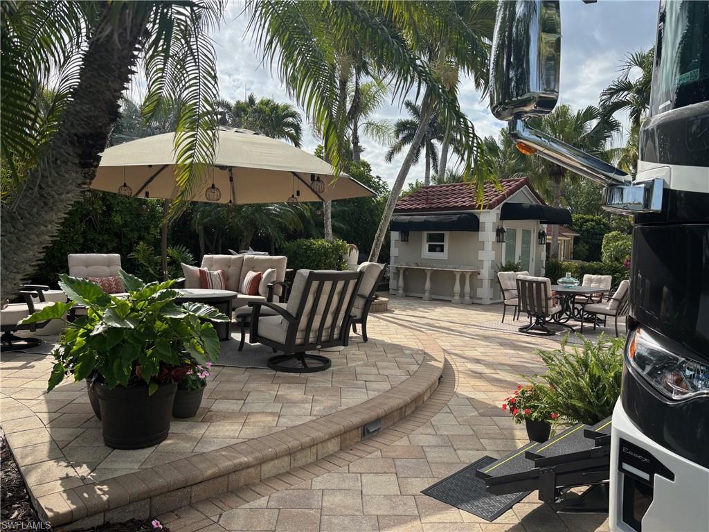 Embrace the perfect blend of serenity and luxury with this exceptional pull-in, north facing, lakefront property located in Pelican Lake Motorcoach Resort. This property has many upgrades including: the meticulously designed outdoor living space that offers a spacious paved pad and raised patio ideal for entertaining or unwinding beneath swaying palms and lush topical landscaping, recently renovated interior and exterior 10x10 coachhouse, and custom landscape lighting This site is located only 8 sites east of the centrally located clubhouse and amenity area. The property has plenty of space for your class A motorhome, two vehicles, a golf cart while still having plenty of out door area for living and entertaining. Enjoy the morning sun and afternoon shade while enjoying your morning coffee or evening happy hour with your neighbors! Move-in ready with new furniture and new grill! Coach house Details: The coachhouse on the property is 10x10 structure upgraded with a stucco exterior and tile roof, neutral black colored awnings over all the windows, glass double doors. The interior is nicely finished with all you need including washer & dryer, toilet, shower, sink, under counter refrigerator, granite counter-tops on both sides and finished walls.