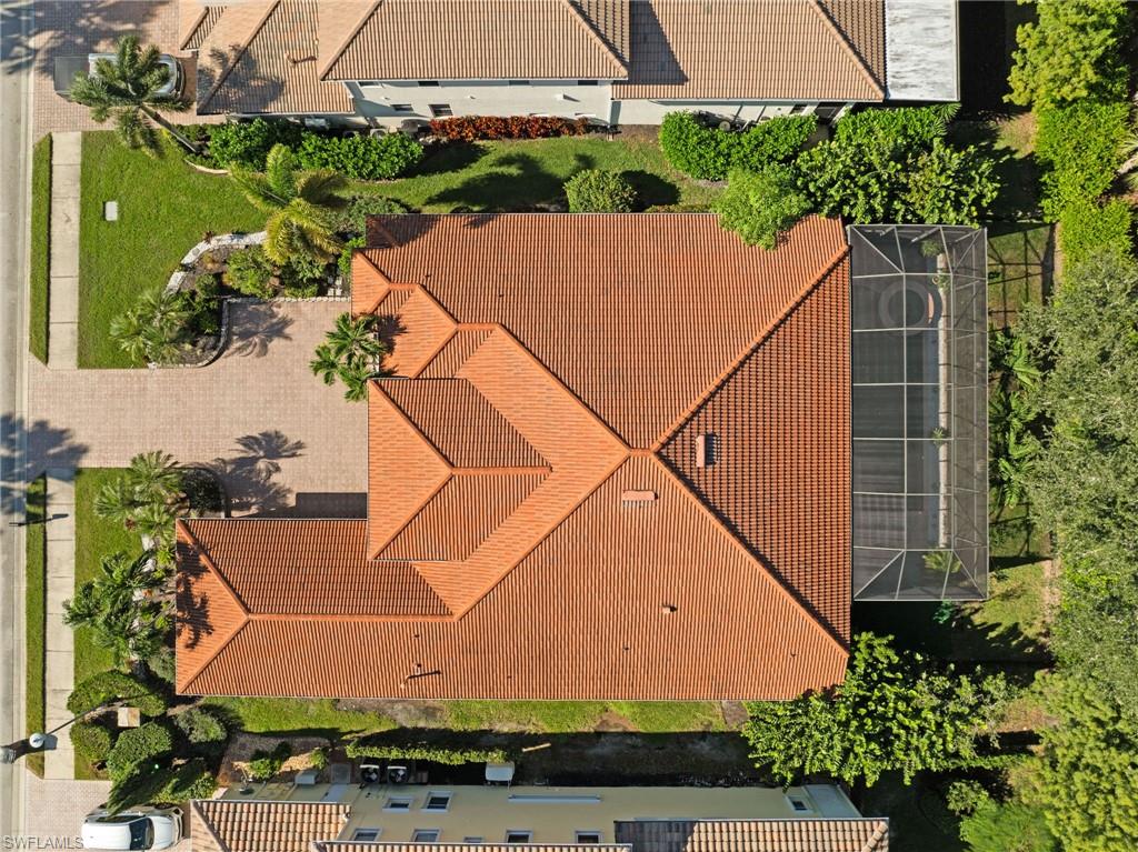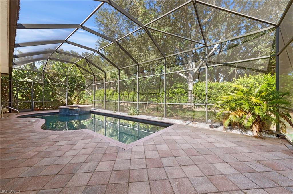 Offering over 3,000 square feet of one-level living with soaring volume ceilings throughout, this Aragon model in Belle Lago is designed for effortless Florida living. The home blends elegant finishes with thoughtful upgrades and a bright, open layout that transitions seamlessly from indoors to outdoors. With 3 bedrooms plus a den and 3.5 baths—including a convenient pool bath—it perfectly balances comfort, functionality, and style. The interior features tile flooring in the main living areas, and luxury vinyl floors in the bedrooms. The kitchen stands out with granite countertops, an upgraded backsplash, natural gas cooktop, reverse osmosis system, and a spacious breakfast bar ideal for entertaining. Plantation shutters and a custom built-in in the den add timeless appeal and versatility. Step outside to the private screened lanai, surrounded by mature fruit trees and tropical landscaping for exceptional privacy. The saltwater pool features a new gas heater, lanai screens replaced in 2022, and landscape lighting for an inviting evening ambiance. A freshly sealed paver driveway and insulated 3-car garage with epoxy flooring add to the home’s appeal.Located within the guard-gated, natural gas community of Belle Lago, residents enjoy resort-style amenities including tennis, pickleball, fitness, billiards, clubhouse, and a resort-style pool and spa—all connected by scenic walking paths and lakes. Ideally situated between Naples and Fort Myers, Belle Lago offers quick access to Coconut Point Mall, FGCU, Hertz Arena, and RSW Airport, with an optional golf-cart path to Estero Country Club. Experience the perfect blend of privacy, luxury, and location—schedule your private tour of 19464 La Serena Drive today.