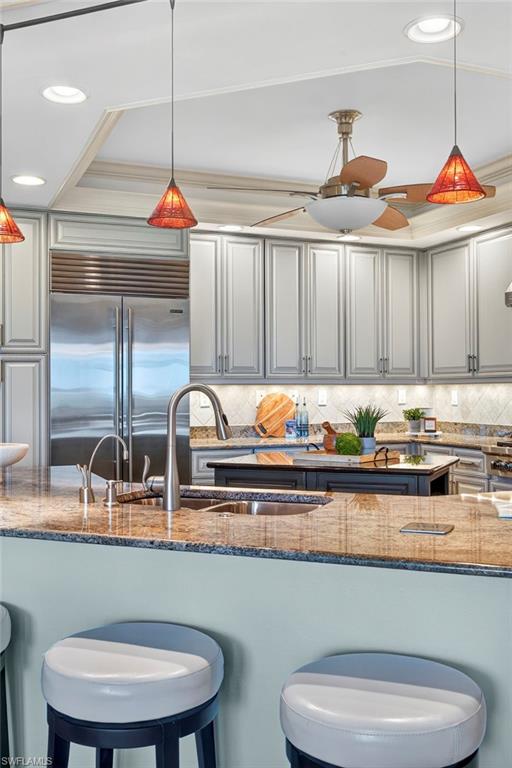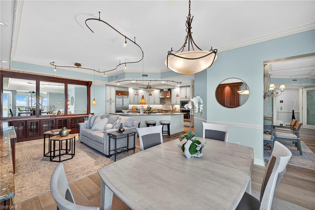 Step off the secured elevator into this highly sought-after center-stack residence and experience panoramic views of Turkey Bay and the Gulf of Mexico from your open-concept living area. This light and bright 3-bedroom, 3.5-bath home showcases oversized windows that maximize the views, sleek modern flooring, and coffered ceilings that add architectural sophistication. The living room features a stylish wet bar and custom built-in cabinetry, creating an ideal setting for entertaining. The chef’s kitchen is open to the family room and includes a convenient pass-through to the dining area, where Gulf views provide a stunning backdrop. Elegant crown molding and thoughtful details throughout enhance the home’s refined ambiance. The primary suite offers spectacular views of the Bay and Gulf, along with a luxurious bath featuring a double vanity, soaking tub, and separate shower. A second primary suite doubles as an office or den with access to a private lanai, perfect for work or relaxation. The third guest suite also enjoys its own private balcony, offering comfort and privacy for family and guests. The Grande Excelsior delivers resort-style living with a private pool and spa, fully equipped fitness room, outdoor gas grill, extra storage, and two under-building parking spaces. Residents also enjoy The Club at The Dunes, which features a waterfall pool with zero-entry access, a popular Tiki bar, casual and fine dining, a state-of-the-art fitness center with on-site trainers, and tennis and pickleball courts with full-time pros. The Dunes hosts social events throughout the year, fostering a vibrant sense of community. This residence includes the highly coveted Floridian Club membership (available with a $50,000 + tax transfer fee), granting private beach access on Vanderbilt Beach with pool, restaurant, indoor/outdoor seating, beachside services, and a private shuttle from your lobby to the sand. Ideally located near high-end shopping, fine dining, and RSW International Airport, The Dunes offers a rare pet-friendly lifestyle with the perfect blend of luxury, leisure, and convenience. Discover resort-style living at its finest—schedule your private showing today. ________________________________________