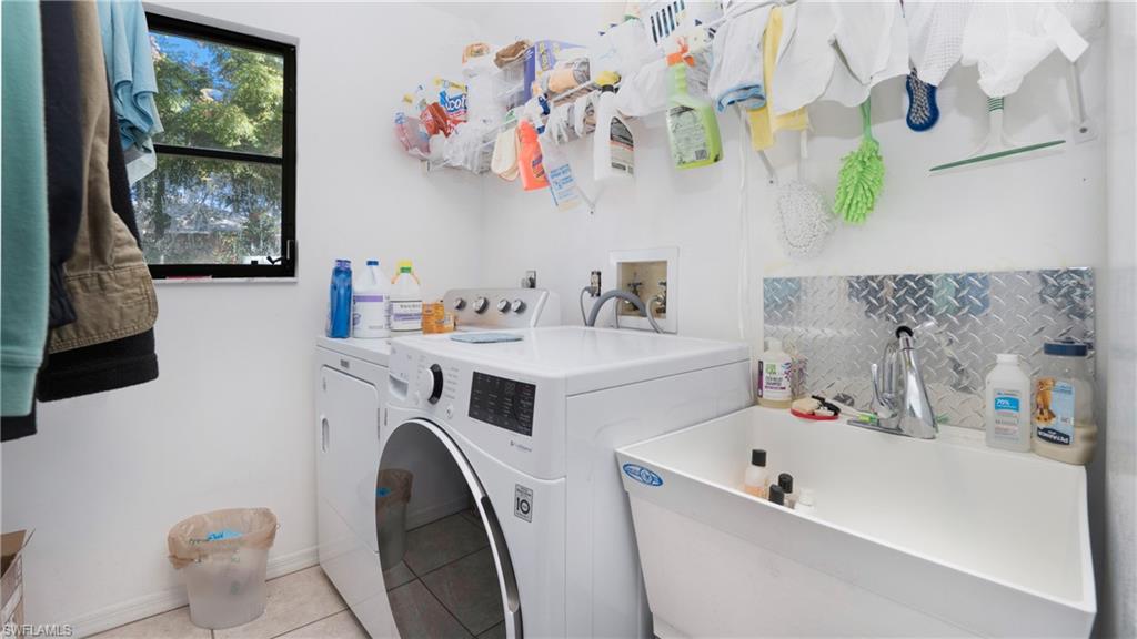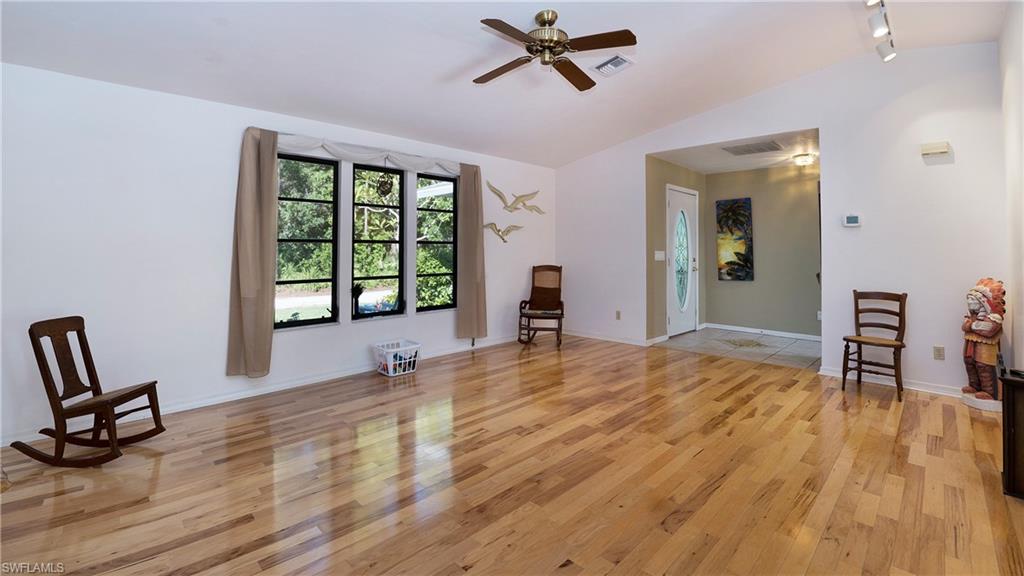 Escape to your dream retreat on 1.25 acres in highly sought-after San Carlos Estates, where you can finally spread out to your heart's content in a true tropical oasis offering unparalleled space, privacy, and freedom with NO HOA dues or restrictions. This residence has been extensively upgraded starting with major systems like a new roof (2025), new HVAC system installed in the main house (2024), a new septic and drain field installed (2023) and a new well pump put in place (2024). The exterior is well-appointed, featuring a new front paver patio installed (2023) and a shell driveway redone (2023) plus a new hurricane-rated garage door. The stunning backyard pool area was upgraded in 2022 with a deck extended with new travertine tile , a new PebbleCrete pool surface , a waterfall feature , a new cage with a picture window and an added salt system. Just outside the pool cage is a homemade sand beach sitting area adorned with palm trees. You'll also find RV and boat parking with water/electric hookups , a treehouse/playground built around a poinciana tree, and a new irrigation pump (2025). Inside the primary suite was beautifully remodeled (2018) with a walk-in shower, glass door and new plank tile flooring. Just off the primary bath is another wonderful space for an exercise room, home office, nursery, etc. The main house features new kitchen appliances (2021) and a new water heater (2023). Adding to the property's flexibility is a non-conforming 2-bedroom, 1-bath guest house , which has its own new HVAC and ductwork installed (2019) and new appliances (2018) . A new roof for the guest house was installed (2018) and includes a open porch deck to sit and enjoy the SW Florida outdoors. Don't forget an additional 16x18 shed for storage space/workshop and chicken coup attached. There are also additional sheds on the property for even more storage. The options and creativity to this property are endless.