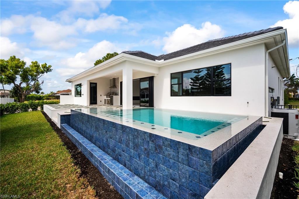 Luxury New Construction Home on Marco Island Embrace coastal sophistication in this newly constructed 3-bedroom, 3-bathroom home on Marco Island. Spanning 3,400 sq. ft., this modern home offers: Multi-zone Sonos audio system indoor and lanai area, Infinity edge pool with iaqualink, bubblers and water wall feature, Oversized garage fits boat, trailer or RV, EV charger in garage, 84 inch electric fireplace with heat, Thermador appliances indoor and outdoor kitchen, Coffered ceiling with multi color remote controlled ambient lighting in ceiling Main Bedroom and Great Room, Whole house surge protector, Custom European floating cabinetry, Outdoor shower, Upgraded travertine on lanai with artificial turf design, All bathrooms equipped with upgraded anti-fog mirrors with multiple color ambient lights,Oversized pantry with vented shelving, Hurricane rated sliding glass doors and windows throughout and so much more. The gourmet kitchen is a chef’s dream, featuring top-of-the-line Thermador appliances, quartz countertops and backsplash, custom cabinetry with under-cabinet ambient lighting for both style and functionality. The master suite is a serene retreat with a spa-inspired ensuite, while two additional bedrooms provide versatility for guests or a home office. A 5-zone Sonos audio system delivers premium sound throughout the home. Step outside to a resort-style paradise, complete with an infinity pool featuring bubblers and a striking water feature wall. The outdoor kitchen, equipped with premium Thermador appliances, elevates al fresco dining and entertaining. This seamless indoor-outdoor design embodies the ultimate tropical lifestyle. The oversized two-car garage includes spacious, oversize doors and a built-in electric vehicle charger, catering to modern convenience. Located minutes from Marco Island’s pristine beaches, world-class dining, and marinas, this home offers unmatched luxury and convenience. Schedule your private tour today!