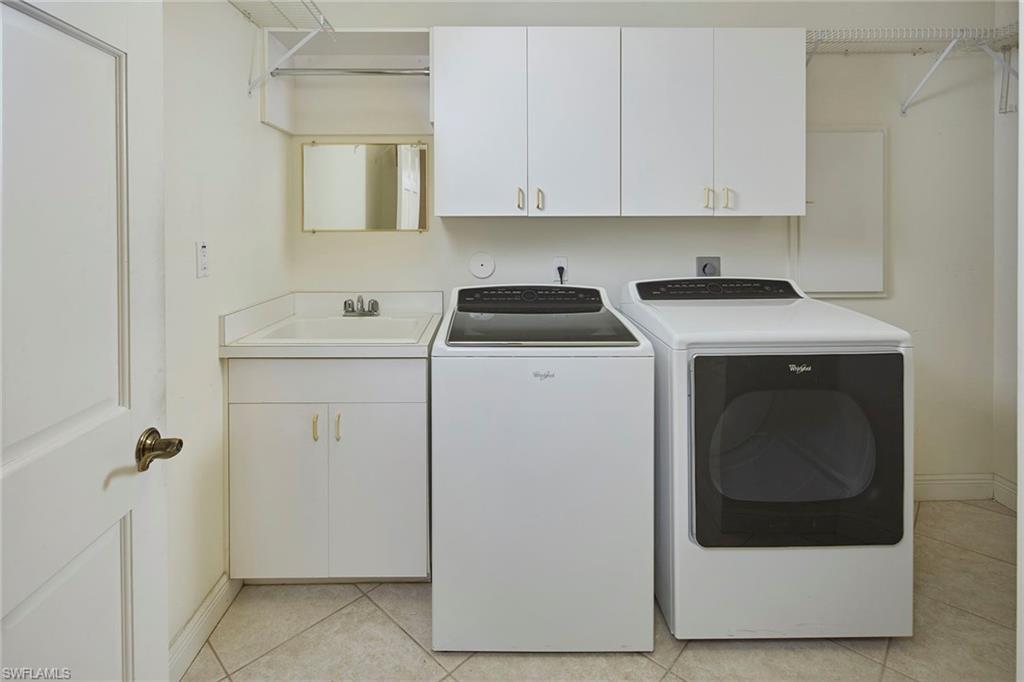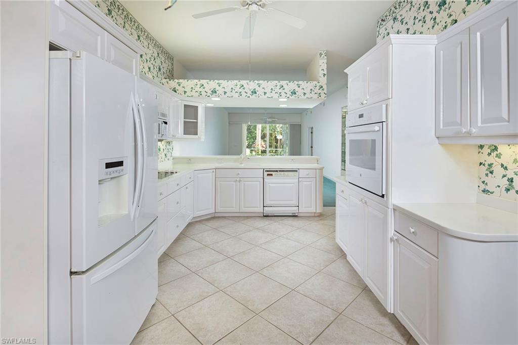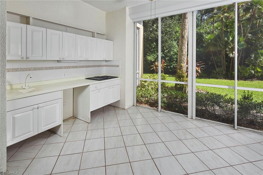 This spacious two-bedroom, two-bath first-floor residence is conveniently a short distance to the clubhouse, community pool and entertaining area. Featuring an open living concept with 10-foot ceilings, a 14-by-32-foot great room and split bedroom floor plan to ensure privacy. Sliding glass doors 9 feet wide open onto the 11-by-30-foot screened lanai with outdoor kitchen and private, wooded and tropical landscaped setting with a bubbling rock waterfall. The kitchen has many sunny windows in the eating area and offers under-cabinet lighting, custom pullouts, a pantry and breakfast bar. Primary bedroom has a tray ceiling, French doors opening to the lanai, bath area featuring large walk-in closet with wood shelving, double vanities, walk-in shower, jetted tub and separate water closet area. Laundry room has full-size washer and dryer, cabinets, shelving and laundry tub. Air conditioner and water heater were replaced 9/2025. Electric shutters plus a detached one-car garage. This amenity-rich development offers tennis, bocce ball, putting green, shuffleboard, clubhouse with kitchen and one of the largest outdoor swimming pools in Southwest Florida (11,000 square feet) with waterfall. Just minutes from shopping, restaurants, medical facilities, the 5h Avenue South/3rd Street district, and beautiful Gulf beaches.