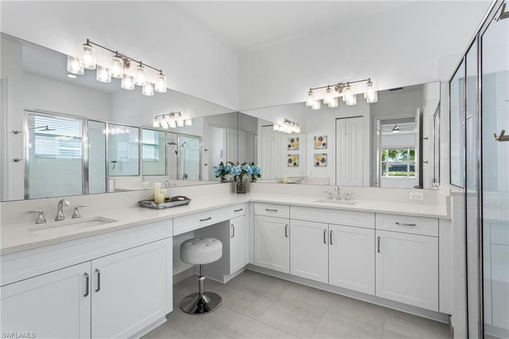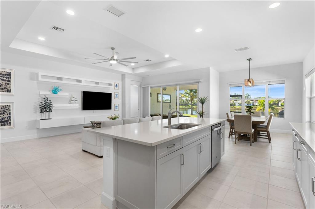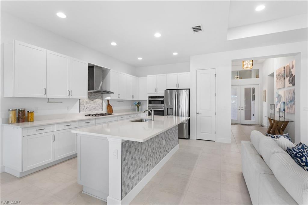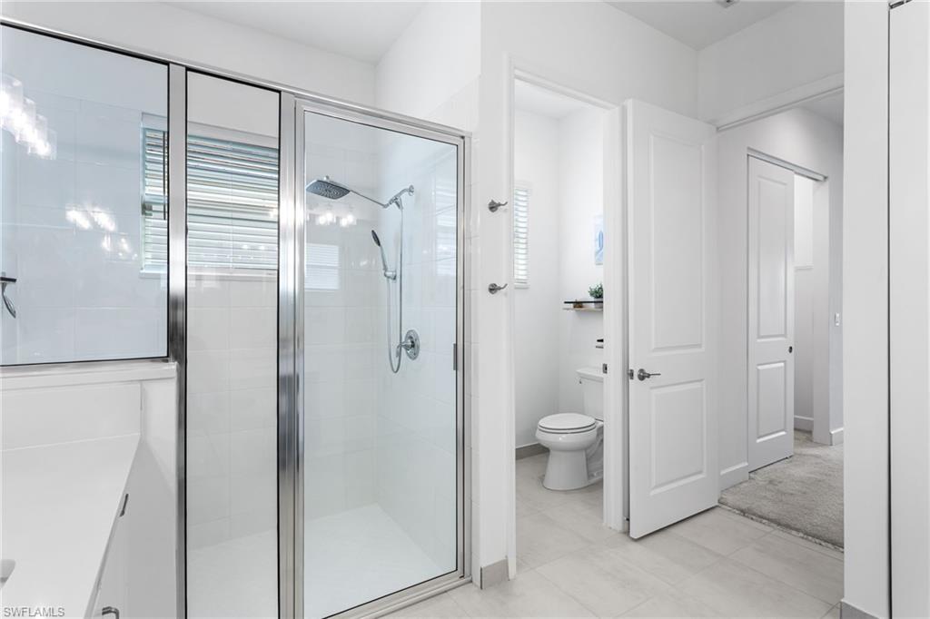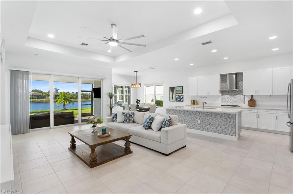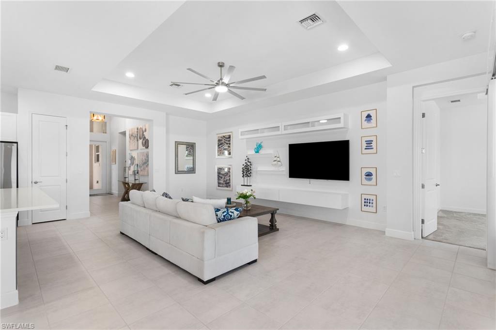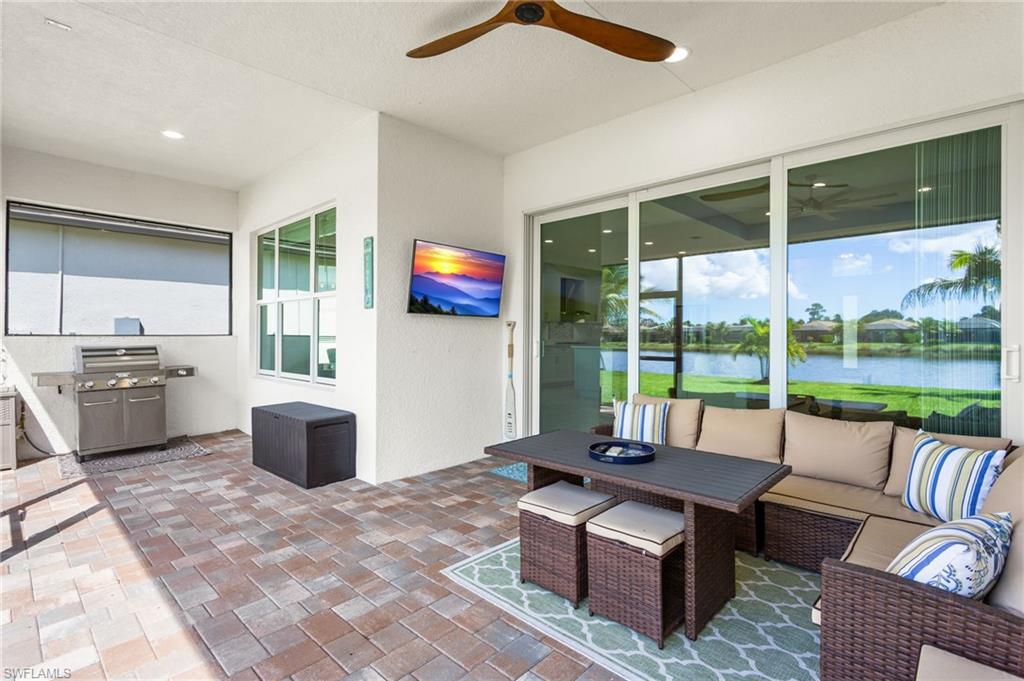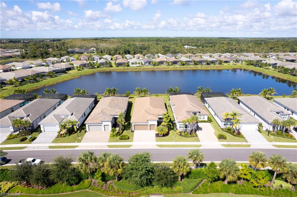 Nestled in the vibrant 55+ gated luxury enclave of Valencia Trails in Naples, this like-new GL Homes Nautilus (2022) presents resort-style living with every modern comforts. Step through dual glass entry doors into a bright, open floor plan, accompanied by custom window treatments, recessed (hi-hat) lighting, and designer fans that keep the ambiance just right. The heart of the home, the chef’s kitchen, is equipped with stainless appliances, a wall oven, a natural-gas cooktop with vented hood, upgraded cabinetry, quartz surfaces, and a striking custom backsplash that extends to the island. A rare 2½-car garage includes a dedicated bay with epoxy flooring and a climate-controlled mini-split for added comfort. Retreat to the expansive primary suite, boasting tray ceilings, two generous closets, dual vanities plus a built-in makeup station, a walk-in shower with bench and dual showerheads, a private water closet, and a spacious linen closet — luxury and practicality combined. The oversized lanai is yours for outdoor entertaining, pre-wired for TV and pre-plumbed for natural gas, ideal for grilling or a future summer kitchen, all while enjoying stunning west-facing lake sunsets; there’s even ample room to add a pool. Impact glass protects every door and window for peace of mind and lock-and-leave ease. This home also unlocks access to an active, engaged lifestyle. The community’s 43,000 sq ft clubhouse offers 8 pickleball courts, 6 tennis courts, 5 bocce courts, two card rooms, a sports lounge with billiards and poker tables, a full art studio with kiln, and a teaching kitchen that hosts professional chef-led classes. Clubs abound — Mahjong, Mexican Train, bocce, pickleball, tennis, car and coin clubs — creating endless opportunities to connect, socialize and enjoy life. With Naples’ beaches, dining and shopping just minutes away, plus Collier County’s reputation for low property tax and safety, this is the epitome of Florida lock-and-leave living done right.