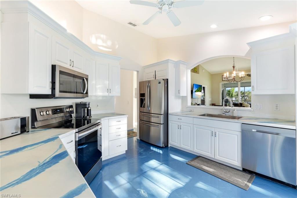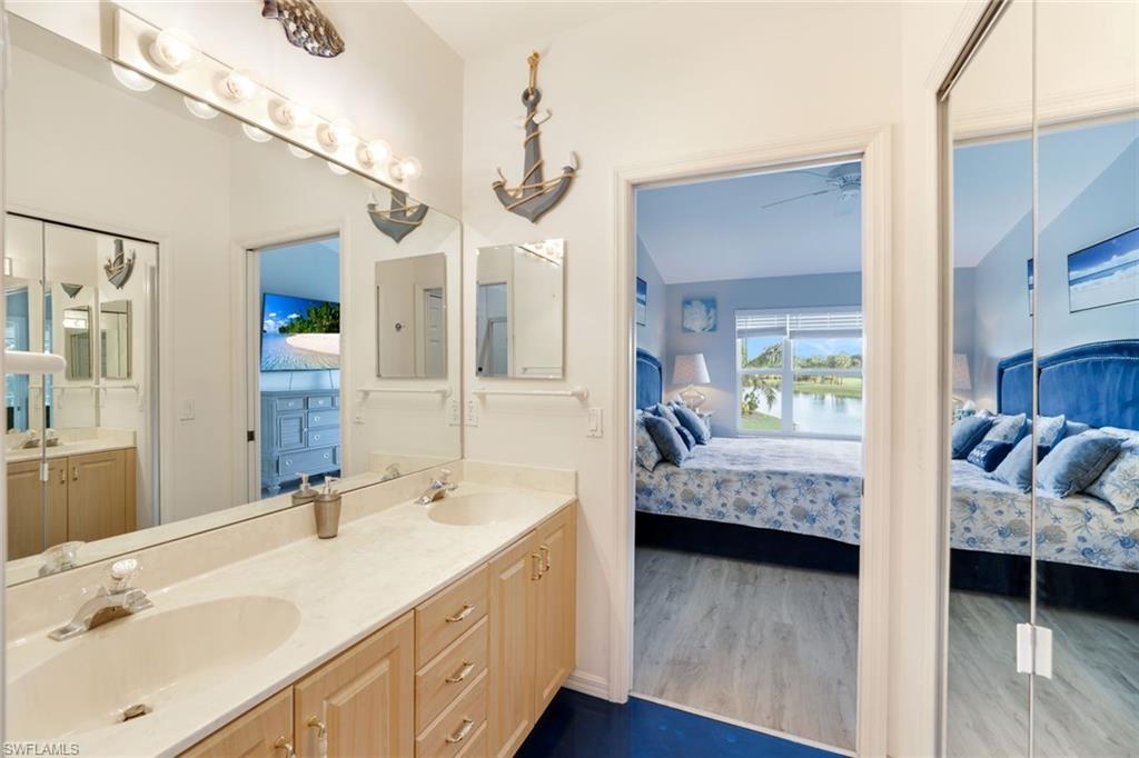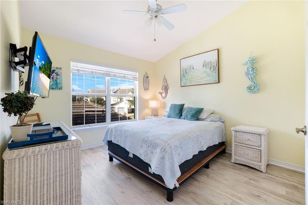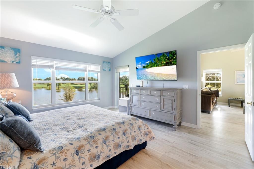 Welcome to effortless luxury and the most spectacular wrap-around views of the lake and golf course! This turnkey 2nd-floor end-unit in the highly sought-after Wedgewood at The Strand combines privacy, elegance, and convenience. Positioned as an upper-end unit with maximum space between buildings, it offers an unmatched sense of openness and tranquility. Step inside to discover soaring ceilings, new flooring throughout, and freshly painted interiors, creating a bright and inviting ambiance. The open-concept layout seamlessly connects the living and dining areas to a beautifully updated kitchen featuring modern countertops and stainless-steel appliances. A versatile den provides the ideal space for a TV lounge, home office, or guest retreat. Both full bathrooms are tastefully appointed, including the spacious primary suite that opens to the lanai—where breathtaking views await. From your expansive screened lanai, take in panoramic lake and golf course views, or simply lower the electric shutters for convenience when traveling or during storms. Additional features include new hurricane-impact windows and sliders, a newer roof, updated gutters and landscaping, and a detached 1-car garage. Located within the prestigious Strand community, residents enjoy an optional 27-hole championship golf course membership and access to world-class amenities—a fitness center, spa, junior Olympic-sized pool, multiple dining venues, and social activities such as croquet, bocce, pickleball, basketball, and tennis. Turnkey and move-in ready, this exceptional home offers low-maintenance luxury living with some of the finest views in Naples. Schedule your private showing today and start living The Strand lifestyle!