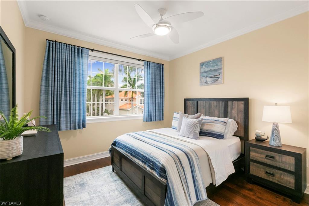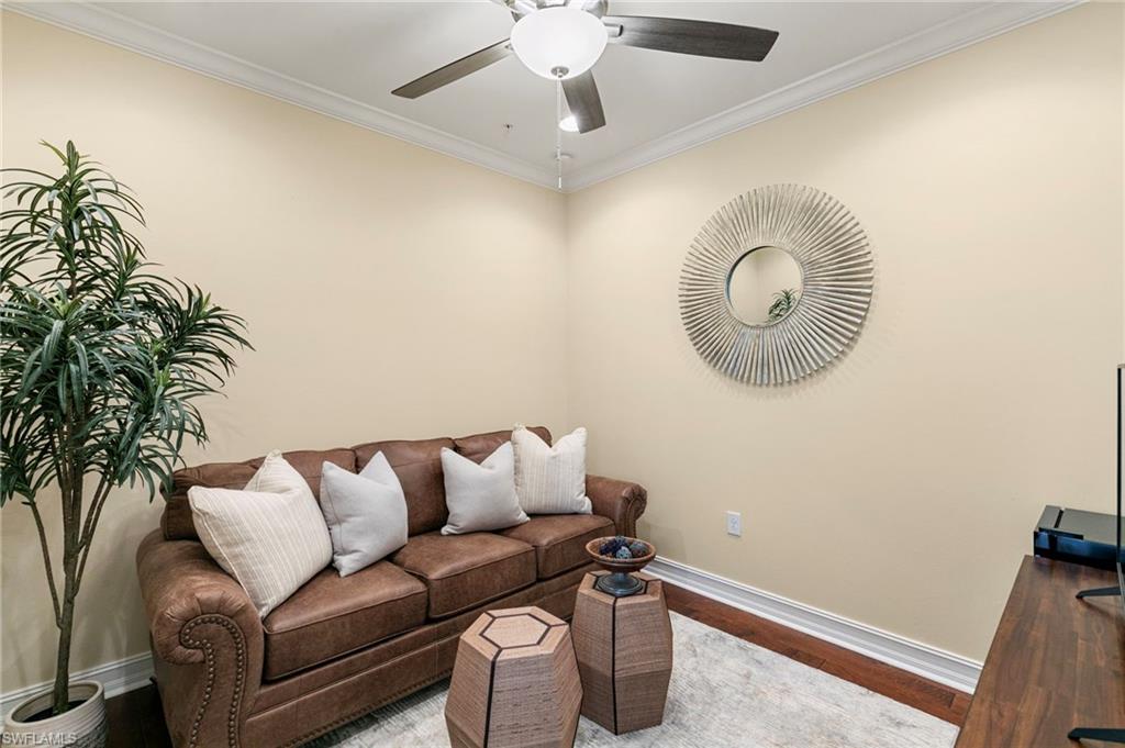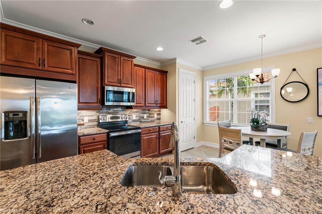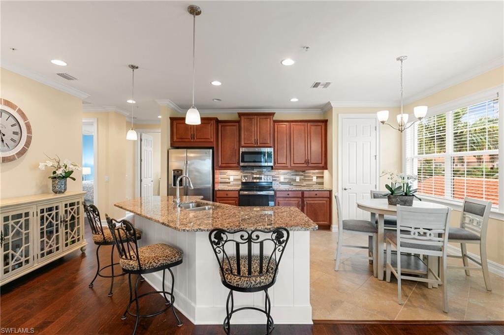 ***SUNSETS AT SORRENTO***This is the one you have been waiting for! This 3+Den, 2 Bath Carriage Home offers superior design aspects only available in this unit. Drive into the extended block paver driveway and into an attached garage with direct entry to the home. The Chef's Kitchen features all NEW stainless appliances, granite surfaces, custom backsplash, under cabinet lighting, 42” rich warm wood cabinetry, neutral porcelain tile flooring, walk in pantry featuring custom built ins and an eat in kitchen perfect for morning coffee or evening entertaining! The Living Room is filled with natural light and features hardwood floors, tailored woodwork and a perfect lake view. The large Primary Suite features crown moldings throughout, Ensuite Bath and the Walk In Closet is a must see complete with custom built ins and integrated security. Your guests can choose between two Guest Bedrooms complete with custom finishes & built in closets! Impact windows and sliders throughout are a safety plus. Enjoy the beautifully appointed resort amenities highlighted by a crystal clear lagoon pool. Home is within a 3 mile radius to anything you could want in Bonita Springs including Beaches, Shopping, Dining & more!