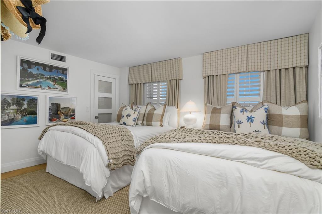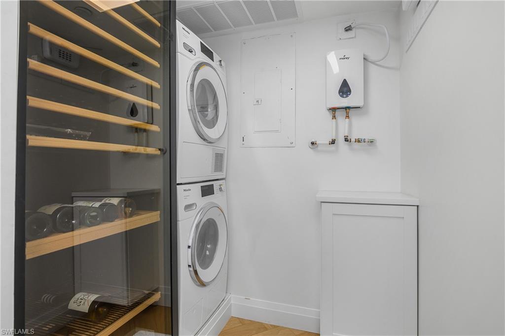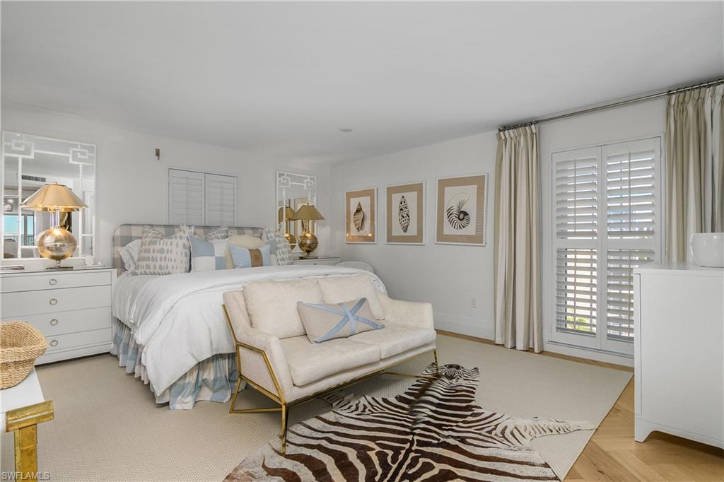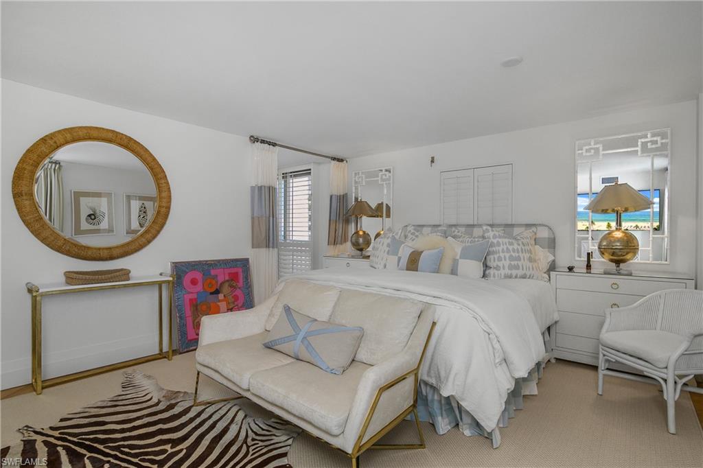 Welcome home to this luxurious beachfront end condominium residence at the St. Croix Club on the Moorings beach. This is a beautifully updated property which has been remastered by Joy Tribout Interiors, well known in St. Louis, Chicago, Arizona, and of course, Naples! She & her design specialists have rendered all of the elements which seamlessly make this property the epitome of coastal living. Here you'll enjoy the highest level of appointments, finishes, & fixtures. From its 5th floor vantage point, the best of sunsets, surf, and seaside memories present the beach lifestyle of your dreams. This is the ultimate destination for your winter getaway! The kitchen is both beautiful and functional for the most discerning gourmet chef. Gather around the stunning Cristallo Quartzite island, looking out to pristine Gulf views. The La Cornue stove is the pinnacle of gourmet luxury - imagine the meals, and memories, you'll savor here. There are gorgeous custom light fixtures throughout reminscent of the most luxurious hotel retreats and, of course, a Lutron lighting system too. Other features include SubZero refrigerator, Miele dishwasher, induction range and convection oven, as well as wine storage/chiller. Also, marble walls grace the full height of both the main living space and baths. The primary bedroom is spacious with two closets & pocket office space. The en-suite bathroom is a masterpiece! There is a walk-in rainfall shower, dual sinks, and a soaking tub which beckons you to relax. And, the guest BR space features ample room and privacy for your guests with an adjacent bath every bit as appealing and luxurious as the master bath. Positioned in the coveted 02 front stack, property offers breathtaking western and SW Gulf views, as well as a hint of a serene evening cityscape at twilight. Abundant natural light is often the hallmark of all of the premier destination buildings at the Gulf, and this residence perfectly captures that essense. St. Croix Club offers recently updated amenities, including an on-site fitness center, beachside pool and cabana/baths, a grilling area, community room, and seasoned, thoughtful on-site management. The Moorings community is the perfect springboard to launch any and all of your Naples adventures including world-class shopping, dining, galleries, golf, boating, pickleball/tennis, & more. For great boutiques & bistros, it's an easy stroll to the wonderful restaurants and shops at Venetian Village, and also close to downtown Old Naples, 5th Ave. S. and historic Third St. S., as well as the Waterside Shops, Artis-Naples, & Mercato. If you are a boater, there may be opportunities at the nearby Venetian Yacht Club for boat slip purchase/lease. St. Croix #502 is inviting, sophisticated, modern and magnificent. It's a peaceful space in the sun and a true beauty on the beach. One underbuilding parking space is adjacent to your private storage unit. Ample guest parking spaces, too.