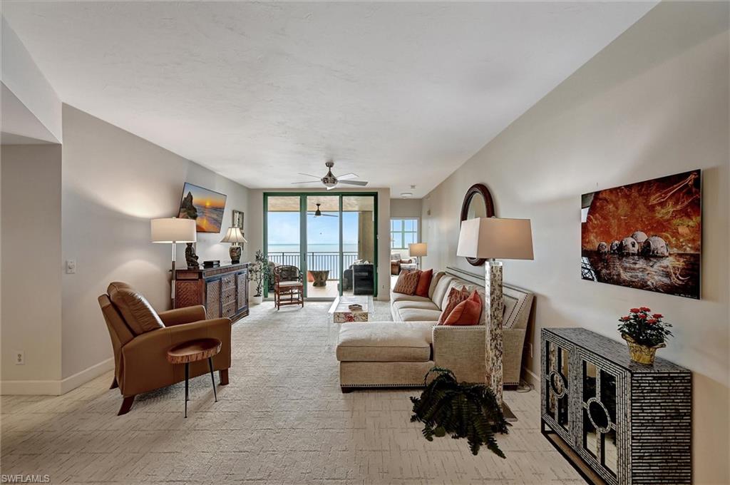 Welcome to the stunning Monterrey at Cape Marco! This luxury building is situated on the southern end of Marco Island overlooking the Gulf of Mexico and the 10,000 Islands. Watch manatee and dolphin swim by glorious sunsets from your front and back balconies. Enjoy gulf breezes on the main balcony, large enough to enjoy an outdoor living room and or dining space. Cape Marco is a very secure community with main gate manned 24 hours, secured building and parking area. Enter this condo via a semiprivate elevator servicing only 2 units per floor. The double door entry opens to a nice sized great room with incredible views. The split bedroom floor plan has den and guest room to the back of the condo and primary suite with balcony access to the front. Wake up to glorious views and morning sun. The primary bath has a large soaker tub and a walk-in shower, double vanity and a walk-in closet. The kitchen with white modern cabinets and granite counters has a coffee bar breakfast room area. Many updated items including AC 2020, Hot Water Heater 2024, Refrigerator 2018, Dishwasher 2023, Stove/Oven 2020, Disposal 2024, Washer/Dryer 2022. In addition to shared storage on the unit floor, there is a large private storage area in the garage. The building has an outstanding clubhouse room with full kitchen, bar, large screen TVs, game/card area and many sitting areas all with spectacular gulf views. Cape Marco has one of the most popular tennis groups on the island. Enjoy 6 Har Tur tennis courts, the newly renovated clubhouse and veranda area and all that the tropical Cape Marco grounds have to offer. This condo with its unobstructed view and ample 1800 sq. ft plus is one of the best buys on Marco at this time.