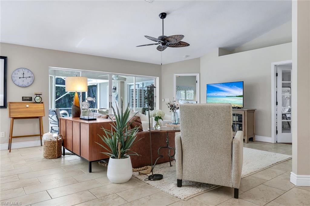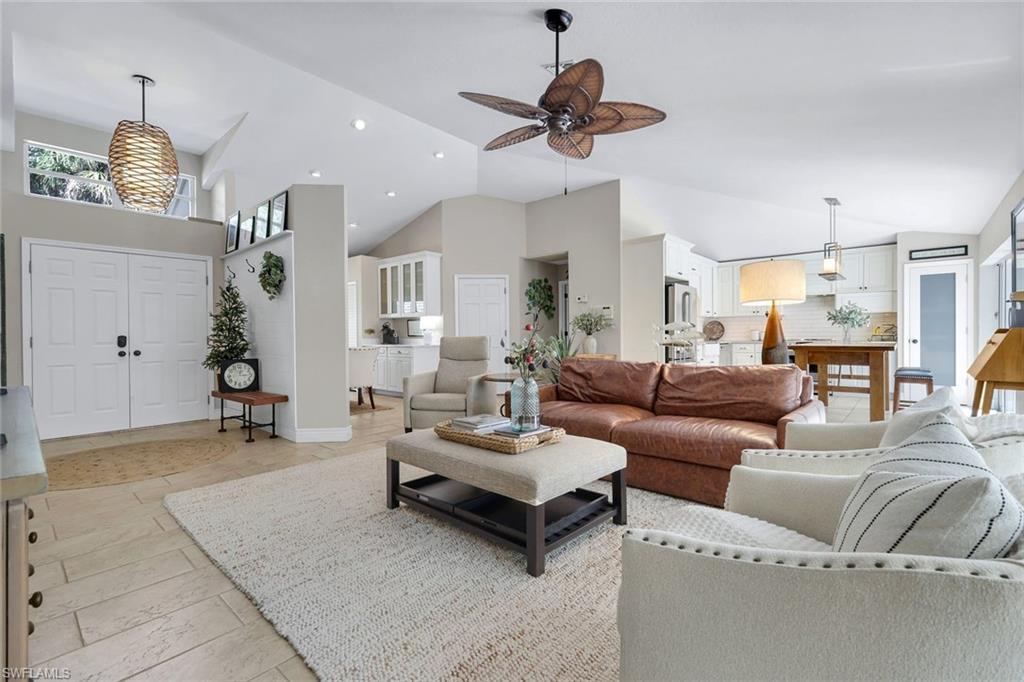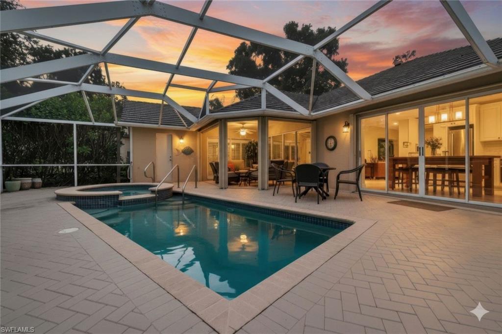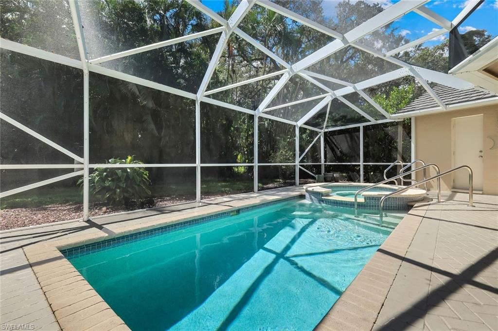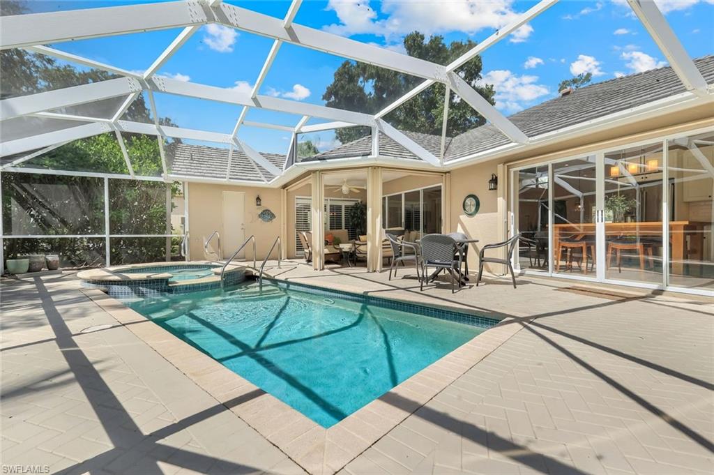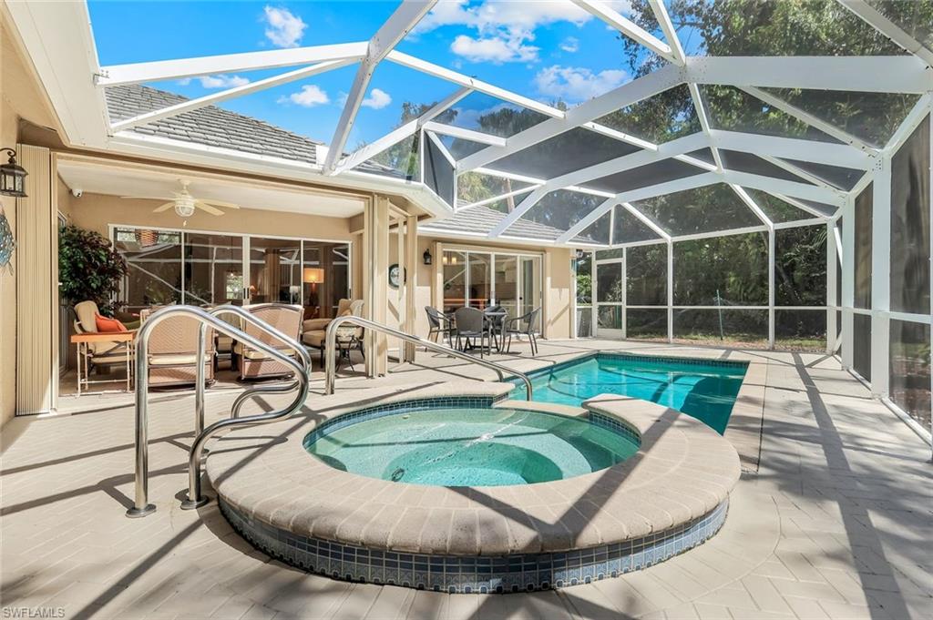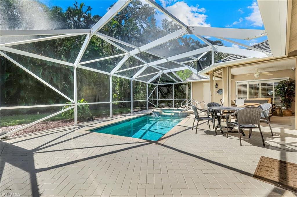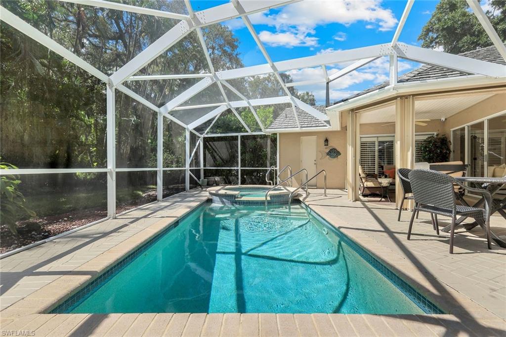 Experience refined Florida living at its best in this beautifully remodeled residence tucked away on a serene, tree-lined street in the exclusive Villages at Country Creek. Every detail of this 2-bedroom plus den, 2-bath home has been thoughtfully designed to balance modern elegance with effortless comfort. Step inside to soaring vaulted ceilings, designer lighting, and luxury flooring that flow seamlessly through the open-concept living spaces. The chef’s kitchen has been tastefully updated with high-end cabinetry, quartz countertops, stainless steel appliances, and a stylish backsplash, creating an inviting space to cook, gather, and entertain. The primary suite is a true retreat—featuring a spa-inspired bathroom with dual vanities, frameless glass shower, and custom finishes, along with private access to the lanai. A flexible den provides the perfect setting for a home office, library, or guest room. Outside, your private tropical oasis awaits. The expansive screened lanai showcases a sparkling pool and spa with waterfall feature, surrounded by lush landscaping and tranquil preserve views—ideal for both quiet relaxation and elegant outdoor entertaining. Residents of Country Creek enjoy a bundled-golf lifestyle with access to a championship executive golf course, five resort-style pools, a clubhouse with restaurant and bar, tennis and bocce courts, and a full fitness center. Lawn care, cable, and water are included—so you can focus on living beautifully. Ideally located in the heart of Estero, just minutes from Coconut Point, RSW International Airport, and the Gulf’s pristine beaches, this home combines luxury, leisure, and location in perfect harmony.