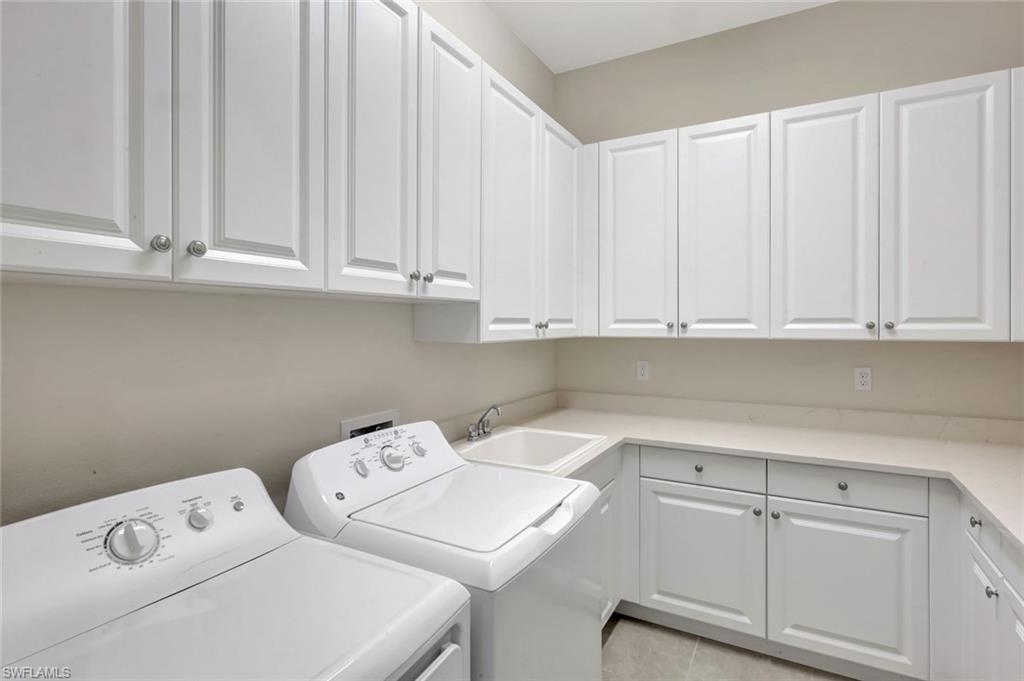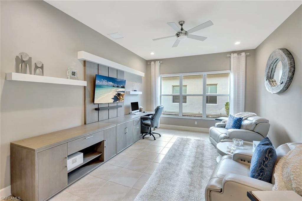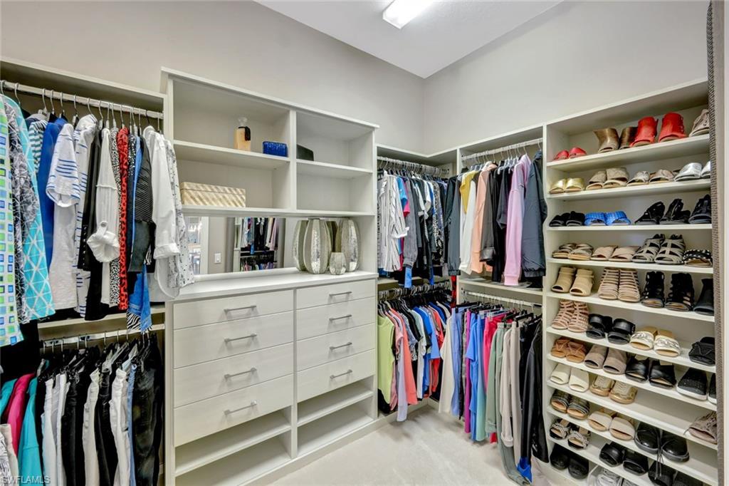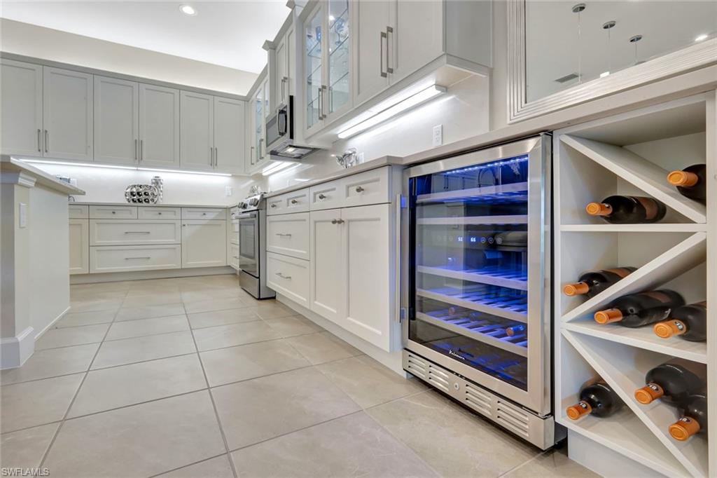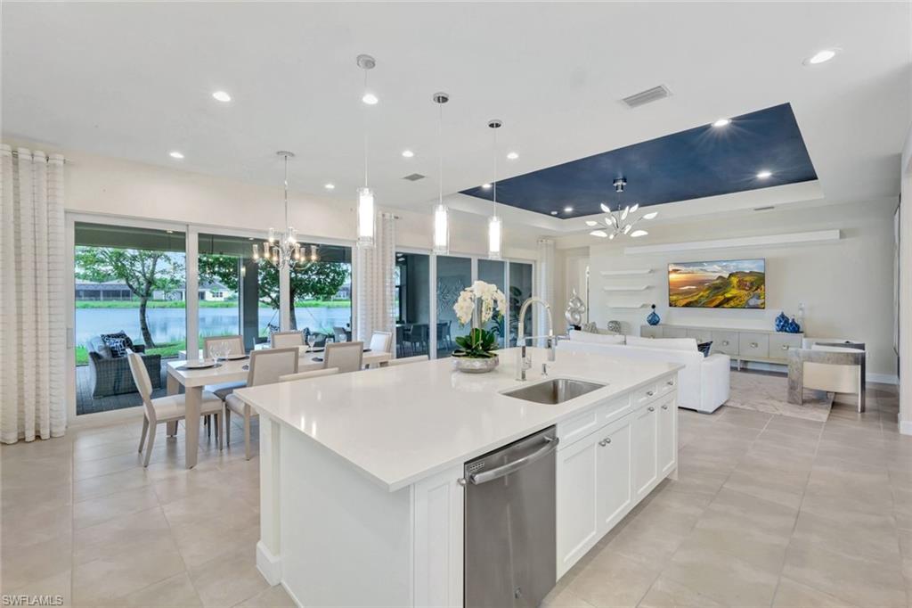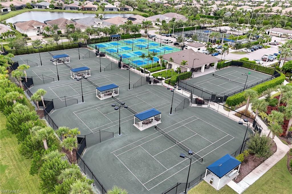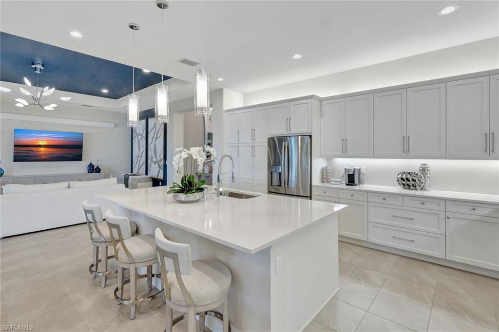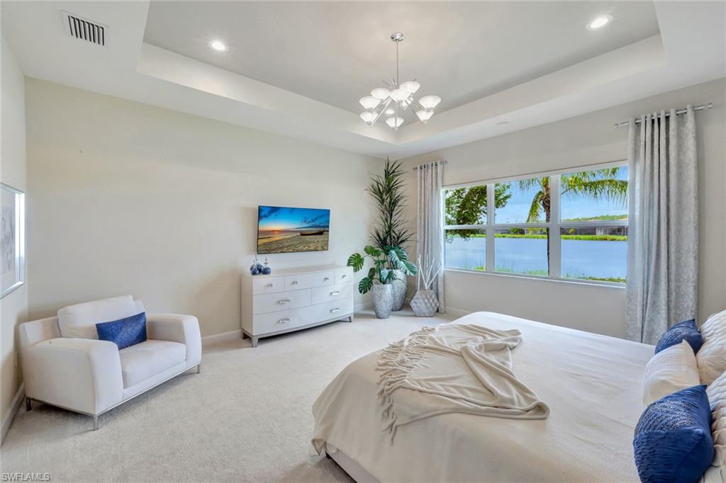 TURNKEY FURNISHED AND JUST REDUCED $50,000! Robb & Stucky designer furniture & accessories throughout home. This top selling NAPA floor plan for GL Homes is located in Valencia Bonita, a 55+ Active Adult manned gated community which provides resort living at its best. As you enter the home through the upgraded glass front doors, the first thing you notice is one of the best lake views in the community. This view on the largest lake, is really appreciated when relaxing or entertaining on the oversized covered back patio watching the beautiful sunset. At the clubhouse, you have access to all the resort amenities, including the 45,000 sq. ft. clubhouse with indoor and outdoor restaurants, bars, many pools & more. This desired floor plan was designed to offer a bright open great room concept with 4 bedrooms each with their own private bathrooms plus a versatile den along with a half bath and a spacious 3-car epoxied floored garage. This well appointed home with many upgrades and striking designer chandeliers provides the ultimate Florida lifestyle. Highlights include a custom outdoor kitchen with a four season outdoor refrigerator, impact glass, custom built-ins in the den & dining area, providing pull out lower drawers, quartz countertop with wine chiller, upgraded 17” tile flooring in main living area and den, large walk-in customize closets in the primary bedroom along with new carpeting and motorized shades on all windows. The gourmet kitchen boasts upgraded appliances with a BOSCH natural gas range, upgraded sparkling quartz countertops, 42” upper white wood cabinetry with above & undercabinet lighting, along with molding and valence on cabinets, pull out base drawers along with upper glass cabinet fronts with lighting & a large cabinet pantry. Also provided is a large single bowl stainless steel undermount sink with a modernized chrome faucet and expanded overhead LED lighting. The primary suite bathroom offers dual vanities, white wood raised panel cabinets, quartz countertops, large walk-in shower, soaking tub, a custom cabinet linen closet & builder upgraded tile package for flooring and shower walls. All other bathrooms come appointed with quartz countertops, white wood raised panel cabinets, banjo feature on senior height toilets and builder upgraded tile packages. Valencia Bonita is a top selling Active Adult 55+ community in Bonita Springs with a spectacular clubhouse and amenities! The clubhouse is located on a 10-acre complex offering a resort style swimming pool, 60 ft. lap swimming pool, resistance exercise pool, grandchildren wading pool, racket center pro shop, tennis courts, pickelball courts, bocce courts, dog park & fire pit. Residents also enjoy performances and social events in the grand ballroom, fully equipped fitness center, spa with treatment rooms & nail salon, restaurant with indoor and outdoor bars, card rooms, sports lounge, arts and crafts room, yoga/exercise, studio, ping-pong, massage rooms & so much more!