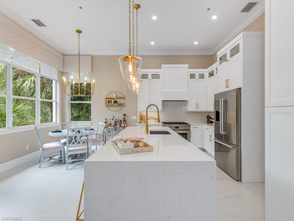 Experience sophisticated living in this luxuriously updated coach home in the exclusive gated community of Mediterra in Naples, FL. Perfectly positioned with desirable southwestern exposure, this second-floor magazine feature-worthy residence captures lush preserve views while offering elegant, move-in-ready interiors enhanced by recent, extensive high-end updates! Step inside through the impressive spiral staircase to a bright and open great room design accented by crown moldings, high ceilings, and expansive windows. The chef's dream kitchen showcases new custom cabinetry & hardware, premium stainless-steel appliances, an exterior-vented range hood, bar, two wine coolers, and stunning Quartz countertops and backsplash, centered around a generously sized center island—an exceptionally rare feature in Mediterra’s coach homes. The adjoining dining area and breakfast nook flow seamlessly into the spacious great room for effortless entertaining. The primary suite is a pampered retreat, complete with a sitting area, dual walk-in closet, and a spa-inspired, totally updated bath featuring Quartz-topped vanities, a standalone soaking tub, and a separate glass-enclosed walk-in shower. Two generous guest bedrooms and a private den/home office ensure comfort and flexibility for residents and visitors alike. Enjoy year-round Florida living on the expansive screened lanai, updated with new tile flooring and furnishings, overlooking a lush preserve backdrop. The home is equipped with hurricane shutters and window treatments installed in 2024, and offers access to the neighborhood pool and spa just steps away. Additional upgrades include two A/C units (installed in 2023), two dehumidifiers, four UV sterilizing lights, a tankless water heater, whole-house Kinetico water filtration, updated bathrooms, and neutral tile flooring throughout. Mediterra is a prestigious luxury golf & country club community featuring Two championship Tom-Fazio golf courses for avid golfers, a private beach club with restaurant & bar, multiple tennis courts, pickle-ball & bocce, fitness center, pristine bike & jogging trails, and luxurious dining at the private country club restaurant. The Mediterra Beach Club offers an escape to a 10,000 sq. ft two-story private oceanfront paradise on the Gulf of Mexico. Featuring a restaurant & bar that serves members via indoor & outdoor dining, this private facility boasts a heated swimming pool, a sundeck, and cabana beach service for chairs, umbrellas & refreshments. Private beach and sports memberships are now available.