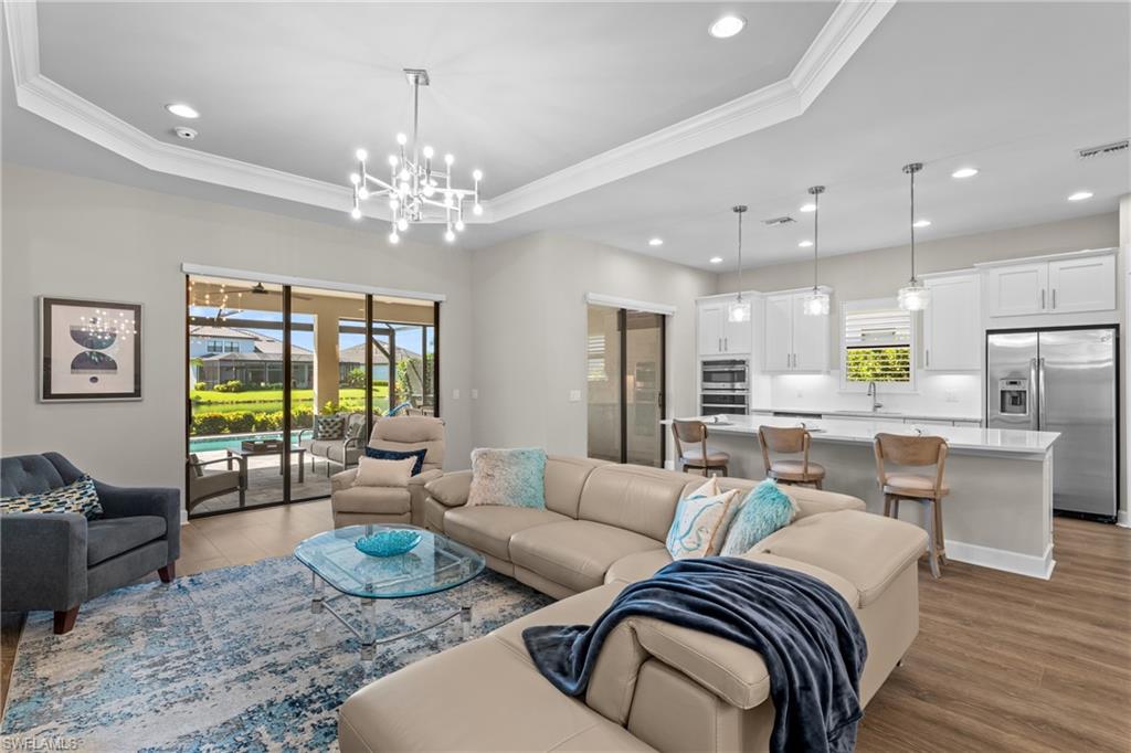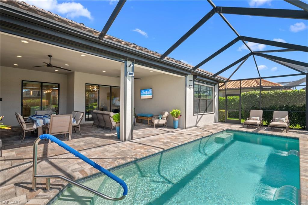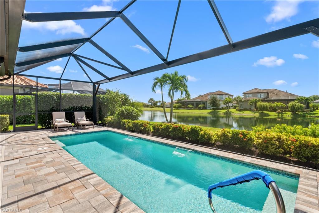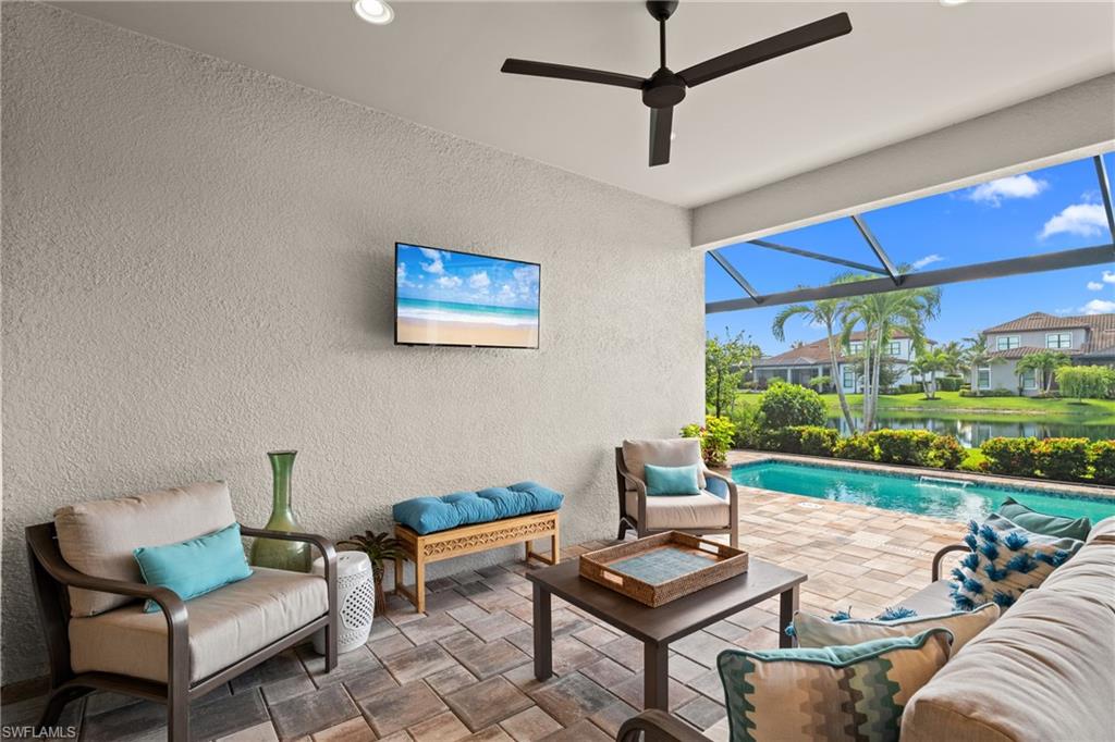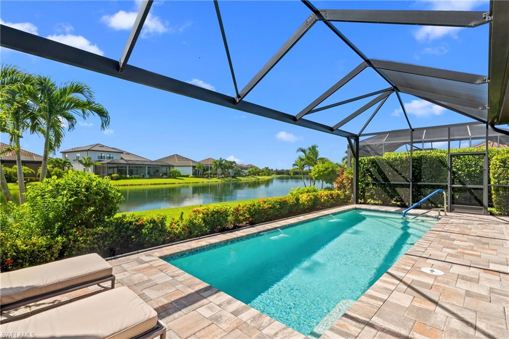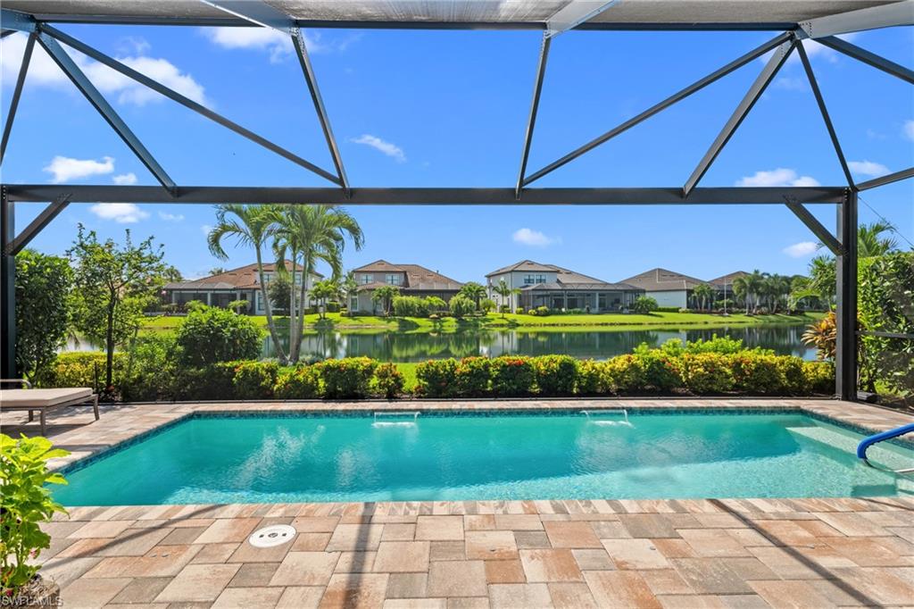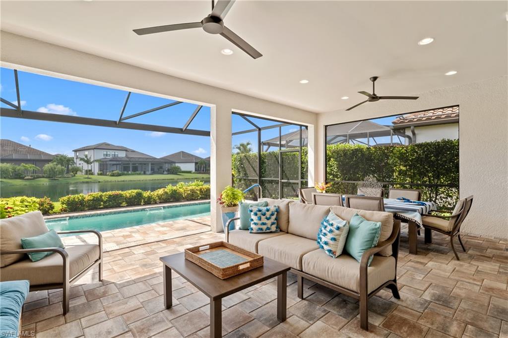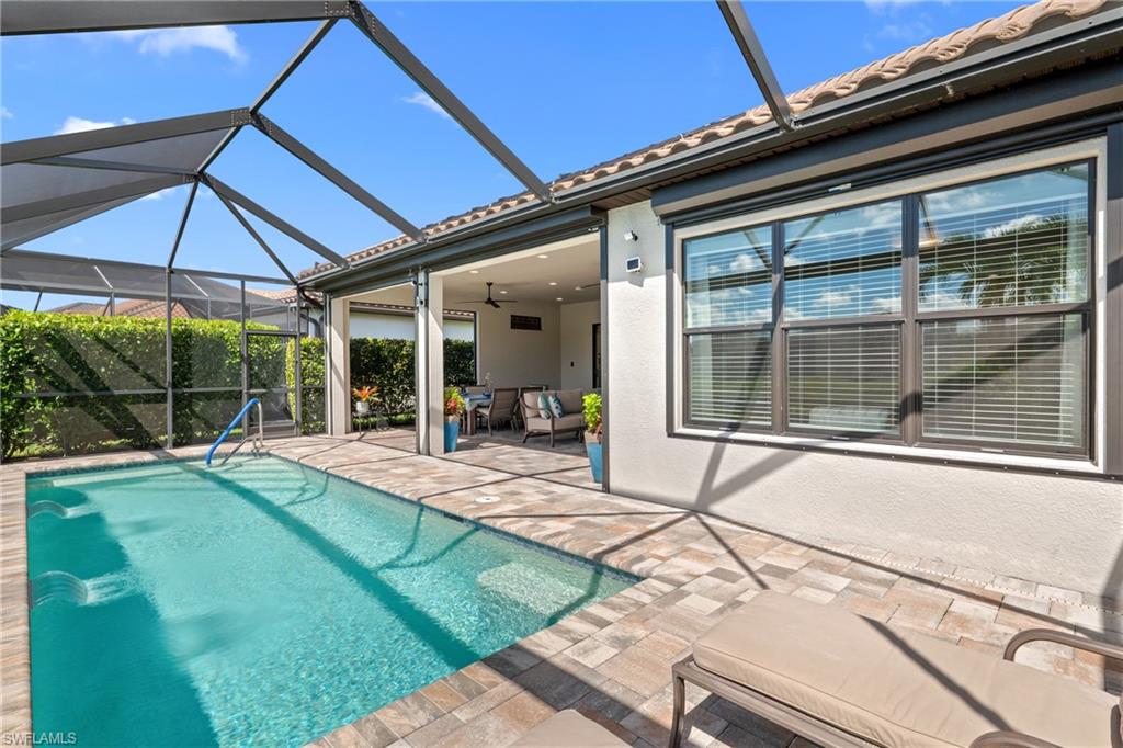 LIVE A VACATION LIFESTYLE IN ESPLANADE! FULL GOLF MEMBERSHIP INCLUDED! Built in 2019, this “Lazio” model offers a perfect mix of luxury, comfort, and relaxation with its lakefront setting and SOUTHERN rear exposure, which make this home light and bright. The layout, with 3 bedrooms, a den, and 3 full bathrooms has been upgraded with high-end features like the GE appliance package (including GAS cooktop, wall oven, and built-in wall convection microwave), beautiful quartz countertops throughout the kitchen & baths, luxury laminate floors throughout the common areas & den, upgraded sculpted carpet in the bedrooms, and more. The spacious open great room flows out to an extended covered lanai through two sets of sliding glass doors, with dedicated outdoor living and dining areas (pre plumbed for an outdoor kitchen with gas, water, and electric)—ideal for entertaining. The GAS and SOLAR heated saltwater pool with two water features and picture window screen cage framing wide and long lake views, making this space both relaxing and ideal for social gatherings. The primary suite offers a spacious bedroom with three windows overlooking pool & lake, luxurious bath with soaking tub and walk-in shower with frameless glass shower enclosure, and large walk-in closet. There are also many added features such as a WHOLE HOUSE GENERATOR, ELECTRIC MOTORIZED ROLL DOWN HURRICANE SCREENS ON THE LANAI, roll down and accordion style hurricane shutters on all windows, three tray ceilings, enhanced landscaping, upgraded Voss bathroom/shower fixtures, and more! The EXTENDED AIR CONDITIONED GARAGE (24’X20’) with epoxied floor and the large laundry room with cabinetry only add to the home's convenience. Esplanade Golf & Country Club of North Naples offers a true “Lifestyle Community” with world-class amenities, including a resort pool with cabanas and the popular “Bahama Bar,” tennis, pickleball, bocce, a 14-mile network of bike/walking trails, and an 18-hole private golf course. The impressive 15,000 Sq Ft clubhouse features a restaurant, bar, wine-tasting room, wine lockers, and a Starbucks-style café. Best of all, the property’s landscaping, irrigation, golf membership, and all community amenities are covered under a quarterly fee of just $3,412—no additional fees or memberships required! Don't miss your opportunity to own this exceptional home in one of Naples’ most sought-after communities. Schedule your tour of this stunning home and Esplanade Golf & Country Club today!