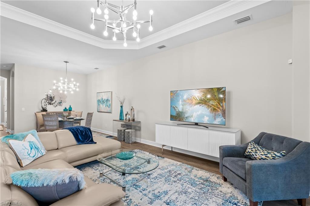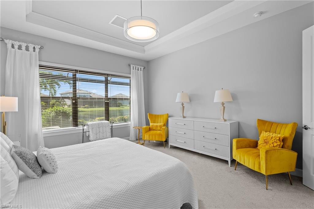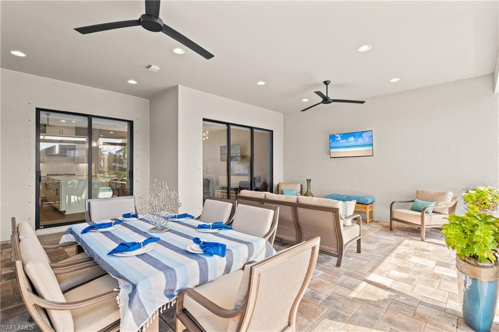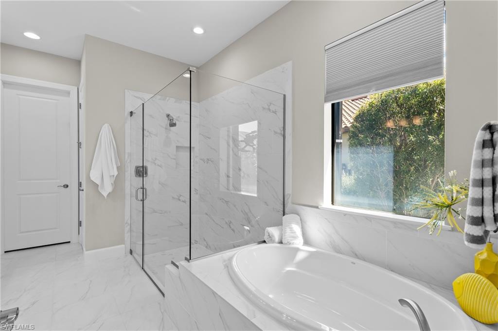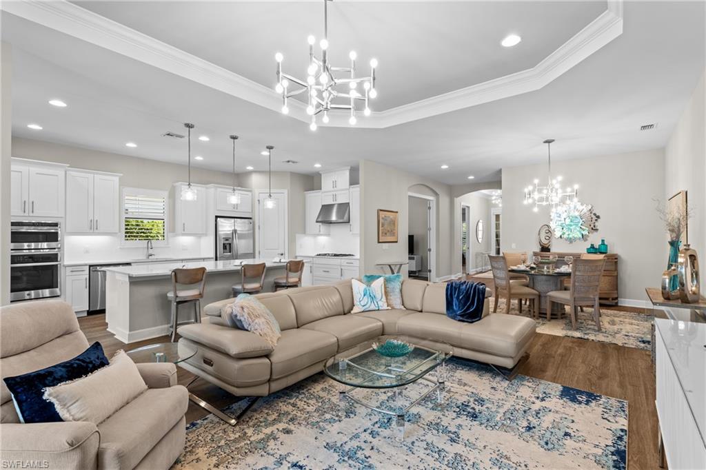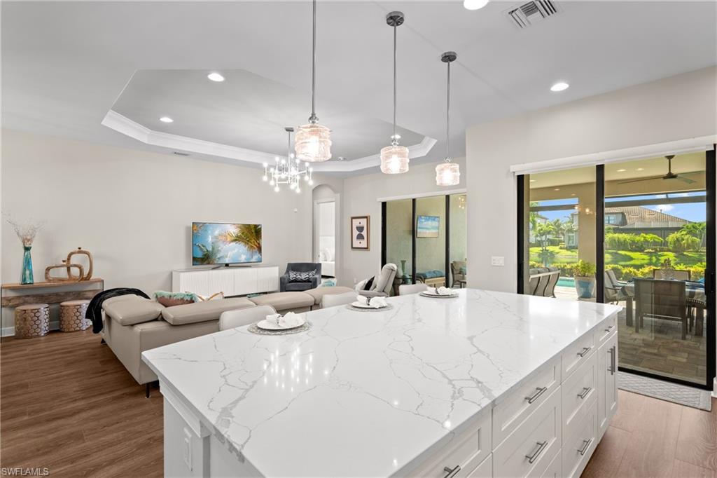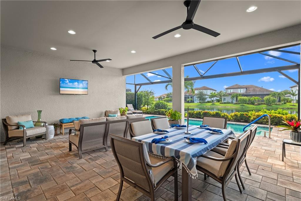 LIVE A VACATION LIFESTYLE IN ESPLANADE! FULL GOLF MEMBERSHIP INCLUDED! Built in 2019, this “Lazio” model offers a perfect mix of luxury, comfort, and relaxation with its lakefront setting and SOUTHERN rear exposure, which make this home light and bright. The layout, with 3 bedrooms, a den, and 3 full bathrooms has been upgraded with high-end features like the GE appliance package (including GAS cooktop, wall oven, and built-in wall convection microwave), beautiful quartz countertops throughout the kitchen & baths, luxury laminate floors throughout the common areas & den, upgraded sculpted carpet in the bedrooms, and more. The spacious open great room flows out to an extended covered lanai through two sets of sliding glass doors, with dedicated outdoor living and dining areas (pre plumbed for an outdoor kitchen with gas, water, and electric)—ideal for entertaining. The GAS and SOLAR heated saltwater pool with two water features and picture window screen cage framing wide and long lake views, making this space both relaxing and ideal for social gatherings. The primary suite offers a spacious bedroom with three windows overlooking pool & lake, luxurious bath with soaking tub and walk-in shower with frameless glass shower enclosure, and large walk-in closet. There are also many added features such as a WHOLE HOUSE GENERATOR, ELECTRIC MOTORIZED ROLL DOWN HURRICANE SCREENS ON THE LANAI, roll down and accordion style hurricane shutters on all windows, three tray ceilings, enhanced landscaping, upgraded Voss bathroom/shower fixtures, and more! The EXTENDED AIR CONDITIONED GARAGE (24’X20’) with epoxied floor and the large laundry room with cabinetry only add to the home's convenience. Esplanade Golf & Country Club of North Naples offers a true “Lifestyle Community” with world-class amenities, including a resort pool with cabanas and the popular “Bahama Bar,” tennis, pickleball, bocce, a 14-mile network of bike/walking trails, and an 18-hole private golf course. The impressive 15,000 Sq Ft clubhouse features a restaurant, bar, wine-tasting room, wine lockers, and a Starbucks-style café. Best of all, the property’s landscaping, irrigation, golf membership, and all community amenities are covered under a quarterly fee of just $3,412—no additional fees or memberships required! Don't miss your opportunity to own this exceptional home in one of Naples’ most sought-after communities. Schedule your tour of this stunning home and Esplanade Golf & Country Club today!