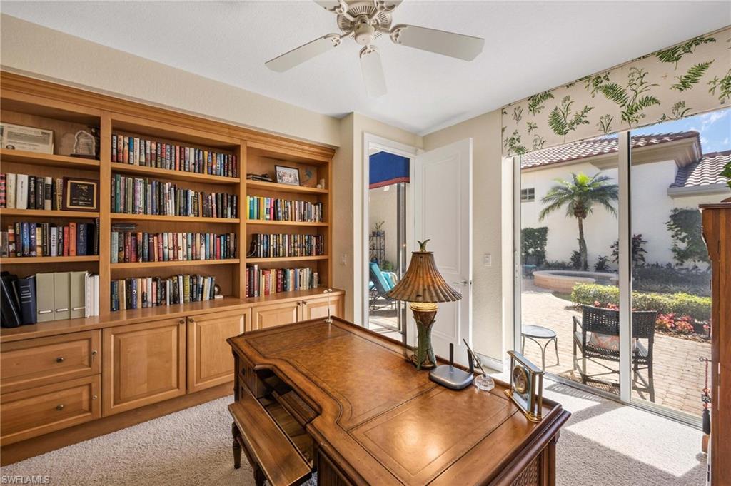 Welcome to 1268 Grand Isle Court, an elegant courtyard residence in the sought-after enclave of Grand Isle in Pelican Marsh. This beautifully updated home combines warmth, comfort and privacy in a lush tropical setting. The main house has a large master bedroom with built-in cabinets and drawers, a second good-sized bedroom and an office with built-in bookcases and file drawers. The main house also has two and a half bathrooms. The separate cabana is a one bedroom suite with a full bathroom and kitchenette, perfectly private for extended family or guests. This home has been extensively maintained and upgraded, featuring a new roof and gutters (within 6 years), new A/C system for the guest suite and office, updated guest suite and fresh interior and exterior paint. The HOA also provides exterior painting every 10 years (completed 2024) and drone roof cleaning every six months, ensuring effortless maintenance. Step into your private courtyard oasis, where a sparkling pool and spa are surrounded by vibrant landscaping and a tranquil ambiance. Enjoy east-facing lanai views of the lake and morning sunrises. Residents of Pelican Marsh enjoy exceptional amenities, including tennis, pickleball, bocce ball, an attended fitness center and optional golf membership. Located just minutes from Mercato’s dining, shopping and entertainment, this home offers the perfect balance luxury, privacy and convenience.