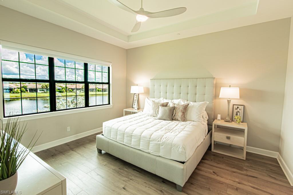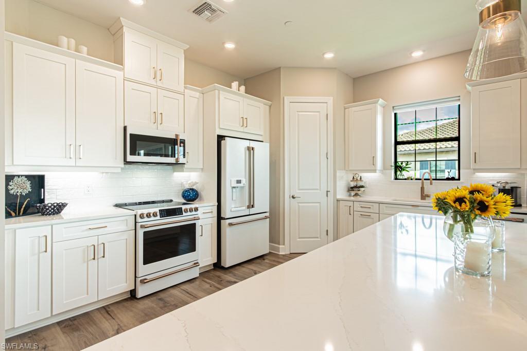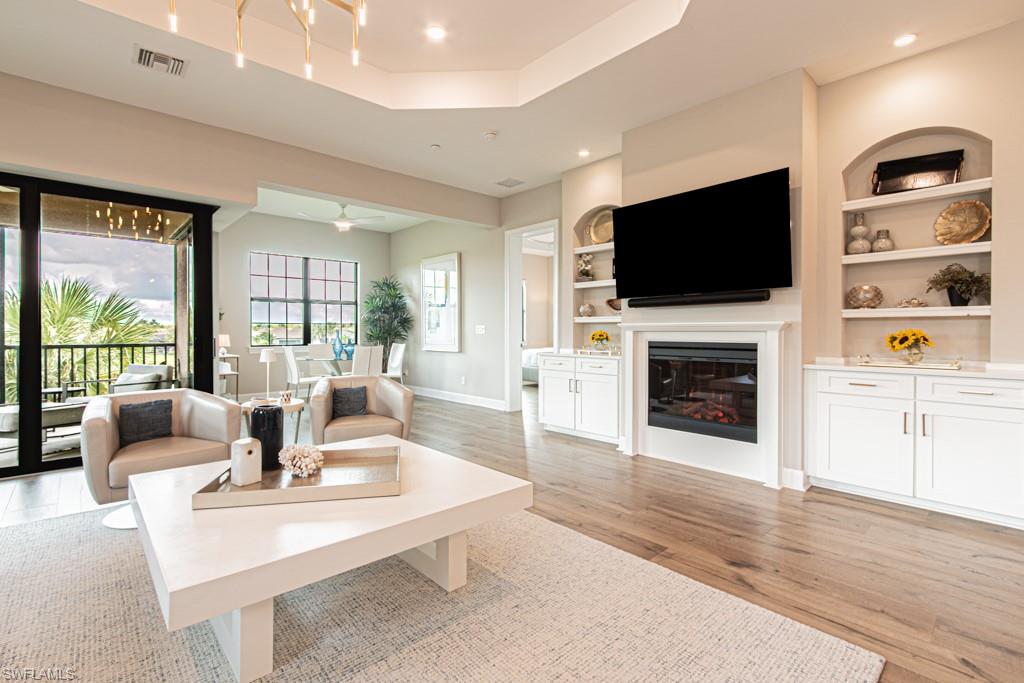 High ceilings, open concept, designer details and a fabulous view welcome you to this better than new 3 bed/ 3 bath corner unit Coach Home in the fabulous Esplanade by the Islands. The property offers high-end builder upgrades, many of which are no longer offered, and an attention to detail and design that make this property unique. The kitchen boasts upgraded white GE Cafe appliances, designer lighting and a spectacular quartz island overlooking a spacious great room with built in cabinets, a fireplace and abundant natural light from windows along the side and back of the home. The lanai is a tropical oasis with palm trees creating privacy, a spectacular lake view and open-corner sliding doors providing a large indoor/outdoor living space. Furniture from Serena and Lily, ScanDesign and Clive Daniels is negotiable. This second floor unit sits above a garage with upgraded heavy duty shelving and a home back up generator. Esplanade By The Islands offers world-class amenities, including a resort style pool, the Bahama Bar, Wellness Center & Day Spa, state-of-the-art fitness center, tennis, pickle ball and bocce courts, a dog park, and scenic walking trails. The Culinary Arts Center will be completed in 2026 and will in include an additional restaurant with a focus on food, wine, and social experiences including wine tastings, spa and wellness events, live concerts, and excursions, all designed to enrich your daily living. Esplanade by the Islands is just minutes from downtown Naples, Marco Island and the beautiful beaches of SW Florida.