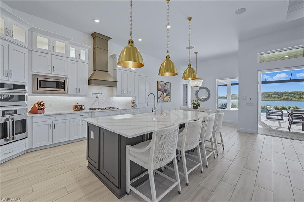 Experience modern luxury and breathtaking wide-water vistas from this magnificent newly built and fully furnished two-story residence in the popular gated community of Esplanade by the Islands. Completed in 2024, this better-than-new masterpiece was designed to capture unobstructed lake views from nearly every room-offering a serene and elegant backdrop for everyday living. Exquisite craftsmanship is evident throughout, with extensive millwork, refined finishes, and upgraded landscaping and lighting that elevate its exceptional curb appeal. Featuring four bedrooms plus a den, four full and two half baths, and a three-car garage, this residence seamlessly combines sophistication, comfort and functionality. Go through impressive impact-rated double doors into an open-concept living space highlighted by tray ceilings, designer chandeliers, transom windows and recessed lighting. The great room showcases a shiplap accent wall, built-in fireplace, and expansive glass sliders that open to the lanai for effortless indoor-outdoor living. The gourmet kitchen is a chef’s dream, complete with white shaker cabinetry, in- and under-cabinet lighting, quartz counters, white subway tile backsplash, dual beverage refrigerators and GE Café stainless appliances, including a natural gas cooktop. A large island with pendant lighting and an adjacent dining area create an inviting space for gatherings. The den, accented with French doors and a shiplap feature wall, offers a private workspace or cozy retreat. The primary suite is a peaceful sanctuary with panoramic pool and lake views, lanai access, dual walk-in closets and a spa-inspired bath featuring a soaking tub, dual quartz vanities and a frameless glass shower. Two main-level guest suites each offer walk-in closets and beautifully appointed en-suite baths, one with pool access. Upstairs, a spacious loft serves as an additional living and entertainment area, complete with a sleek wet bar featuring quartz counters, GE stainless appliances (mini refrigerator, dishwasher, microwave and sink), and an adjacent powder bath. A private guest bedroom with en-suite bath completes this level, providing a comfortable retreat with stunning lake views. The outdoor living area is an entertainer’s dream. Enjoy a panoramic screen enclosure, paver-tiled lanai, and a covered seating area with tongue-and-groove ceiling, recessed lighting, and a full outdoor kitchen complete with quartz counters and backsplash, grill, double-drawer refrigerator and island seating. Additional highlights include a wide brick-paver driveway, impact-resistant doors and windows, a tankless natural gas water heater, three Lennox air handlers, and a climate-controlled three-car garage with epoxy flooring, natural light and an air-conditioning mini split. Residents enjoy resort-style amenities, including a pool and spa, fitness center, pickleball and tennis courts, salon and spa services, and poolside dining at The Bahama Bar, with Culinary Center coming soon.