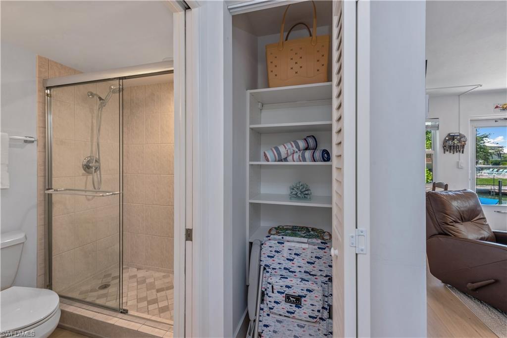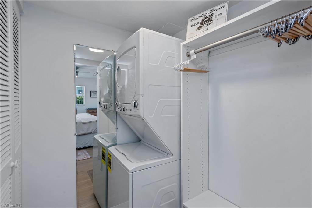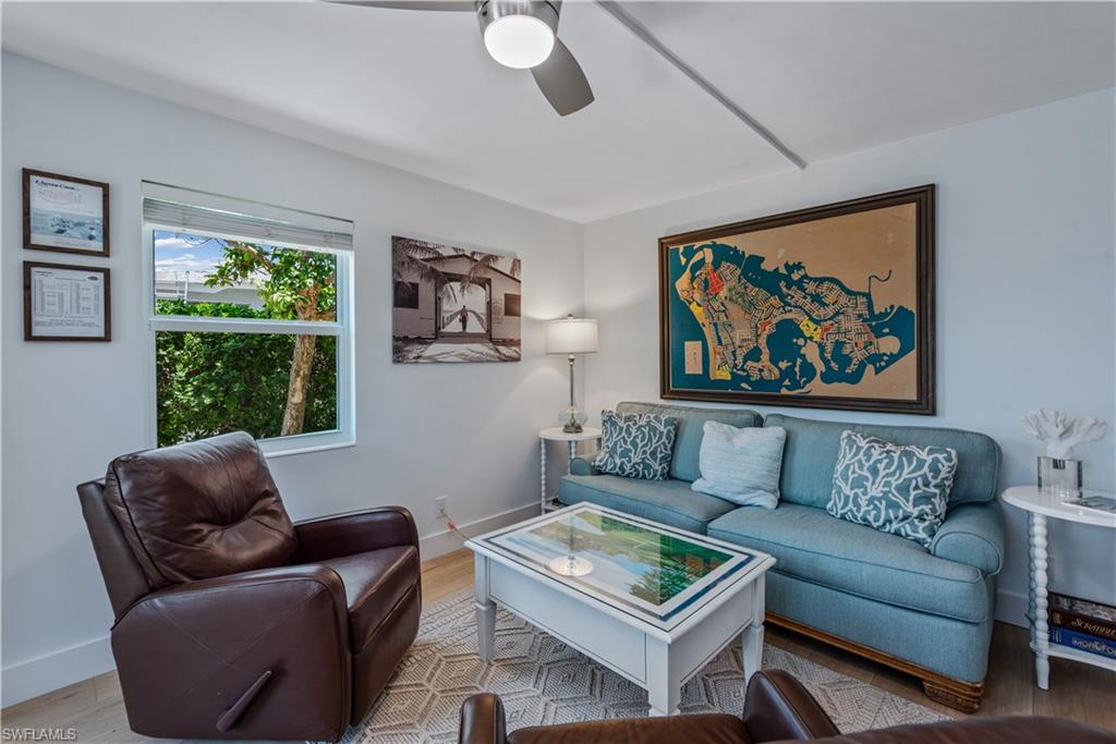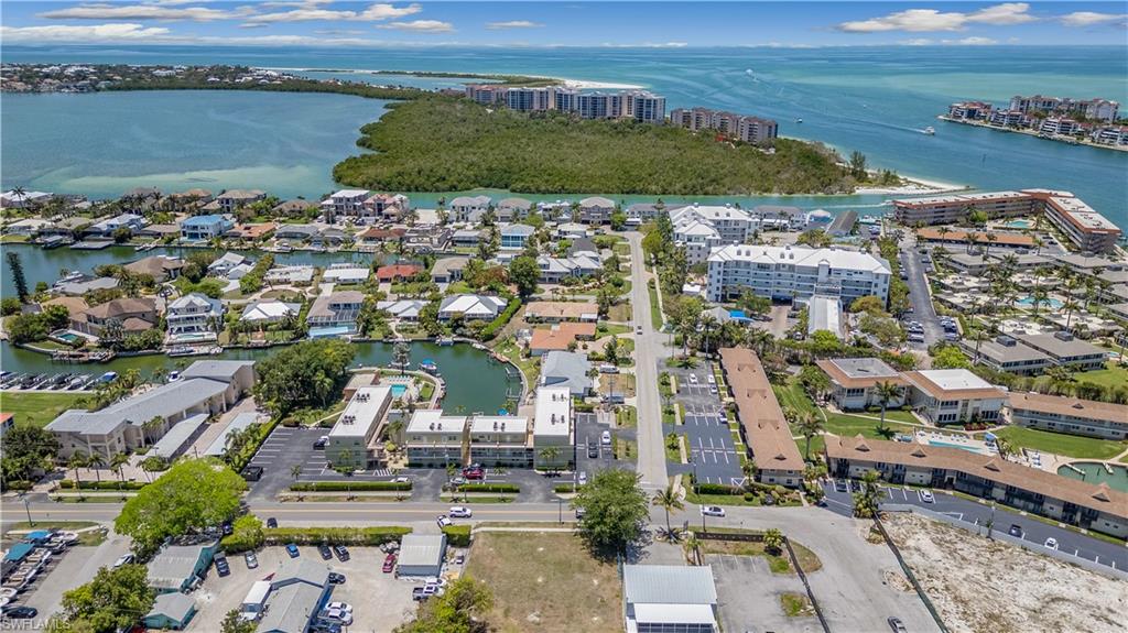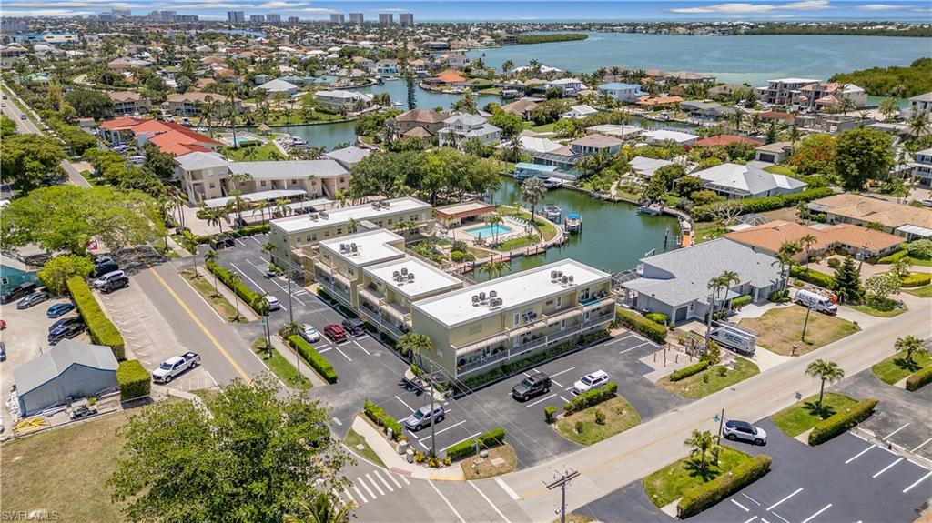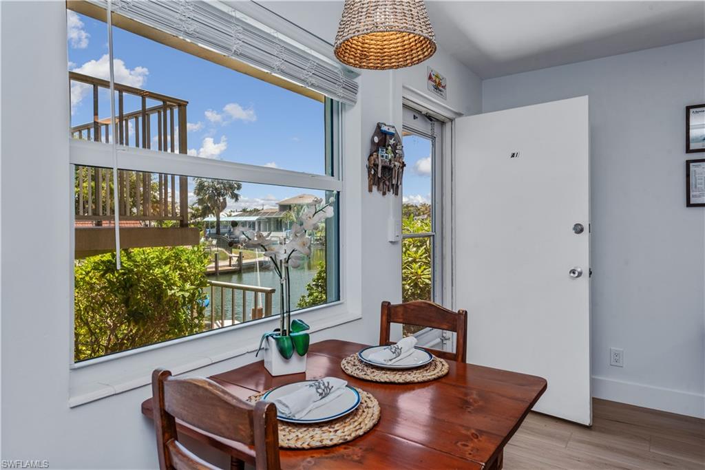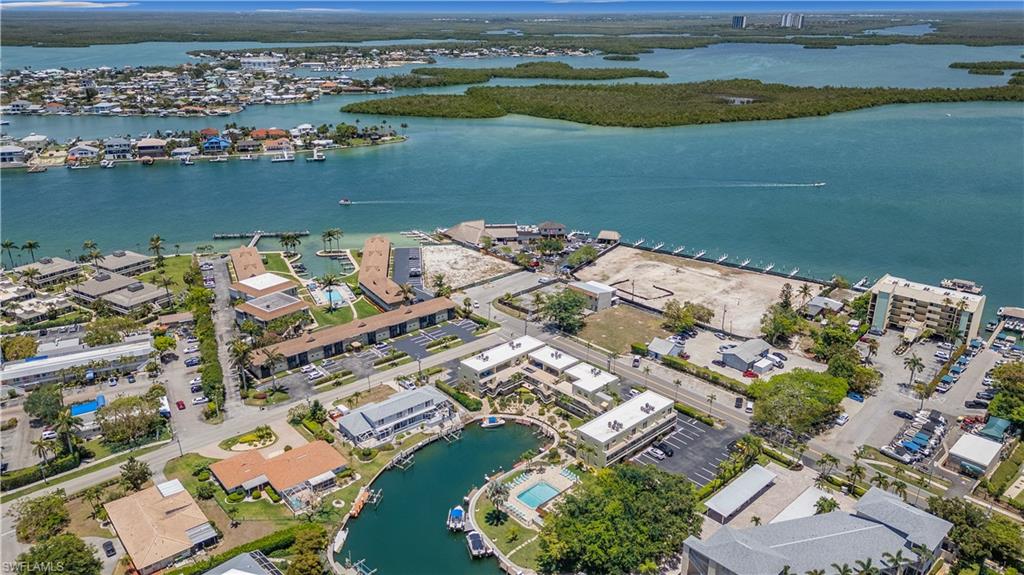 Paradise is calling in Olde Marco with this 1st floor corner waterfront unit that's ready to enjoy this season. Situated on a direct access canal with common docks watch birds, dolphins and manatees right outside your doorstep. Inside offers a relaxed feeling of a time gone by with a coastal style kitchen, vinyl flooring, spacious living room that is set up for conversation with a queen size sleeper sofa and two luxury leather recliners and new TV. An antique bistro set awaits by the window for casual dining with a water view. The bedroom features a brand-new king bed and mattress and new TV. Outfitted and tailored with all the kitchen amenities of home, laundry in unit and custom closet systems and impact windows. The bathroom offers plenty of storage, large counterspace, walk in shower and hallway closet with built-ins. Storage locker on site, assigned parking space right outside unit, flexible 3-night minimum rental policy year-round. You'll find all the amenities and evoke feelings of a slower pace of life with Model Village being a low density only 30 units and owners are invited to enjoy the large community pool and deck space, BBQ grill and watercolor sunsets nightly. Located in the charming Historic District of Olde Marco where the history dates back to 500 A.D when Calusa Indians once called this area home; within just half a mile you'll find 8 unique restaurants (Snook Inn, The Boardroom Smith House Bakery, LeeBeFish, and more, shopping, marina excursions, bike, boat and golf cart rentals.