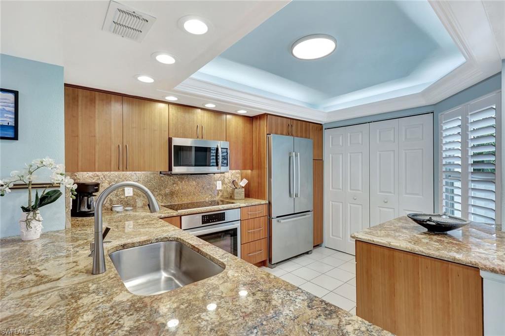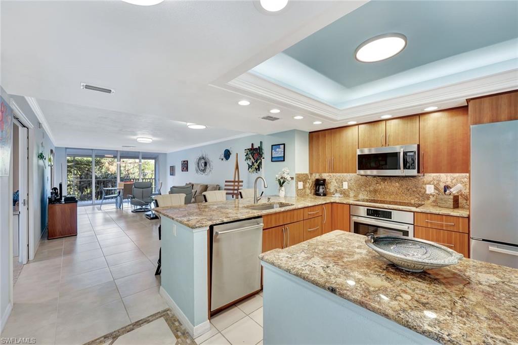 Discover island living at its finest in this rarely available 3-bedroom end-unit condo in the desirable gated community of Stevens Landing. This owner-occupied home has been meticulously maintained and thoughtfully updated throughout. The modern kitchen features custom cabinetry, granite countertops, tray ceiling, recessed lighting, pantry, and a breakfast bar that opens seamlessly to the dining and living areas. The open-concept layout is accented with crown molding and a light, coastal-modern vibe, creating a welcoming and airy feel. The split floor plan offers privacy for all three bedrooms, with both bathrooms beautifully updated. The spacious owner's retreat includes a walk-in tiled shower, while the guest bath features a tiled tub/shower combination with convenient access for both guest bedrooms. Enjoy the community's exceptional amenities, including a heated pool and spa, tennis and pickleball courts, boat docks available upon request (currently available per dock master), and rare dry boat storage when available. Residents may also join the exclusive Marco Island Residents' Beach for only $200 per year, offering beach access, parking, a restaurant, BBQ area, playground, and tiki huts. Experience the best of coastal living in this lovely, move-in-ready condo!